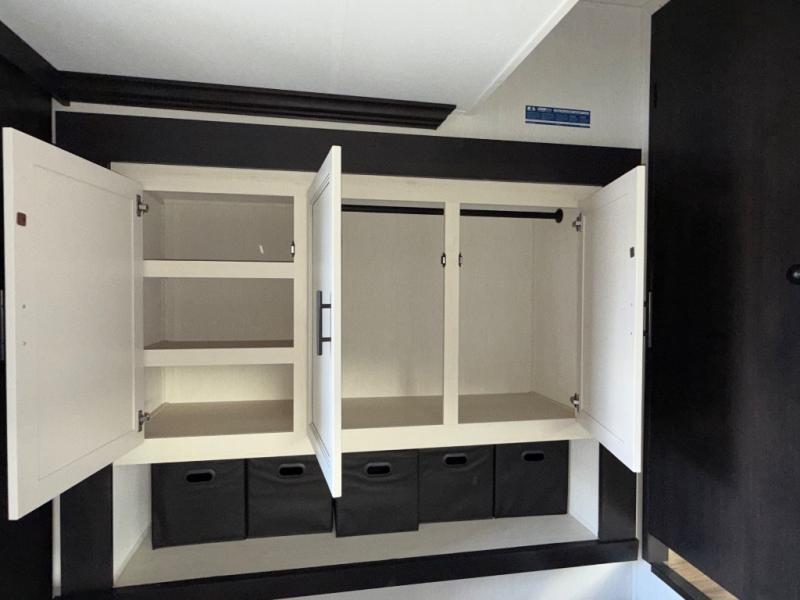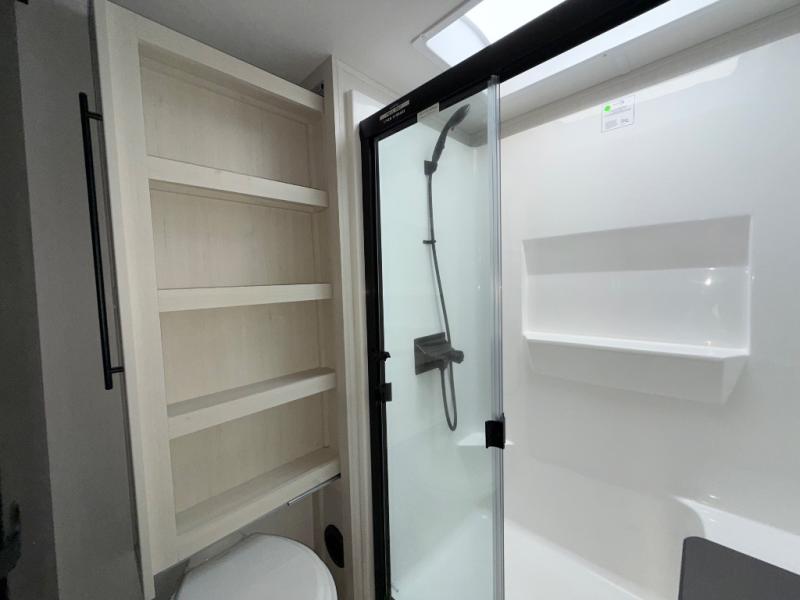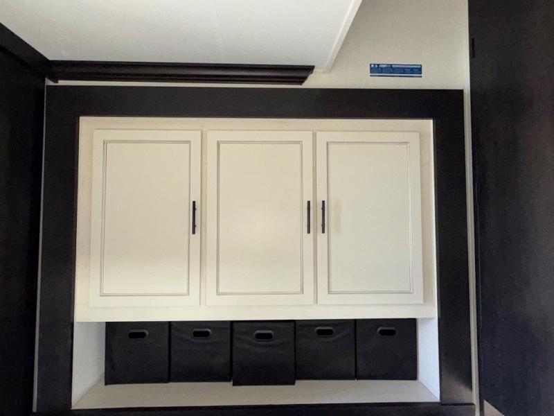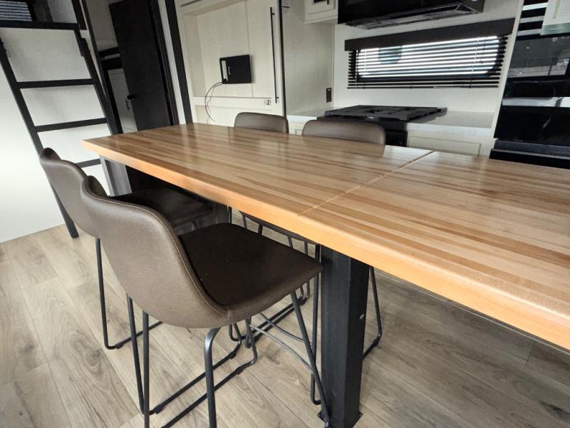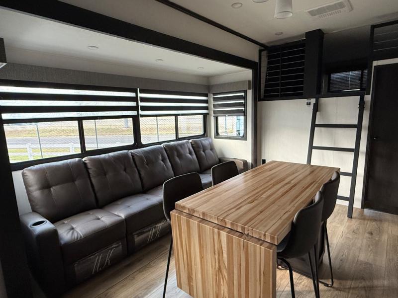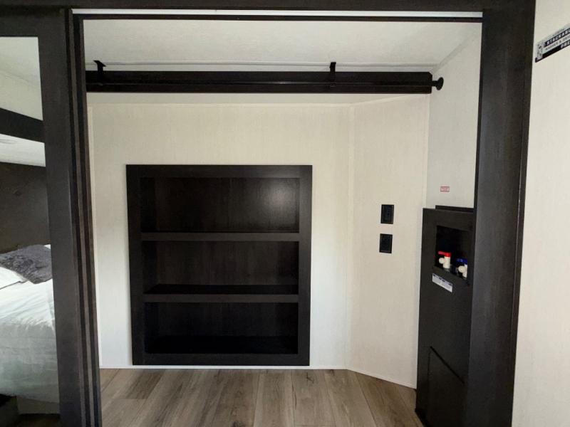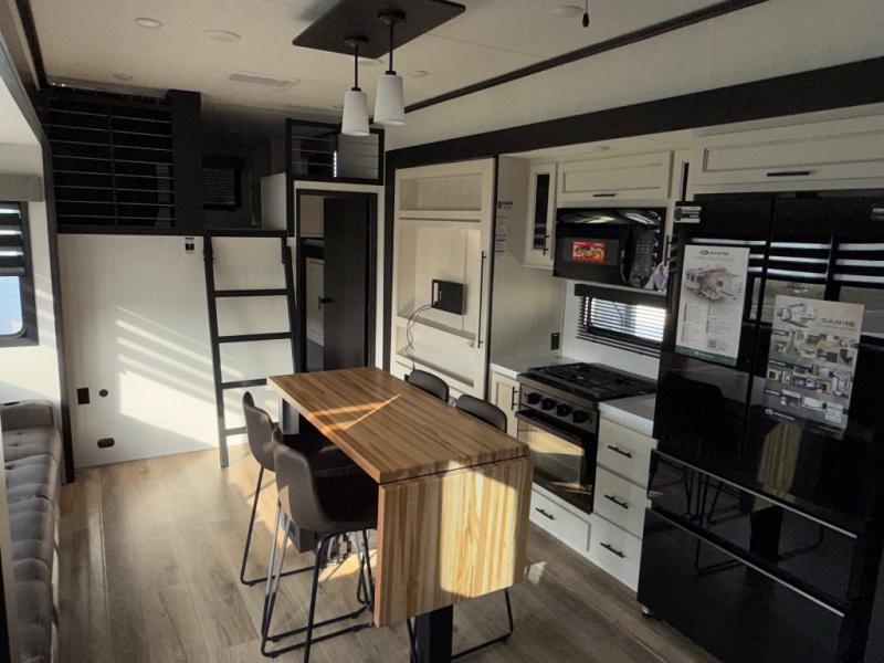 Are you looking for a fifth wheel where you can bring along your neighbor friends? You can do just that since there are two bedrooms in this unit, one of which includes a master bath with its own exterior entry door! The front bedroom is right next to the second full bath for convenience, and includes a camper king bed slide, a dresser, and front wardrobe. The rear master bedroom has a queen bed slide out across from a second slide for more floor space, and there is a loft above this room for more sleeping or storage space. Everyone can meet in the middle kitchen and living room since there are recliners, a ceiling fan, and kitchen island with four chairs. There is also storage below the island for kitchen necessities, and the hidden pantry behind the TV will be perfect for snacks, board games and more!
