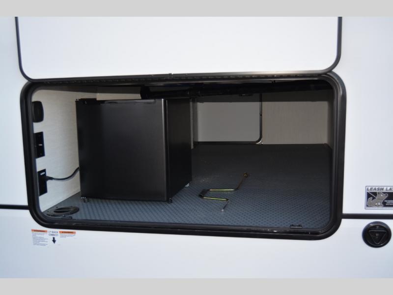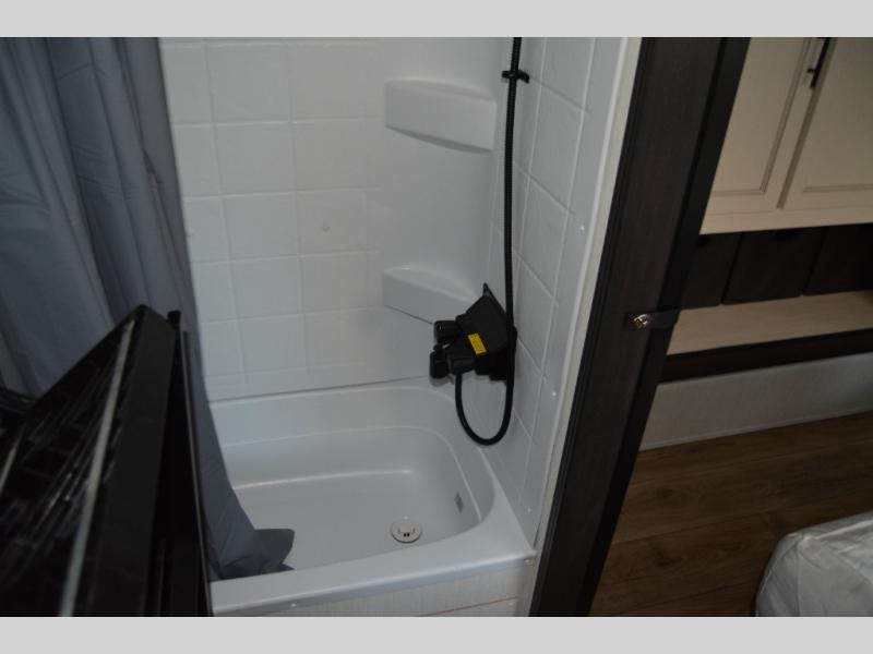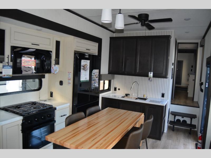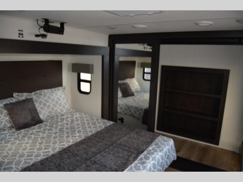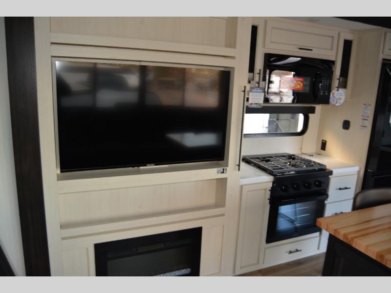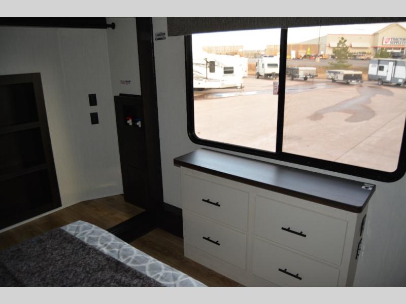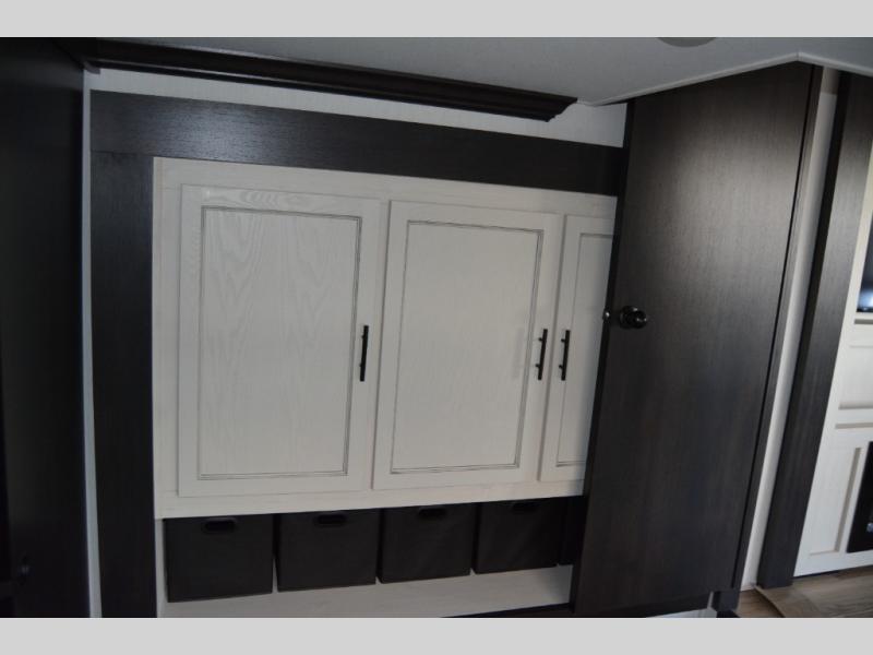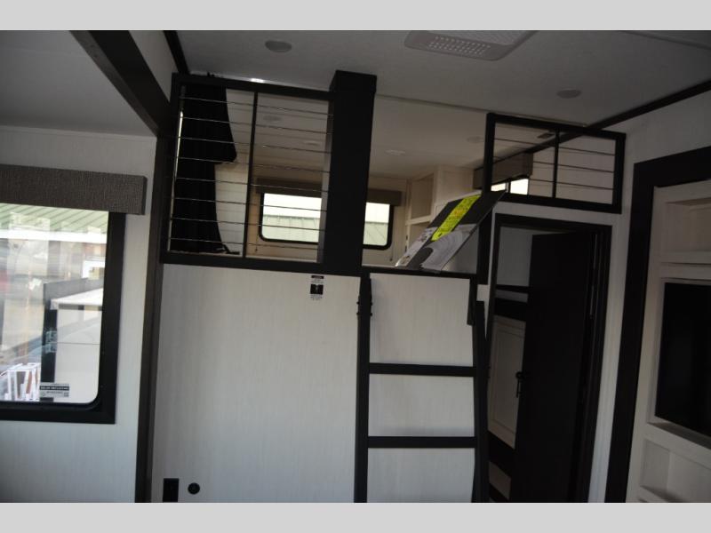 Are you looking for a fifth wheel where you can bring along your neighbor friends? You can do just that since there are two bedrooms in this unit, one of which includes a master bath with its own exterior entry door! The front bedroom is right next to the second full bath for convenience, and includes a camper king bed slide, a dresser, and front wardrobe. The rear master bedroom has a queen bed slide out across from a second slide for more floor space, and there is a loft above this room for more sleeping or storage space. Everyone can meet in the middle kitchen and living room since there are recliners, a ceiling fan, and kitchen island with four chairs. There is also storage below the island for kitchen necessities, and the hidden pantry behind the TV will be perfect for snacks, board games and more!