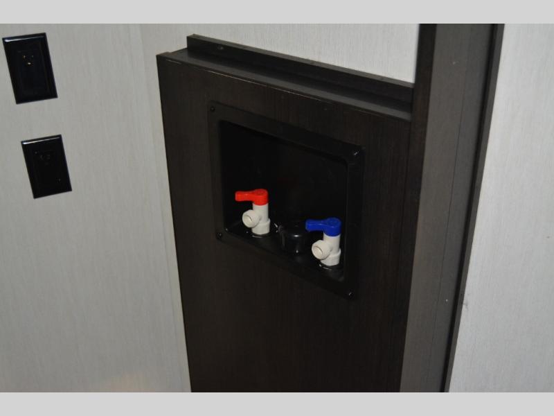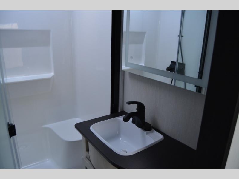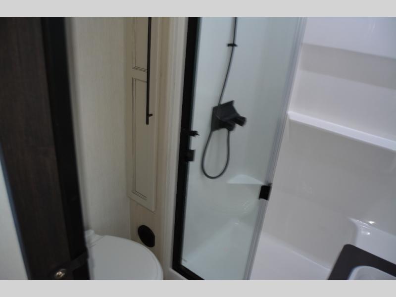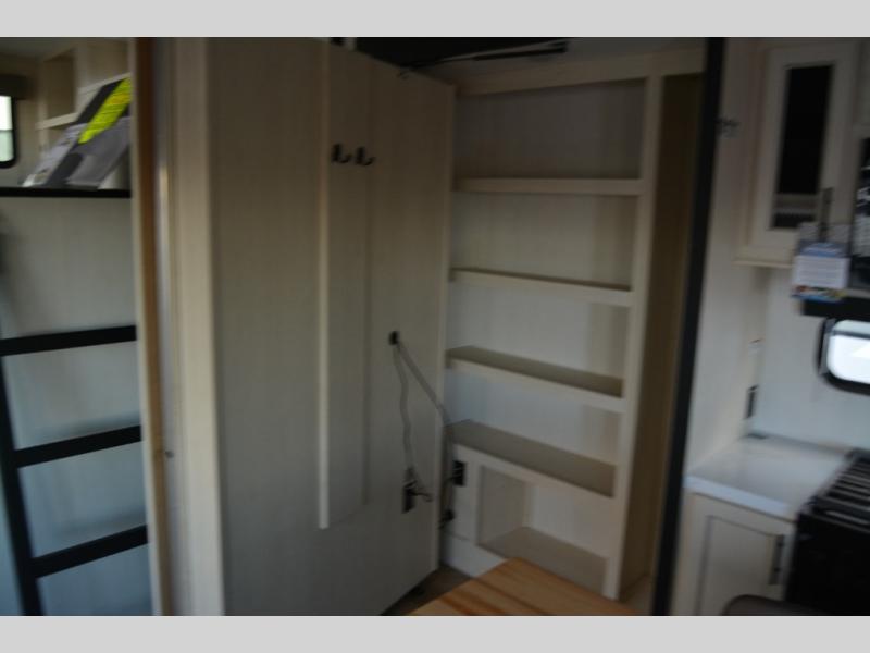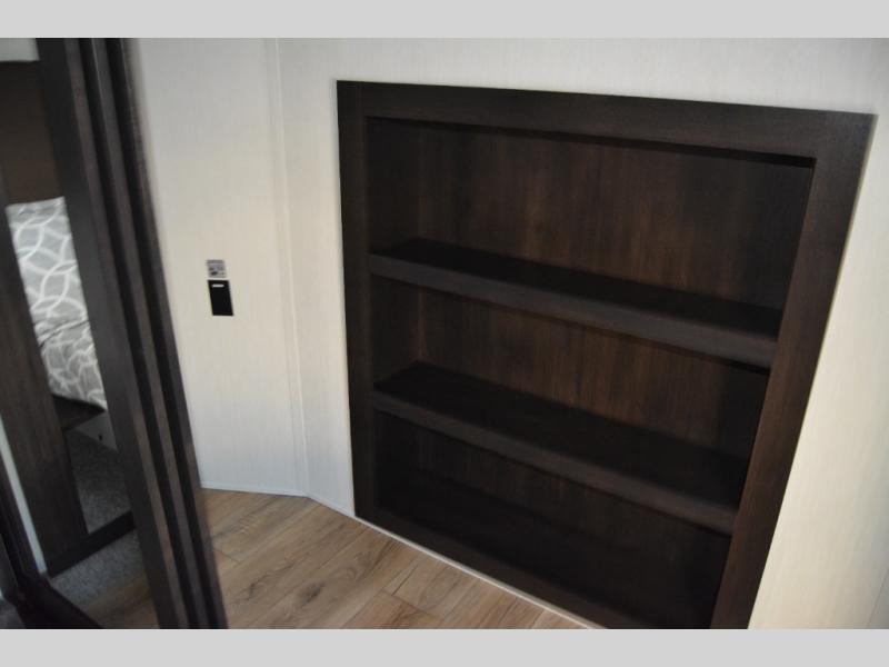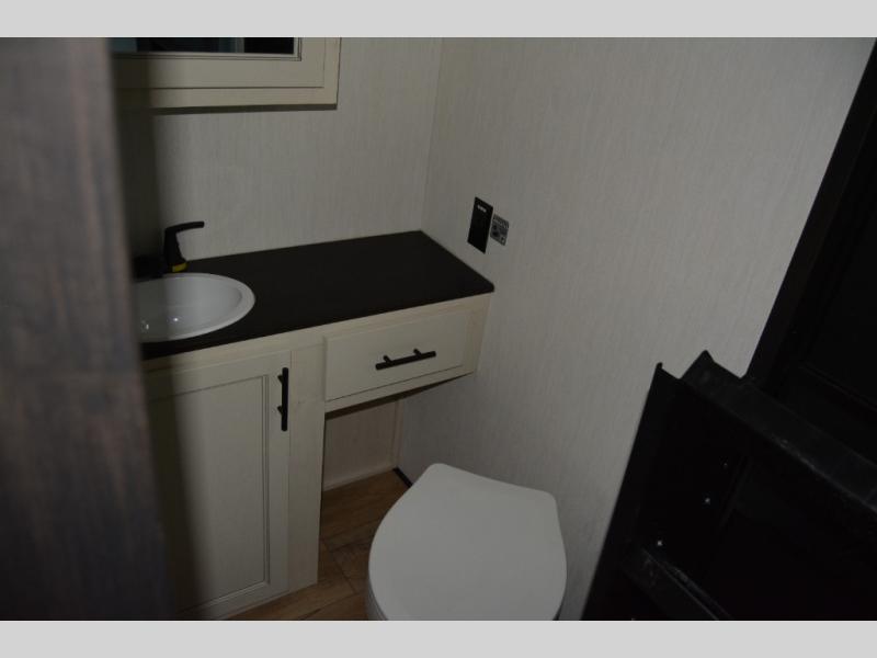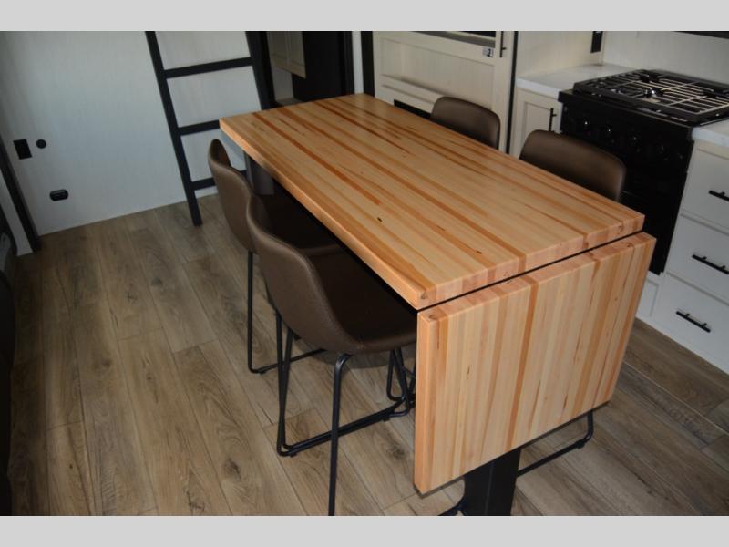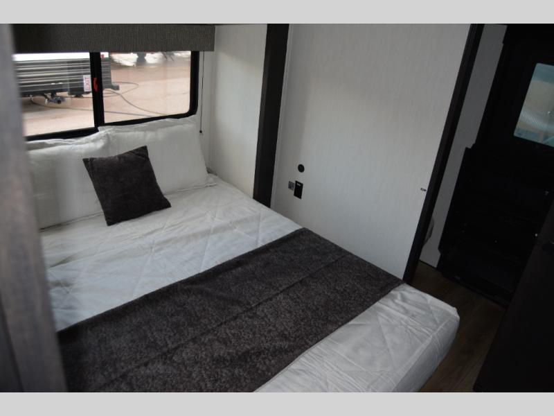 Are you looking for a fifth wheel where you can bring along your neighbor friends? You can do just that since there are two bedrooms in this unit, one of which includes a master bath with its own exterior entry door! The front bedroom is right next to the second full bath for convenience, and includes a camper king bed slide, a dresser, and front wardrobe. The rear master bedroom has a queen bed slide out across from a second slide for more floor space, and there is a loft above this room for more sleeping or storage space. Everyone can meet in the middle kitchen and living room since there are recliners, a ceiling fan, and kitchen island with four chairs. There is also storage below the island for kitchen necessities, and the hidden pantry behind the TV will be perfect for snacks, board games and more!