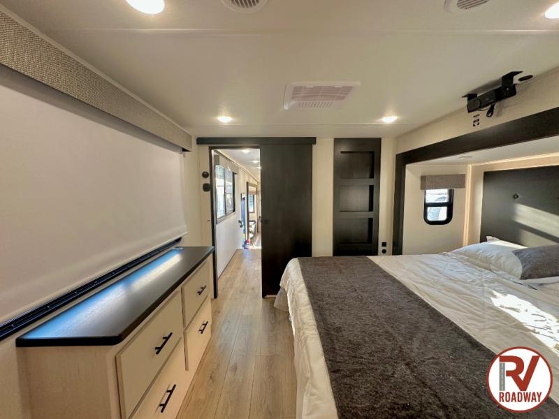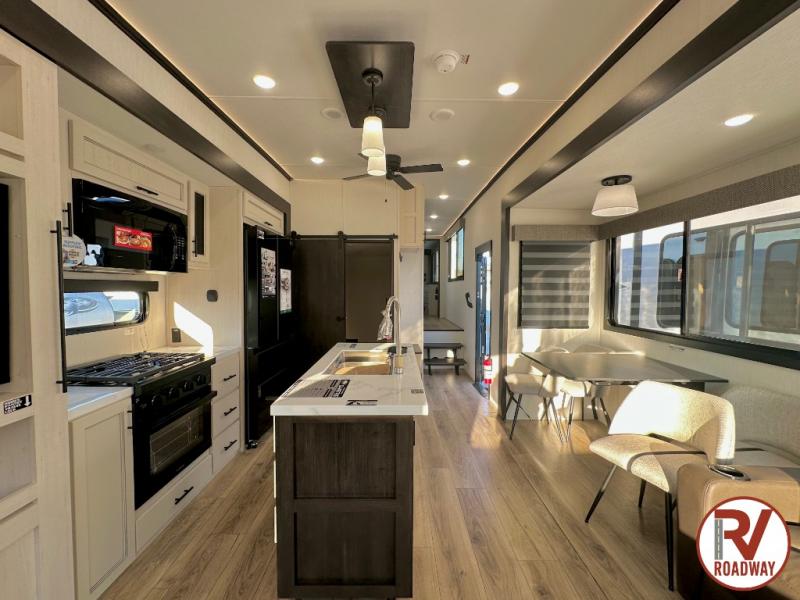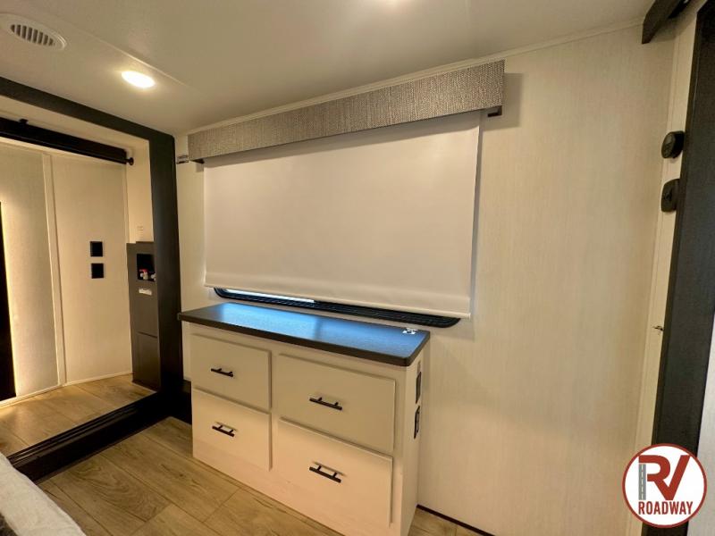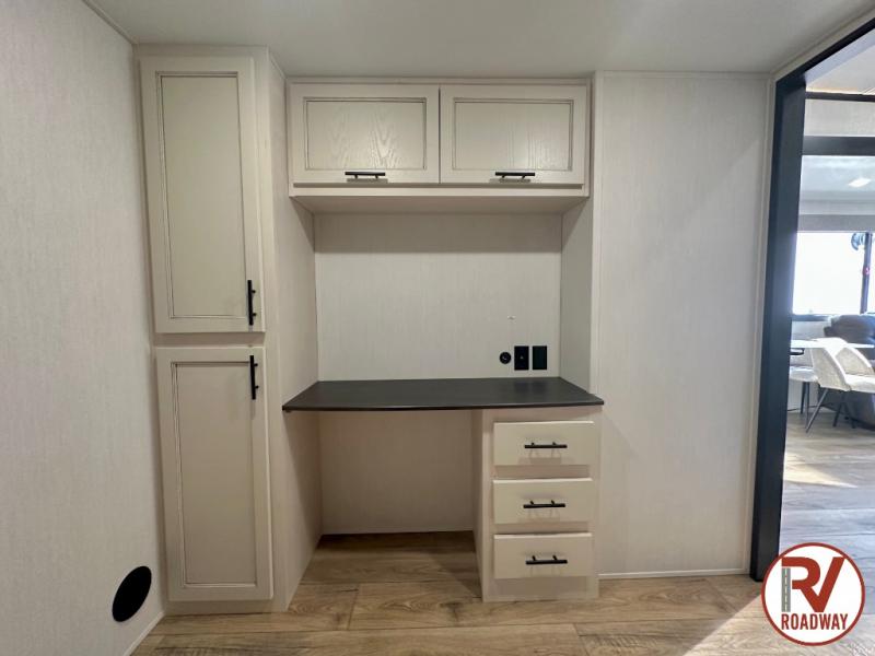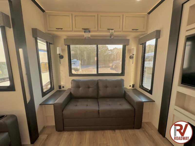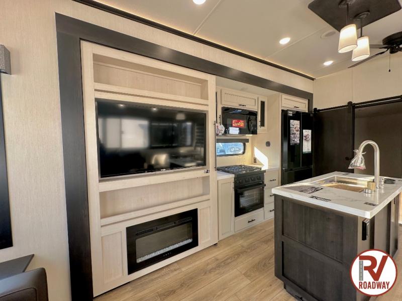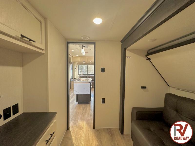 There is much to love in this fifth wheel! Starting with the second bedroom which has a slide that houses a flip-up bunk above a tri-fold sofa across from a desk with drawers, a drop zone, and a wardrobe, plus above all of that is a storage/bunk loft. The rear living area includes a tri-fold sofa, a TV with a hidden pantry behind, and theater seating for two making this space another area at night for guests. In the morning, you can prepare breakfast on the kitchen island, then dine together at the versatile dinette/desk. The full bath will allow you to stay clean throughout your trip, and you'll feel right at home in the front private bedroom with a camper king bed, a dresser, and front wardrobe. Outside, a kitchen and two power awnings create an inviting space!