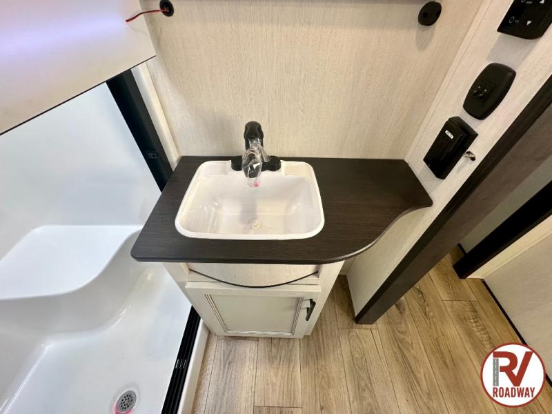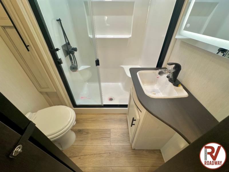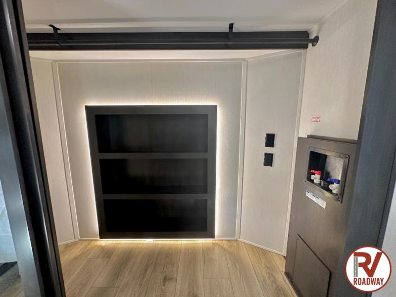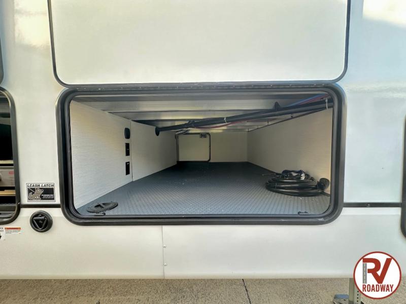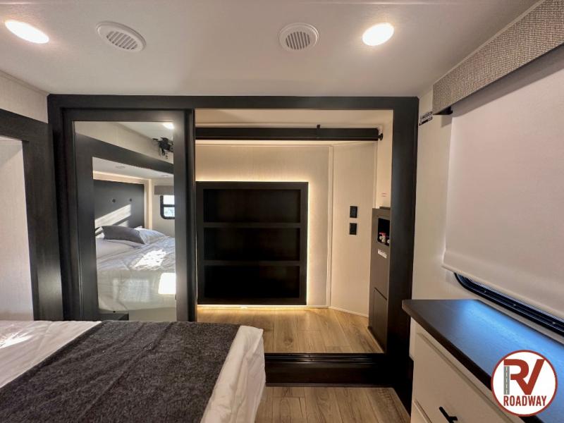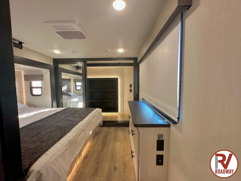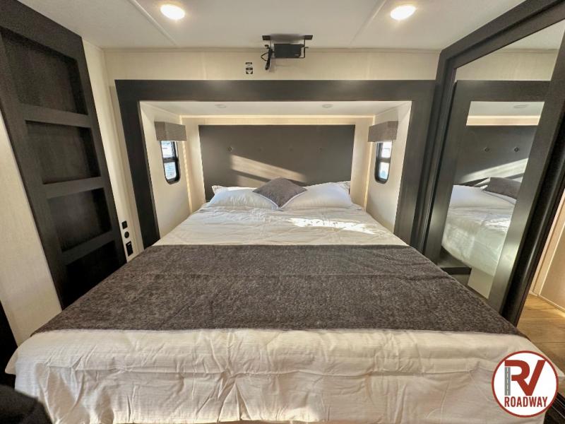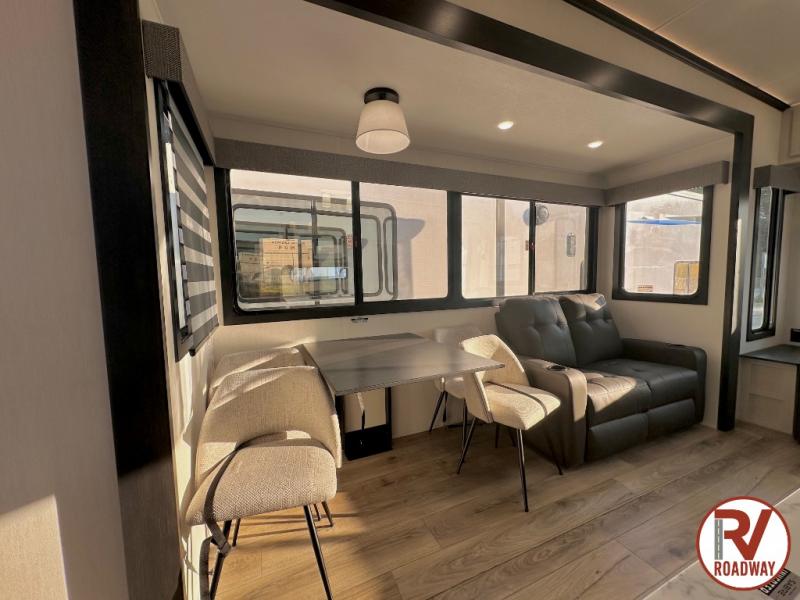 There is much to love in this fifth wheel! Starting with the second bedroom which has a slide that houses a flip-up bunk above a tri-fold sofa across from a desk with drawers, a drop zone, and a wardrobe, plus above all of that is a storage/bunk loft. The rear living area includes a tri-fold sofa, a TV with a hidden pantry behind, and theater seating for two making this space another area at night for guests. In the morning, you can prepare breakfast on the kitchen island, then dine together at the versatile dinette/desk. The full bath will allow you to stay clean throughout your trip, and you'll feel right at home in the front private bedroom with a camper king bed, a dresser, and front wardrobe. Outside, a kitchen and two power awnings create an inviting space!