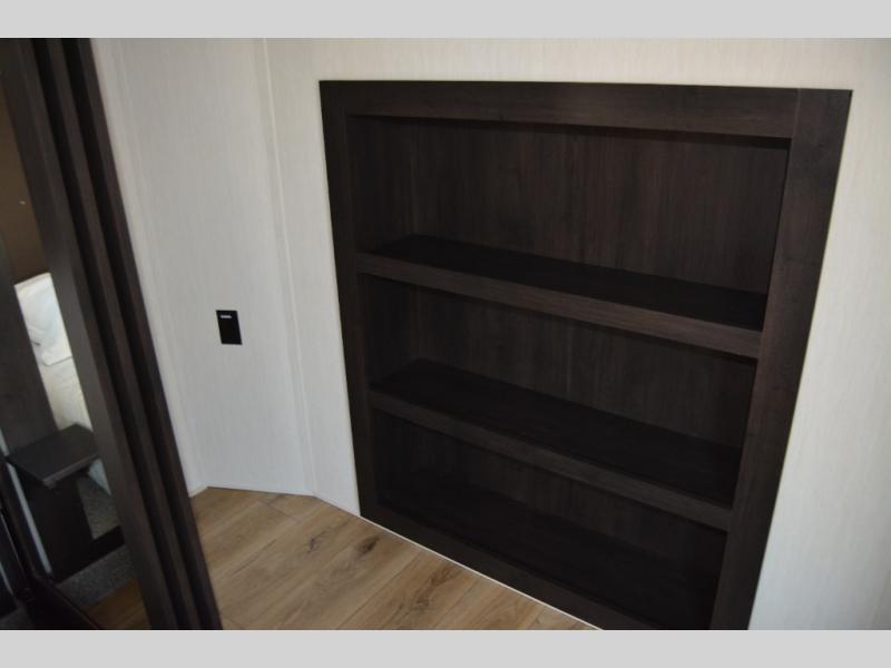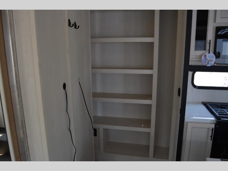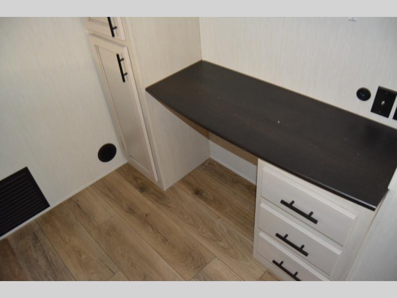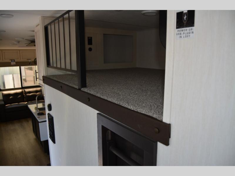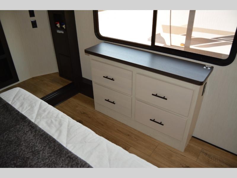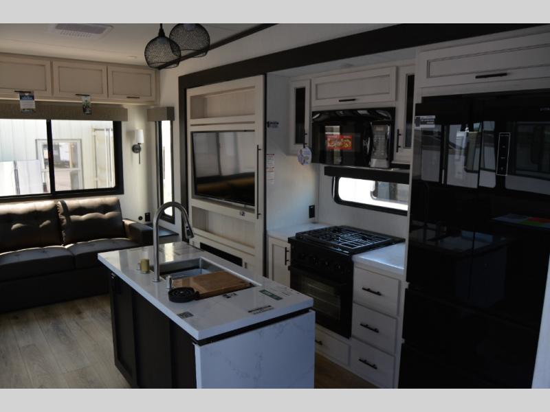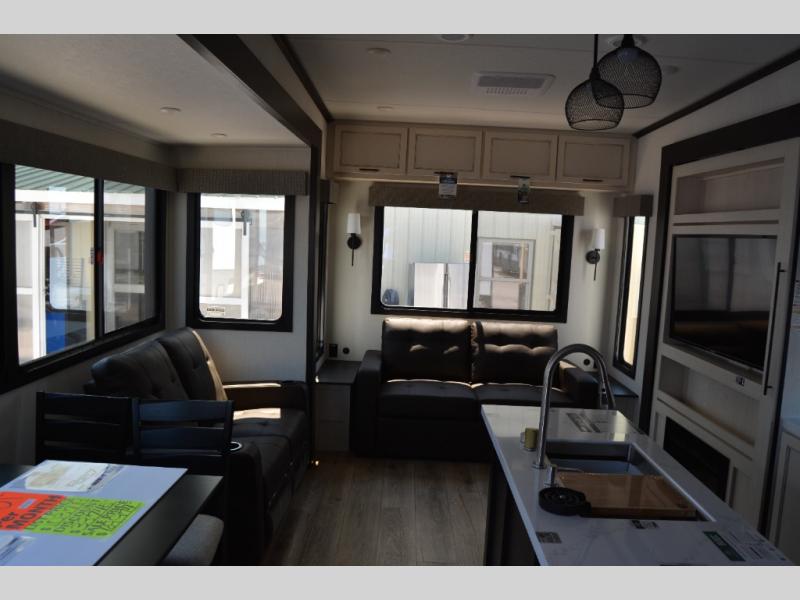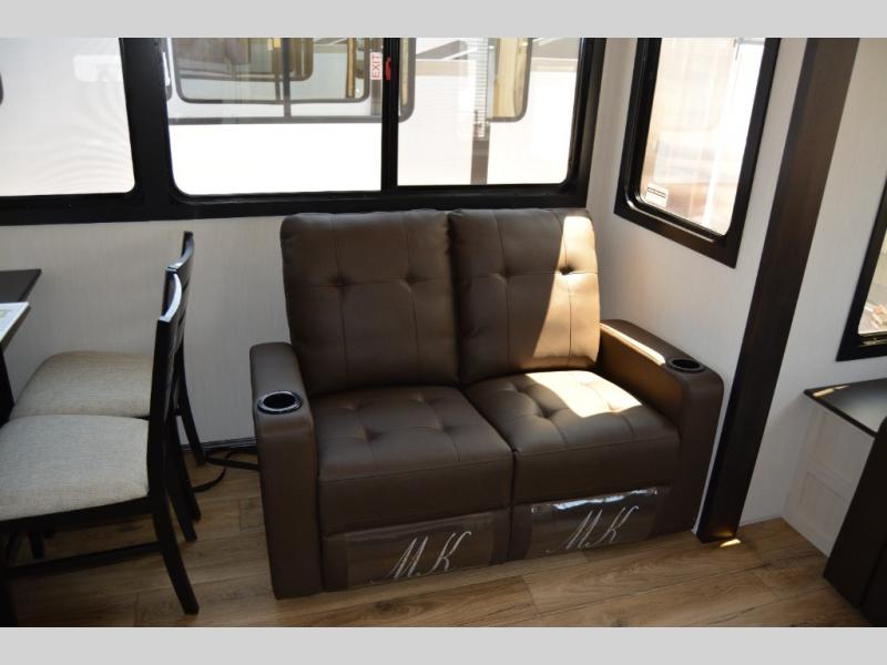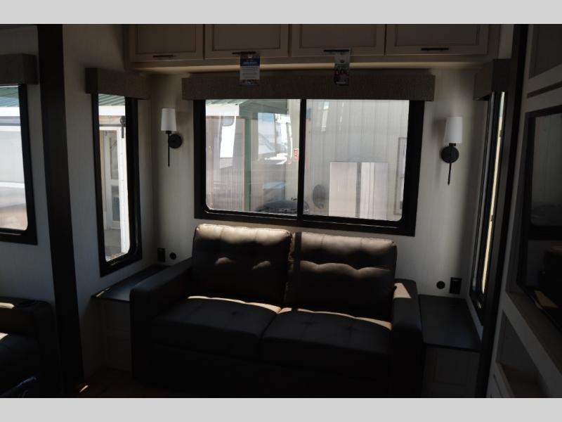 There is much to love in this fifth wheel! Starting with the second bedroom which has a slide that houses a flip-up bunk above a tri-fold sofa across from a desk with drawers, a drop zone, and a wardrobe, plus above all of that is a storage/bunk loft. The rear living area includes a tri-fold sofa, a TV with a hidden pantry behind, and theater seating for two making this space another area at night for guests. In the morning, you can prepare breakfast on the kitchen island, then dine together at the versatile dinette/desk. The full bath will allow you to stay clean throughout your trip, and you'll feel right at home in the front private bedroom with a camper king bed, a dresser, and front wardrobe. Outside, a kitchen and two power awnings create an inviting space!