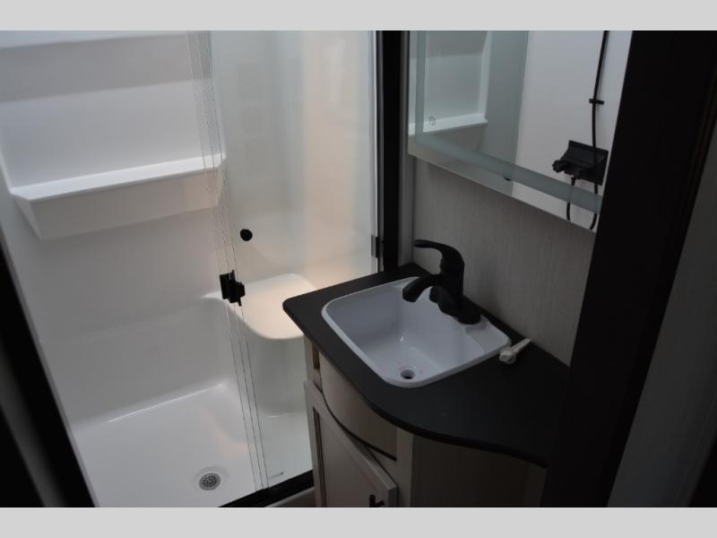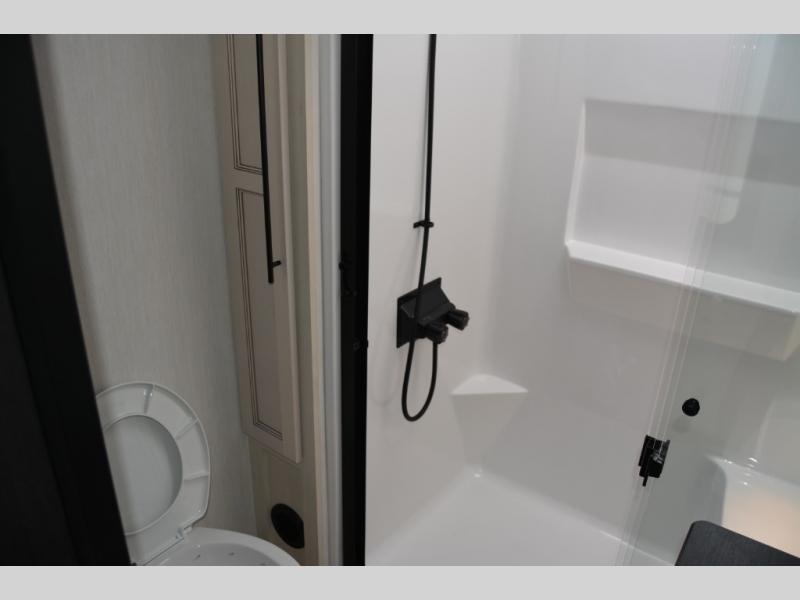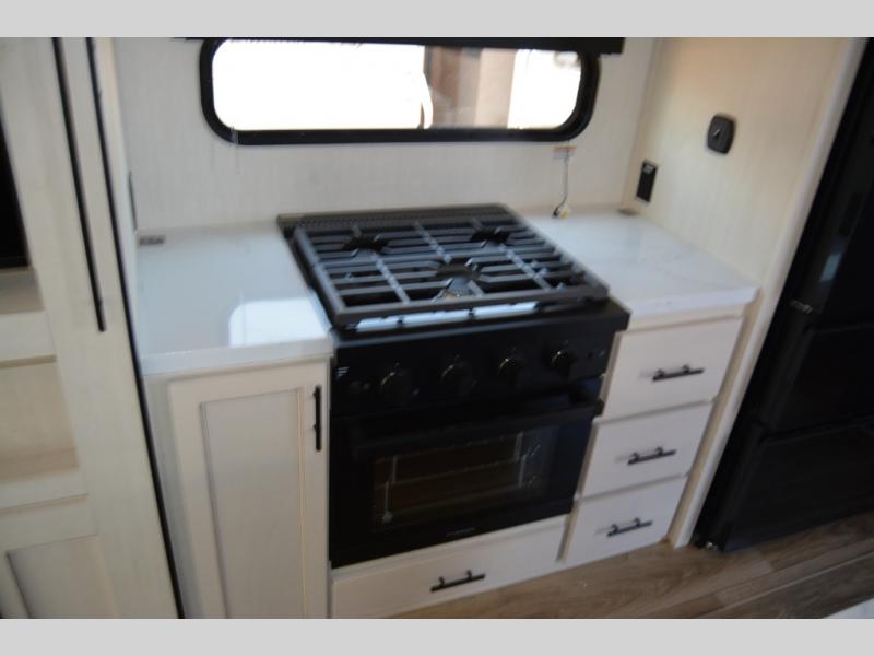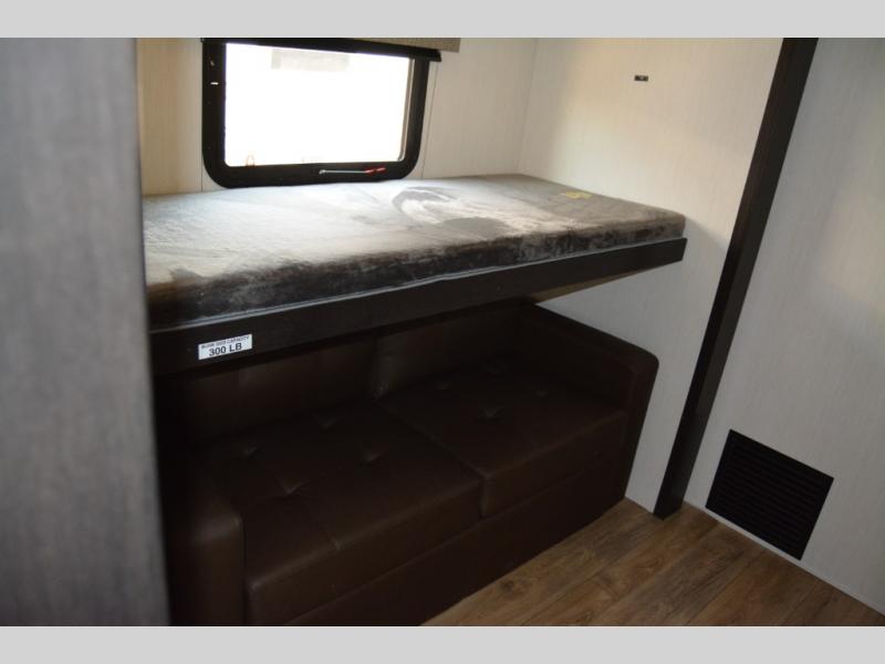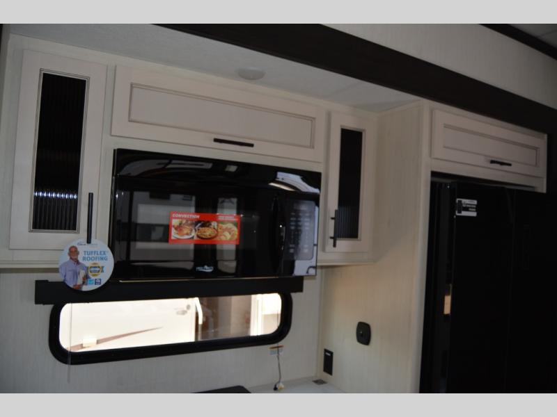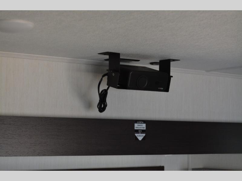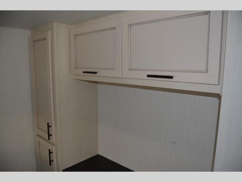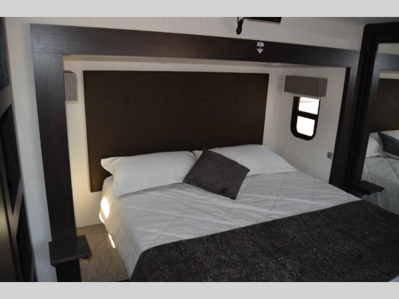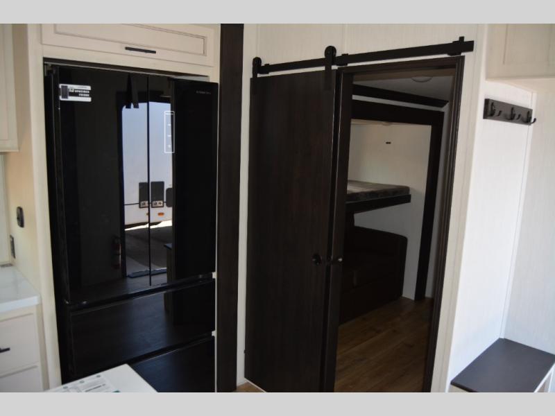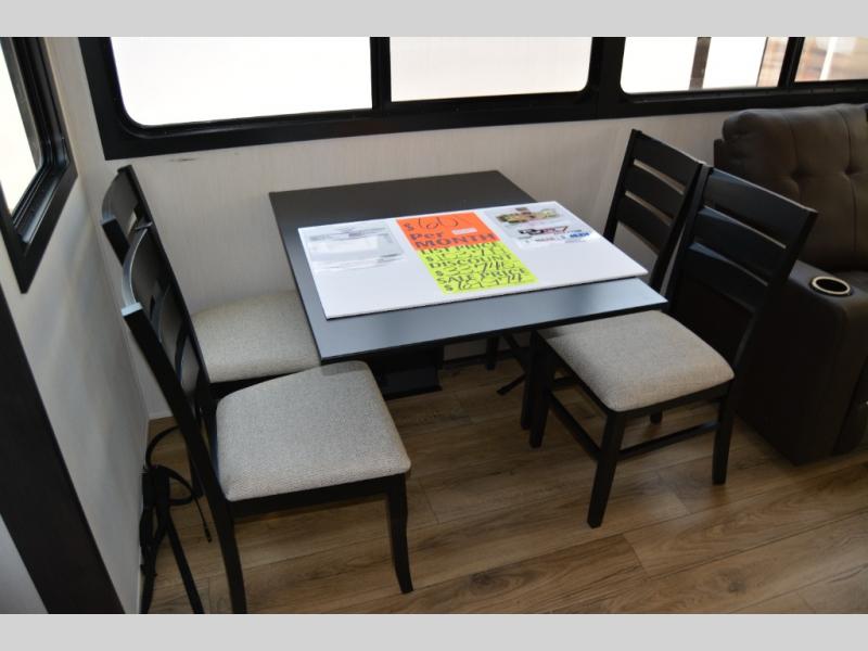 There is much to love in this fifth wheel! Starting with the second bedroom which has a slide that houses a flip-up bunk above a tri-fold sofa across from a desk with drawers, a drop zone, and a wardrobe, plus above all of that is a storage/bunk loft. The rear living area includes a tri-fold sofa, a TV with a hidden pantry behind, and theater seating for two making this space another area at night for guests. In the morning, you can prepare breakfast on the kitchen island, then dine together at the versatile dinette/desk. The full bath will allow you to stay clean throughout your trip, and you'll feel right at home in the front private bedroom with a camper king bed, a dresser, and front wardrobe. Outside, a kitchen and two power awnings create an inviting space!