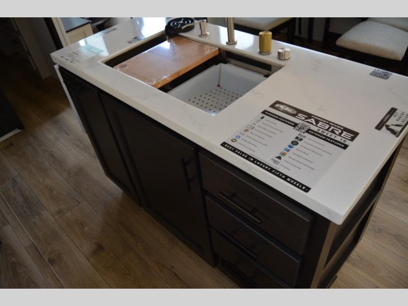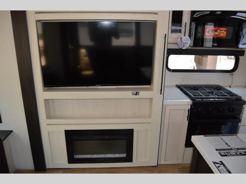 You will experience luxurious camping trips at an affordable price with any one of these Forest River Sabre fifth wheels! These models are durable and ready to travel anytime of the year thanks to features like the high-gloss gel-coat front cap with LED lighting, the PVC roof membrane, and the forced air underbelly with enclosed gate valves. The electric auto-leveling system makes setting up easy and safe, and the adjustable power awning with LED lighting will create an inviting outdoor living space. Each model includes a universal docking station which includes a black tank flush and an outside shower, and adjustable stable steps for you to enter and exit the unit safely. Inside, you will love the design of the ambient accent lighting in the living area, the real wood lumbercore cabinetry, and the linoleum flooring!