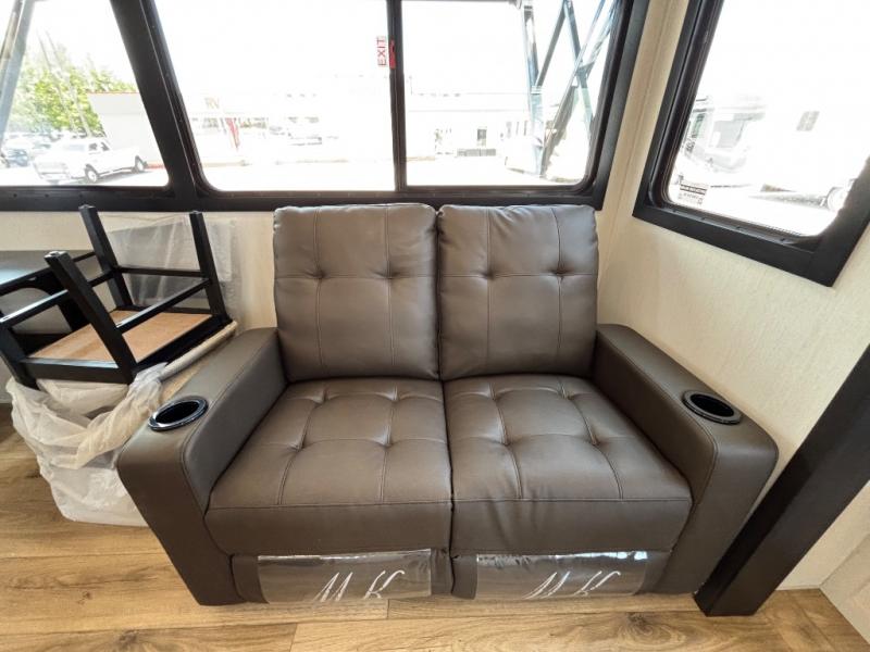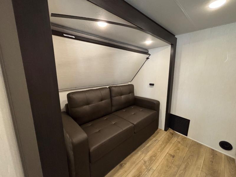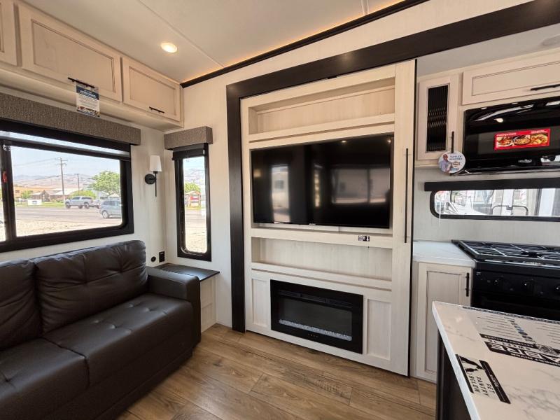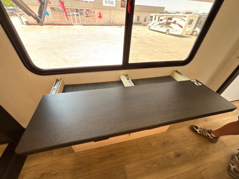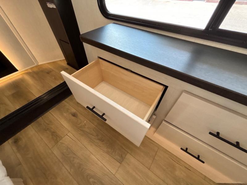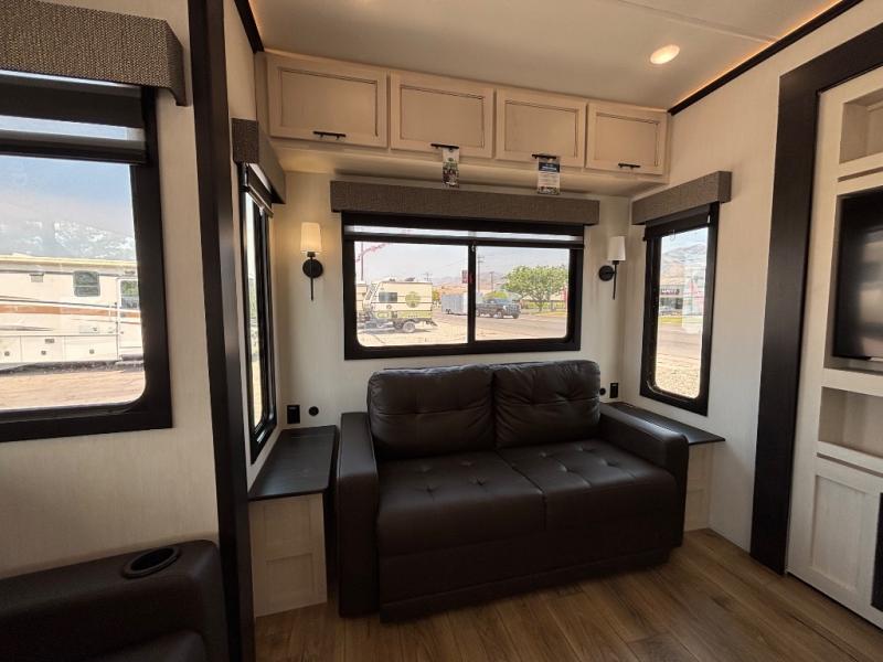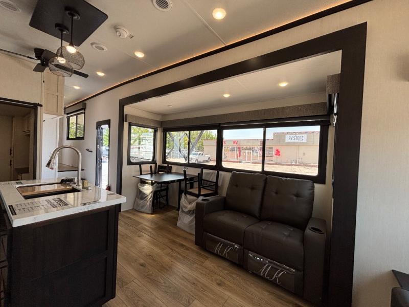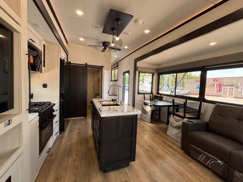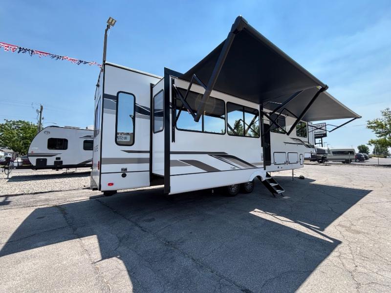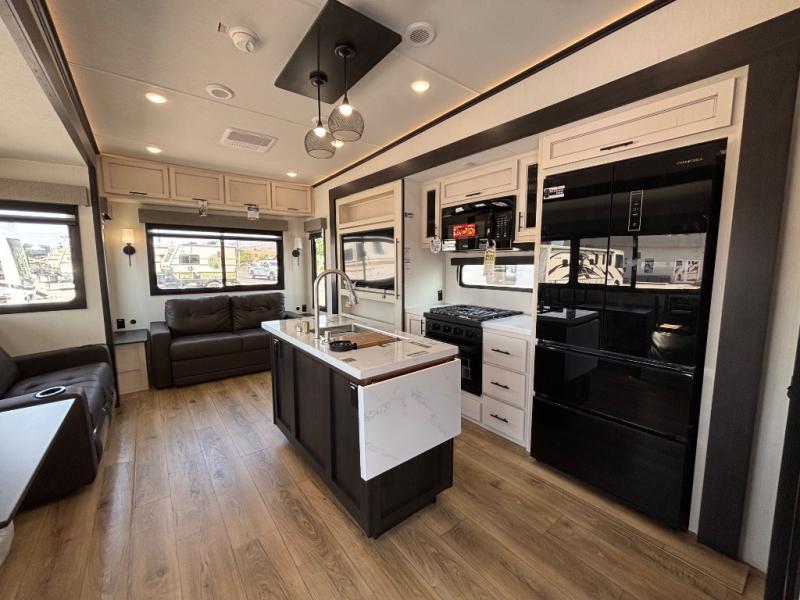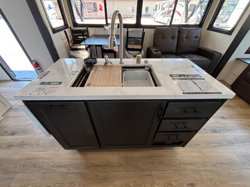 There is much to love in this fifth wheel! Starting with the second bedroom which has a slide that houses a flip-up bunk above a tri-fold sofa across from a desk with drawers, a drop zone, and a wardrobe, plus above all of that is a storage/bunk loft. The rear living area includes a tri-fold sofa, a TV with a hidden pantry behind, and theater seating for two making this space another area at night for guests. In the morning, you can prepare breakfast on the kitchen island, then dine together at the versatile dinette/desk. The full bath will allow you to stay clean throughout your trip, and you'll feel right at home in the front private bedroom with a camper king bed, a dresser, and front wardrobe. Outside, a kitchen and two power awnings create an inviting space!