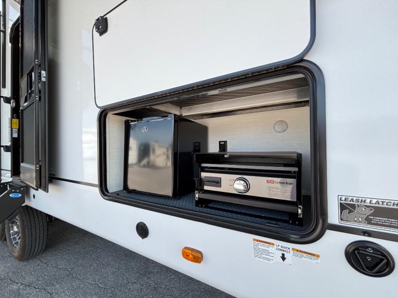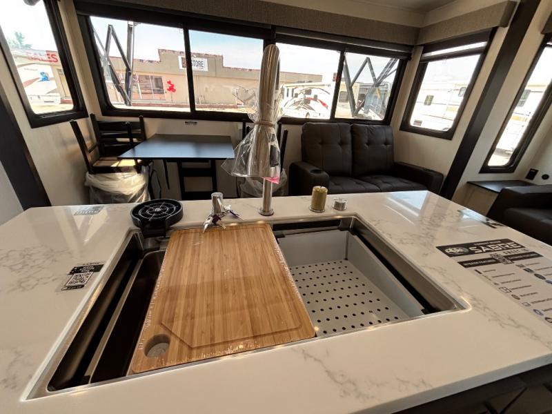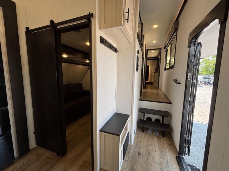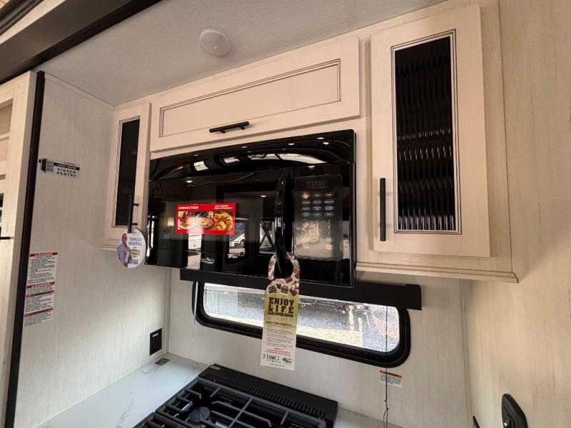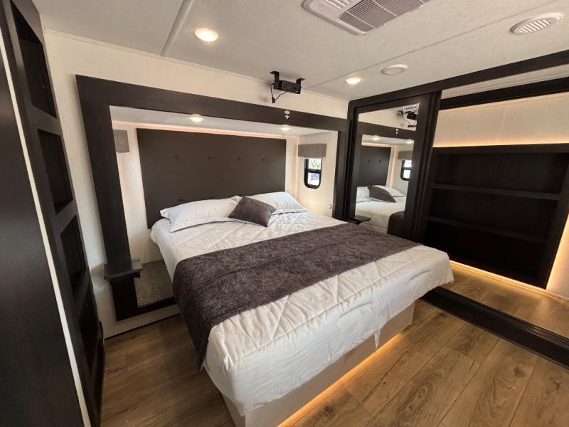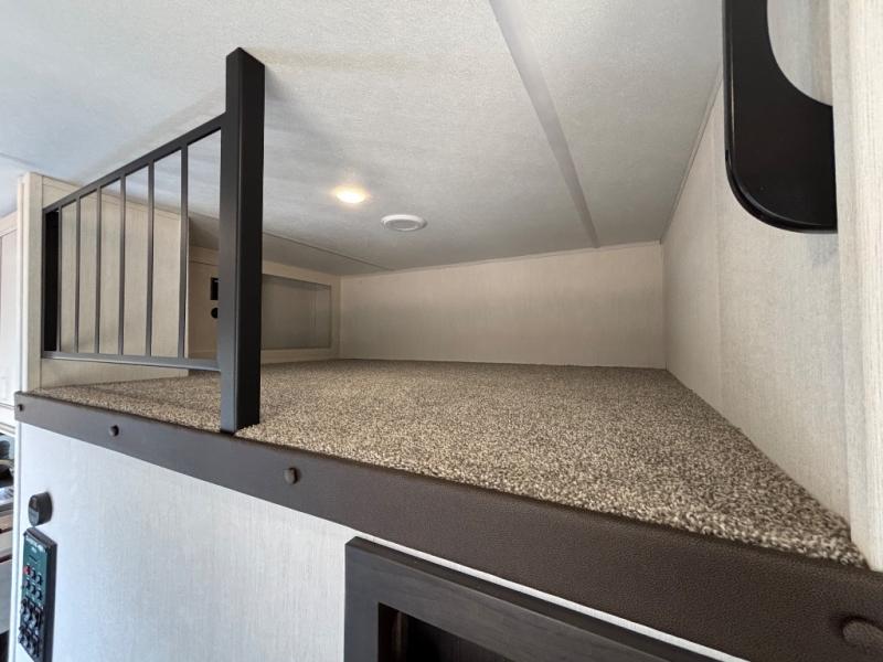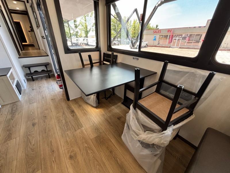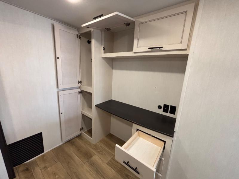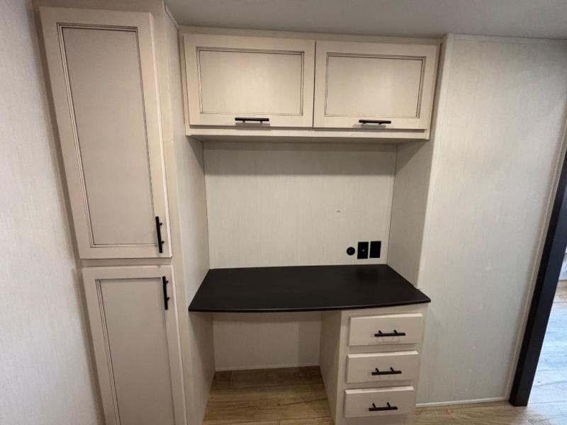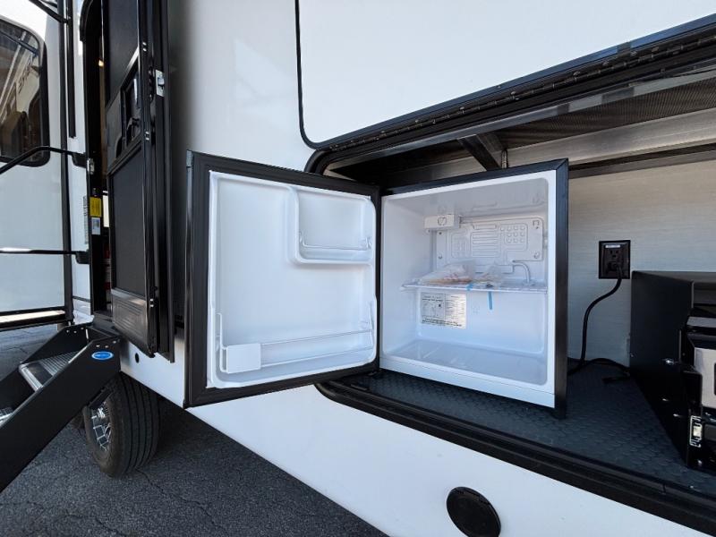 There is much to love in this fifth wheel! Starting with the second bedroom which has a slide that houses a flip-up bunk above a tri-fold sofa across from a desk with drawers, a drop zone, and a wardrobe, plus above all of that is a storage/bunk loft. The rear living area includes a tri-fold sofa, a TV with a hidden pantry behind, and theater seating for two making this space another area at night for guests. In the morning, you can prepare breakfast on the kitchen island, then dine together at the versatile dinette/desk. The full bath will allow you to stay clean throughout your trip, and you'll feel right at home in the front private bedroom with a camper king bed, a dresser, and front wardrobe. Outside, a kitchen and two power awnings create an inviting space!