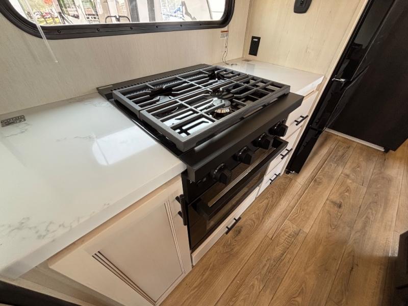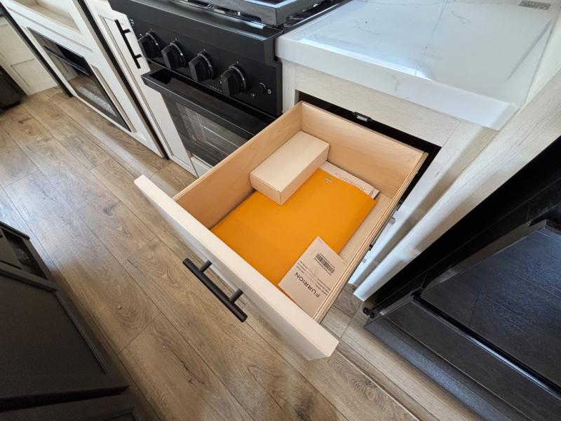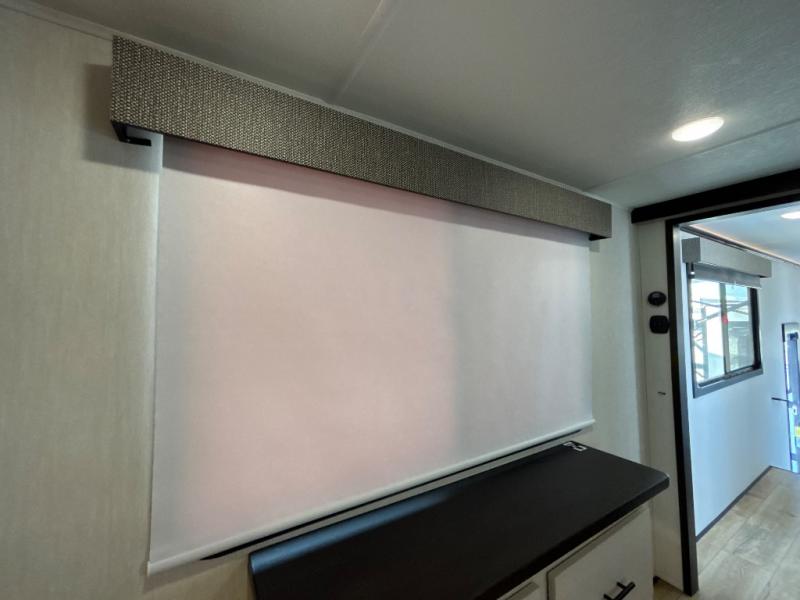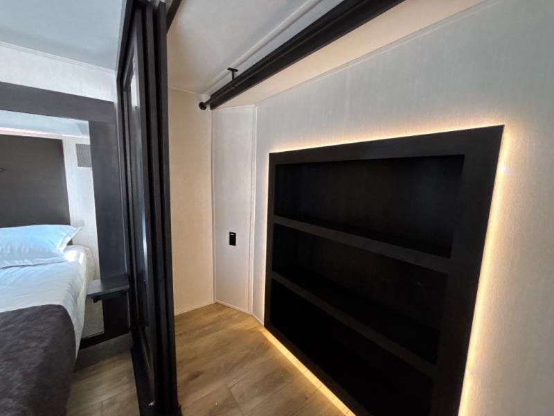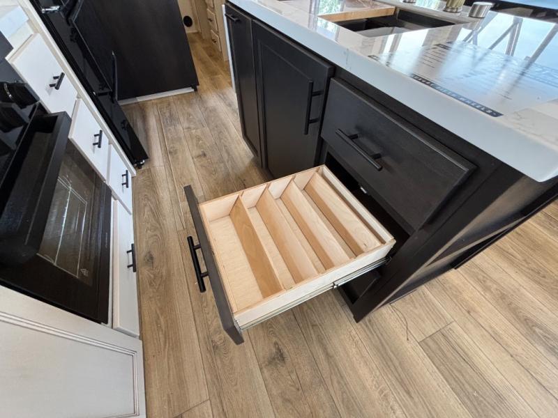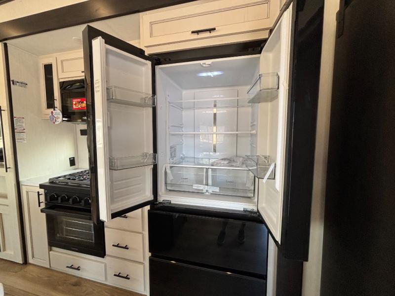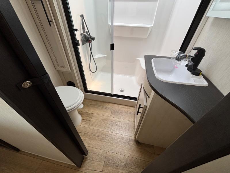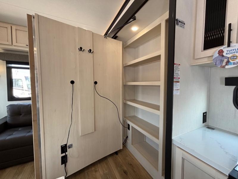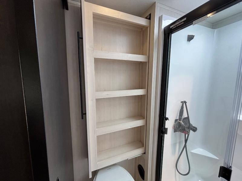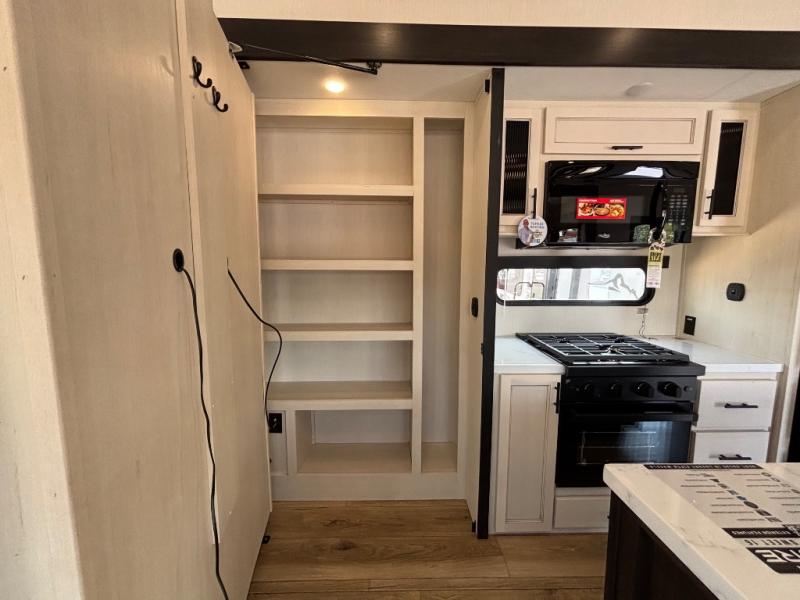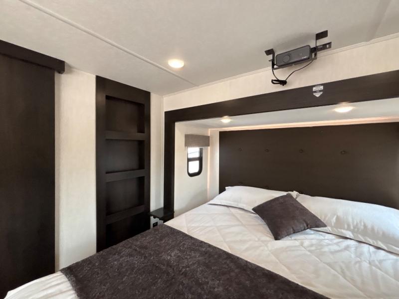 There is much to love in this fifth wheel! Starting with the second bedroom which has a slide that houses a flip-up bunk above a tri-fold sofa across from a desk with drawers, a drop zone, and a wardrobe, plus above all of that is a storage/bunk loft. The rear living area includes a tri-fold sofa, a TV with a hidden pantry behind, and theater seating for two making this space another area at night for guests. In the morning, you can prepare breakfast on the kitchen island, then dine together at the versatile dinette/desk. The full bath will allow you to stay clean throughout your trip, and you'll feel right at home in the front private bedroom with a camper king bed, a dresser, and front wardrobe. Outside, a kitchen and two power awnings create an inviting space!