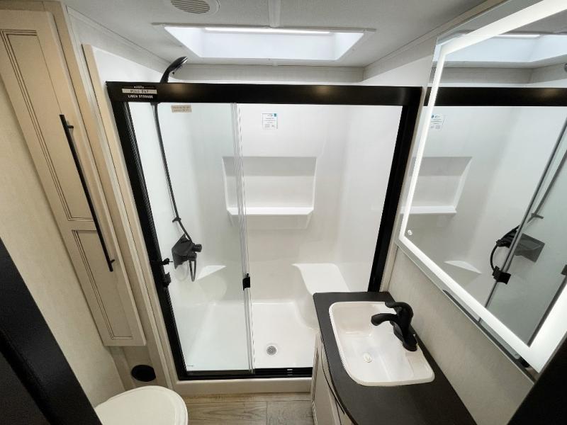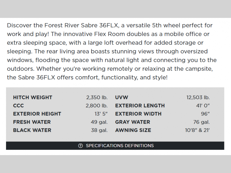 You will experience luxurious camping trips at an affordable price with any one of these Forest River Sabre fifth wheels! These models are durable and ready to travel anytime of the year thanks to features like the high-gloss gel-coat front cap with LED lighting, the PVC roof membrane, and the forced air underbelly with enclosed gate valves. The electric auto-leveling system makes setting up easy and safe, and the adjustable power awning with LED lighting will create an inviting outdoor living space. Each model includes a universal docking station which includes a black tank flush and an outside shower, and adjustable stable steps for you to enter and exit the unit safely. Inside, you will love the design of the ambient accent lighting in the living area, the real wood lumbercore cabinetry, and the linoleum flooring!