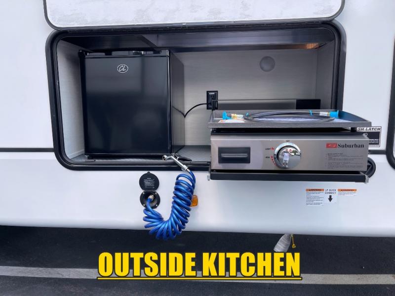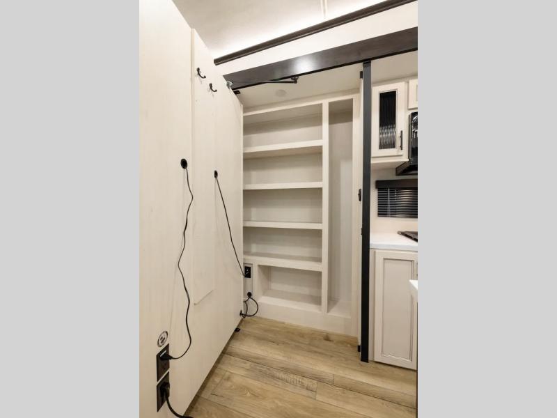 There is much to love in this fifth wheel! Starting with the second bedroom which has a slide that houses a flip-up bunk above a tri-fold sofa across from a desk with drawers, a drop zone, and a wardrobe, plus above all of that is a storage/bunk loft. The rear living area includes a tri-fold sofa, a TV with a hidden pantry behind, and theater seating for two making this space another area at night for guests. In the morning, you can prepare breakfast on the kitchen island, then dine together at the versatile dinette/desk. The full bath will allow you to stay clean throughout your trip, and you'll feel right at home in the front private bedroom with a camper king bed, a dresser, and front wardrobe. Outside, a kitchen and two power awnings create an inviting space!