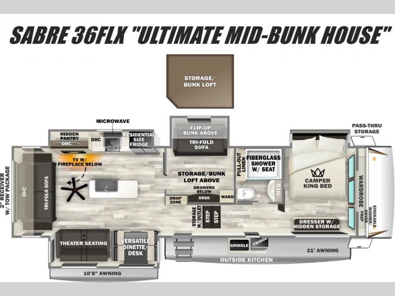 You will experience luxurious camping trips at an affordable price with any one of these Forest River Sabre fifth wheels! These models are durable and ready to travel anytime of the year thanks to features like the high-gloss gel-coat front cap with LED lighting, the PVC roof membrane, and the forced air underbelly with enclosed gate valves. The electric auto-leveling system makes setting up easy and safe, and the adjustable power awning with LED lighting will create an inviting outdoor living space. Each model includes a universal docking station which includes a black tank flush and an outside shower, and adjustable stable steps for you to enter and exit the unit safely. Inside, you will love the design of the ambient accent lighting in the living area, the real wood lumbercore cabinetry, and the linoleum flooring!