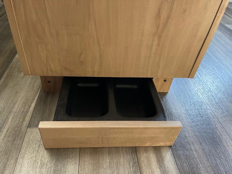 There is much to love in this fifth wheel! Starting with the second bedroom which has a slide that houses a flip-up bunk above a tri-fold sofa across from a desk with drawers, a drop zone, and a wardrobe, plus above all of that is a storage/bunk loft. The rear living area includes a tri-fold sofa, a TV with a hidden pantry behind, and theater seating for two making this space another area at night for guests. In the morning, you can prepare breakfast on the kitchen island, then dine together at the versatile dinette/desk. The full bath will allow you to stay clean throughout your trip, and you'll feel right at home in the front private bedroom with a camper king bed, a dresser, and front wardrobe. Outside, a kitchen and two power awnings create an inviting space!