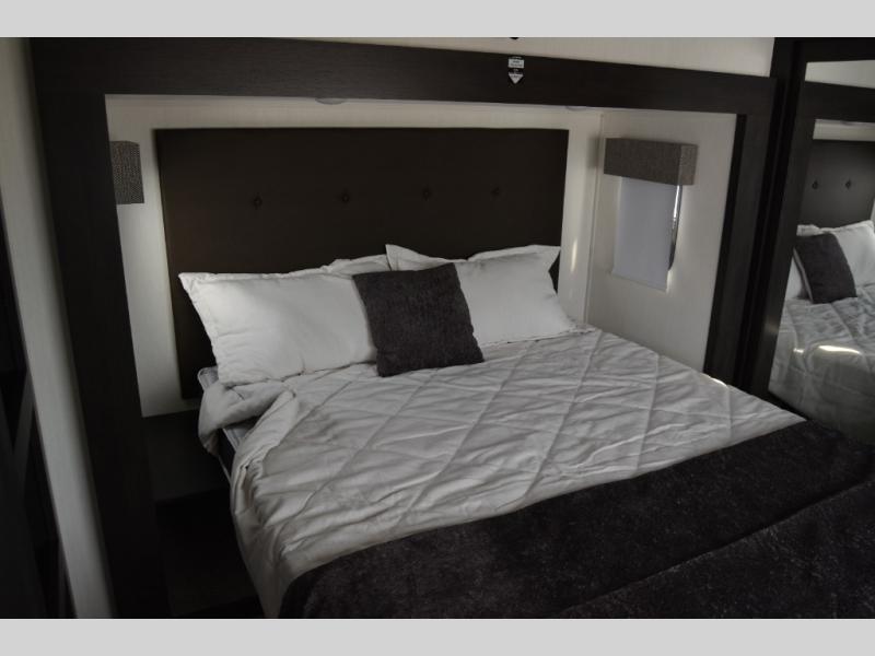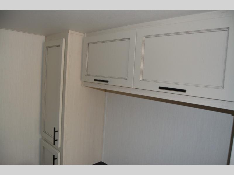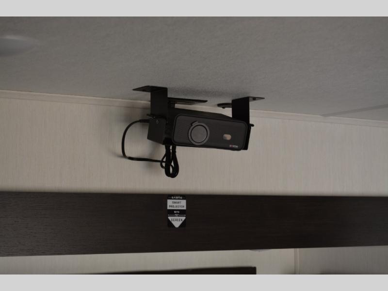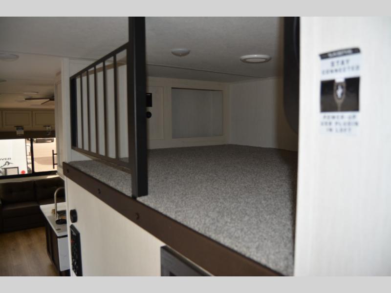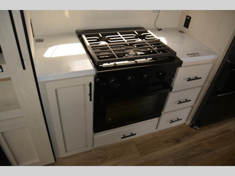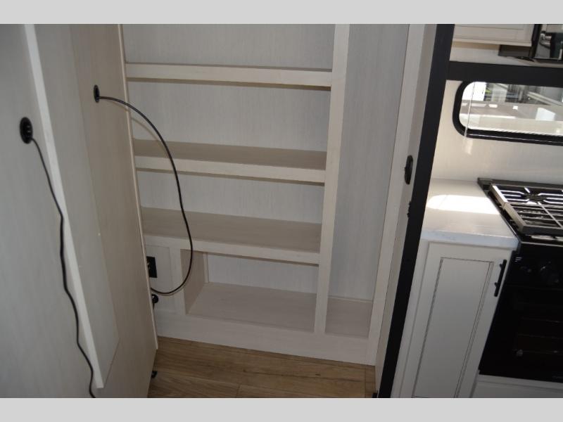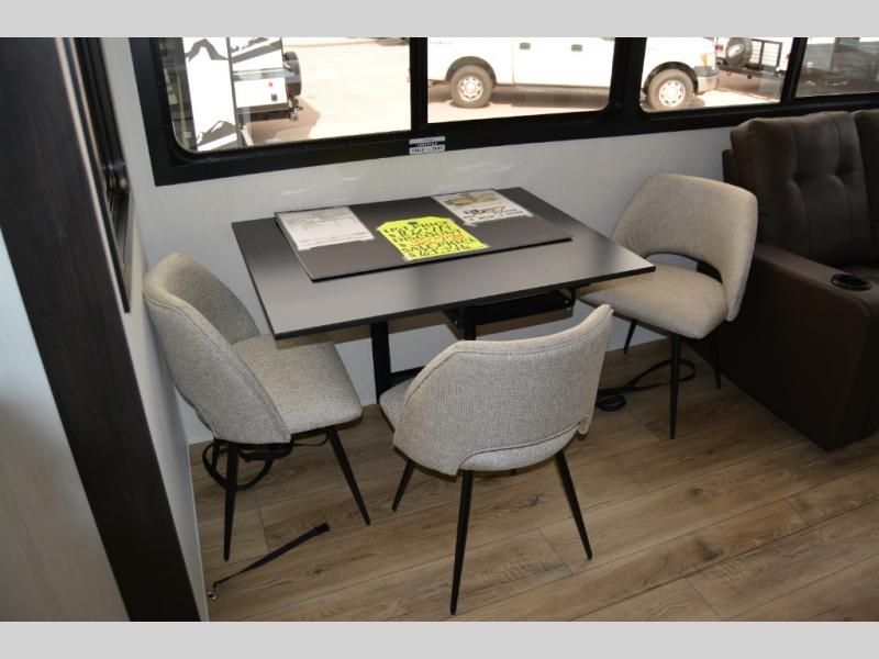 There is much to love in this fifth wheel! Starting with the second bedroom which has a slide that houses a flip-up bunk above a tri-fold sofa across from a desk with drawers, a drop zone, and a wardrobe, plus above all of that is a storage/bunk loft. The rear living area includes a tri-fold sofa, a TV with a hidden pantry behind, and theater seating for two making this space another area at night for guests. In the morning, you can prepare breakfast on the kitchen island, then dine together at the versatile dinette/desk. The full bath will allow you to stay clean throughout your trip, and you'll feel right at home in the front private bedroom with a camper king bed, a dresser, and front wardrobe. Outside, a kitchen and two power awnings create an inviting space!