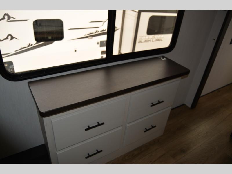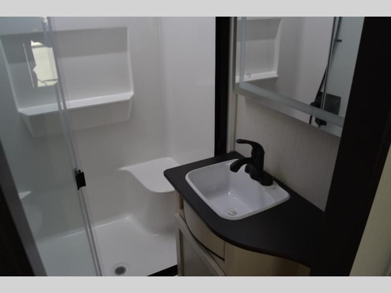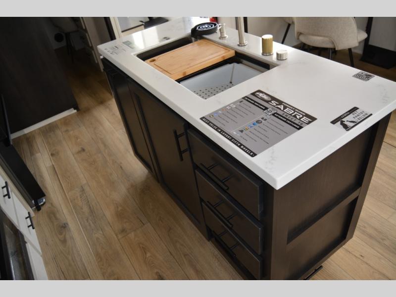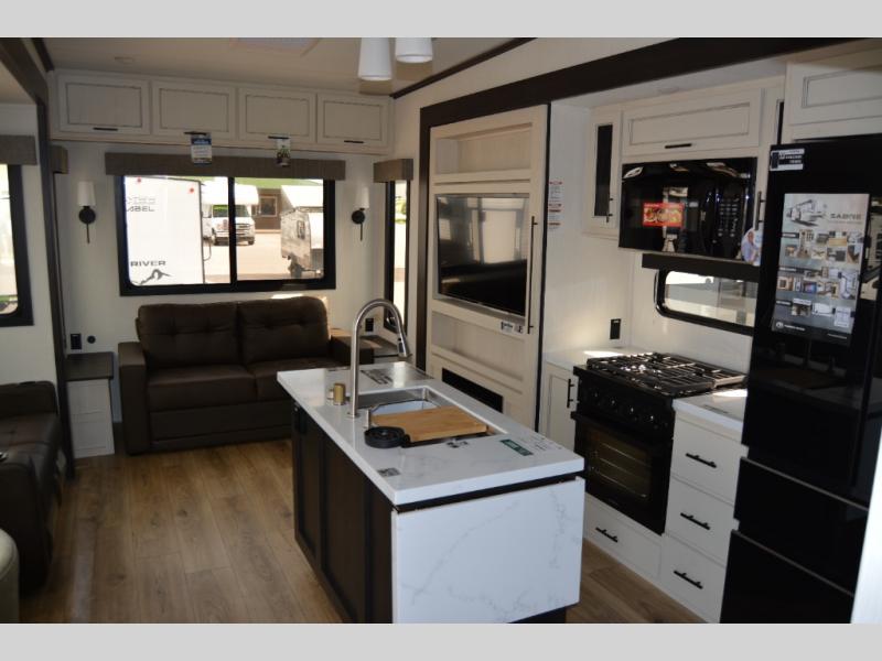 You will experience luxurious camping trips at an affordable price with any one of these Forest River Sabre fifth wheels! These models are durable and ready to travel anytime of the year thanks to features like the high-gloss gel-coat front cap with LED lighting, the PVC roof membrane, and the forced air underbelly with enclosed gate valves. The electric auto-leveling system makes setting up easy and safe, and the adjustable power awning with LED lighting will create an inviting outdoor living space. Each model includes a universal docking station which includes a black tank flush and an outside shower, and adjustable stable steps for you to enter and exit the unit safely. Inside, you will love the design of the ambient accent lighting in the living area, the real wood lumbercore cabinetry, and the linoleum flooring!