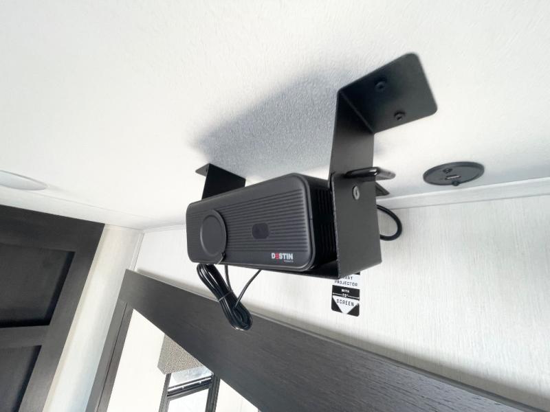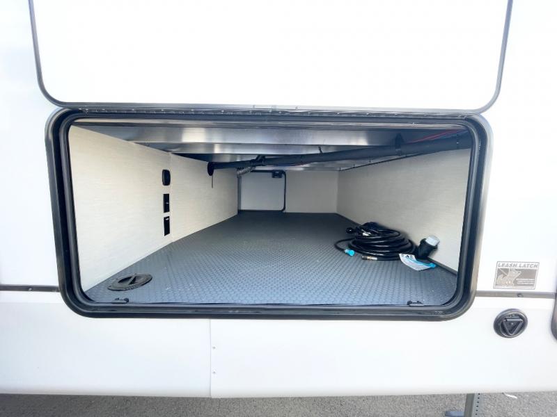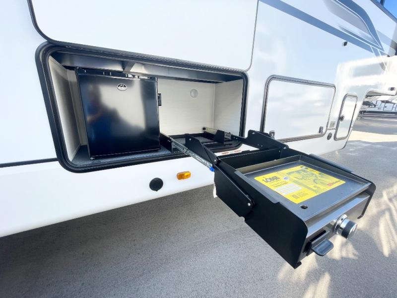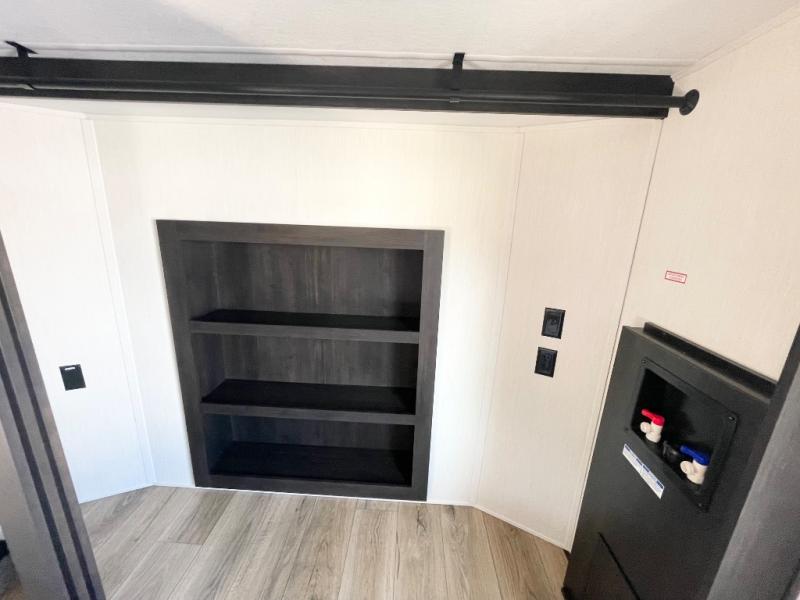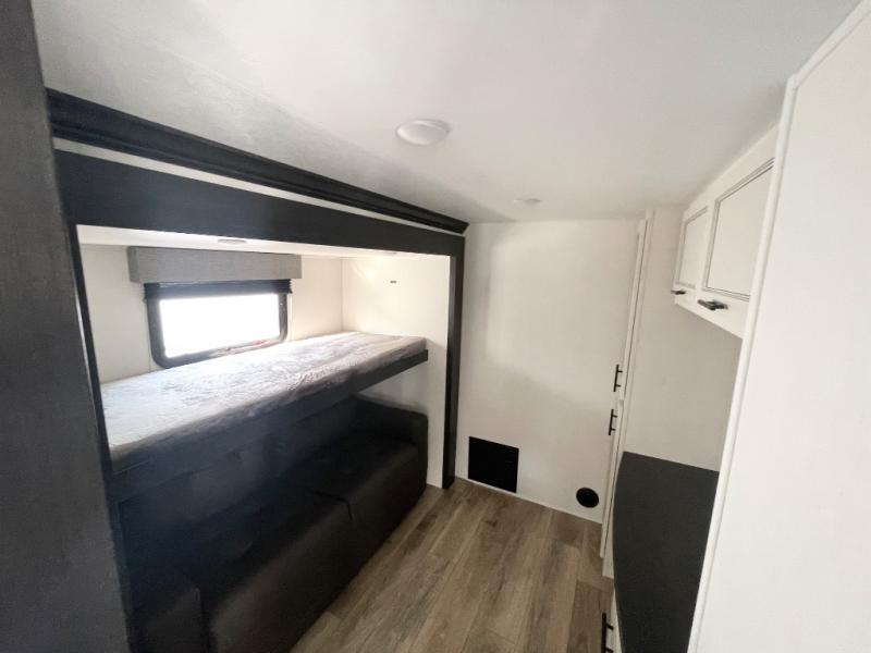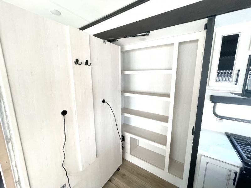 There is much to love in this fifth wheel! Starting with the second bedroom which has a slide that houses a flip-up bunk above a tri-fold sofa across from a desk with drawers, a drop zone, and a wardrobe, plus above all of that is a storage/bunk loft. The rear living area includes a tri-fold sofa, a TV with a hidden pantry behind, and theater seating for two making this space another area at night for guests. In the morning, you can prepare breakfast on the kitchen island, then dine together at the versatile dinette/desk. The full bath will allow you to stay clean throughout your trip, and you'll feel right at home in the front private bedroom with a camper king bed, a dresser, and front wardrobe. Outside, a kitchen and two power awnings create an inviting space!