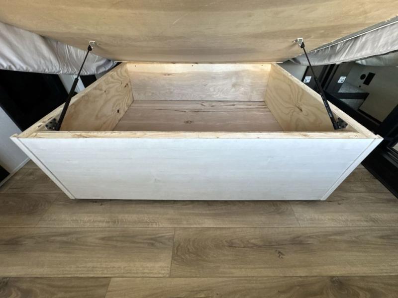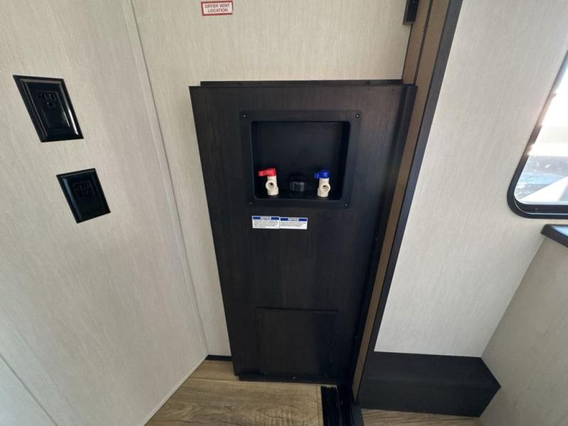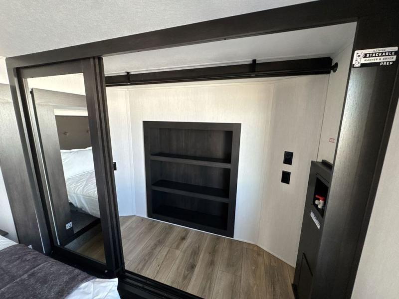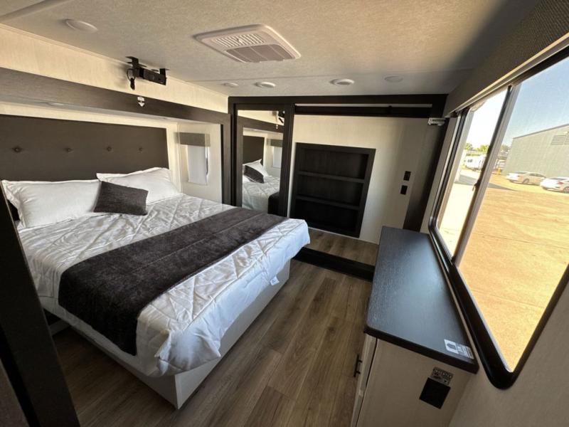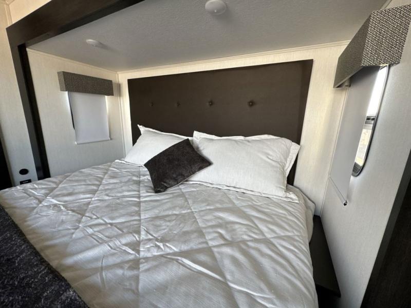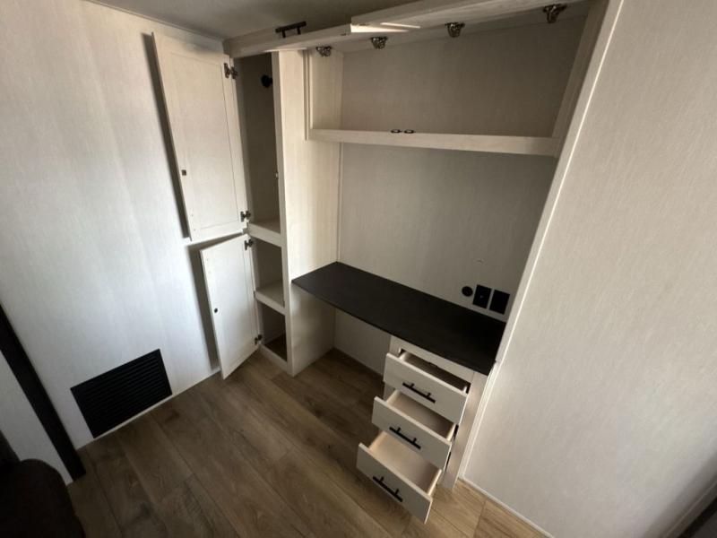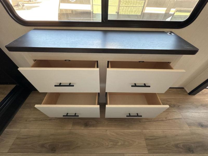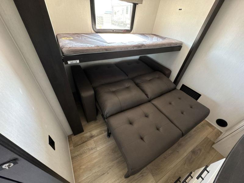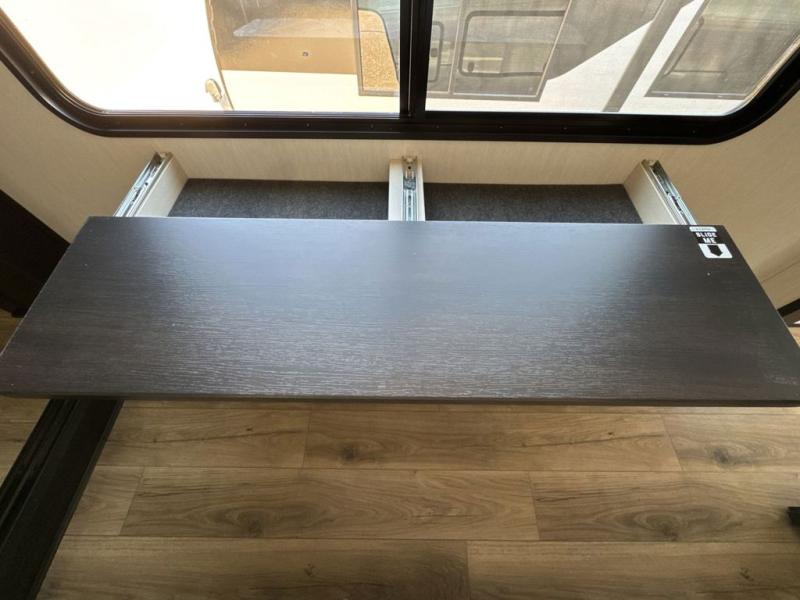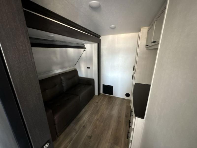 There is much to love in this fifth wheel! Starting with the second bedroom which has a slide that houses a flip-up bunk above a tri-fold sofa across from a desk with drawers, a drop zone, and a wardrobe, plus above all of that is a storage/bunk loft. The rear living area includes a tri-fold sofa, a TV with a hidden pantry behind, and theater seating for two making this space another area at night for guests. In the morning, you can prepare breakfast on the kitchen island, then dine together at the versatile dinette/desk. The full bath will allow you to stay clean throughout your trip, and you'll feel right at home in the front private bedroom with a camper king bed, a dresser, and front wardrobe. Outside, a kitchen and two power awnings create an inviting space!