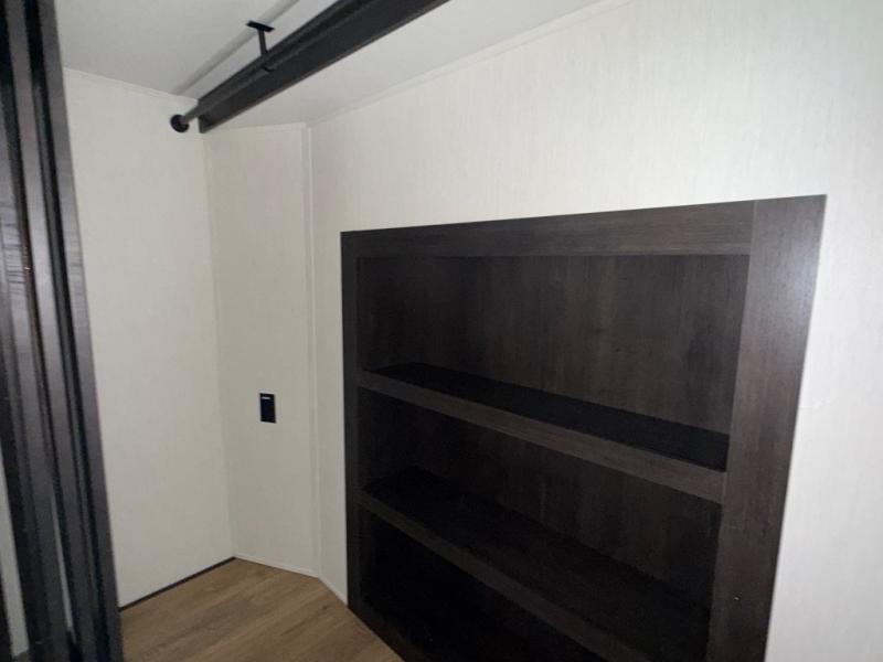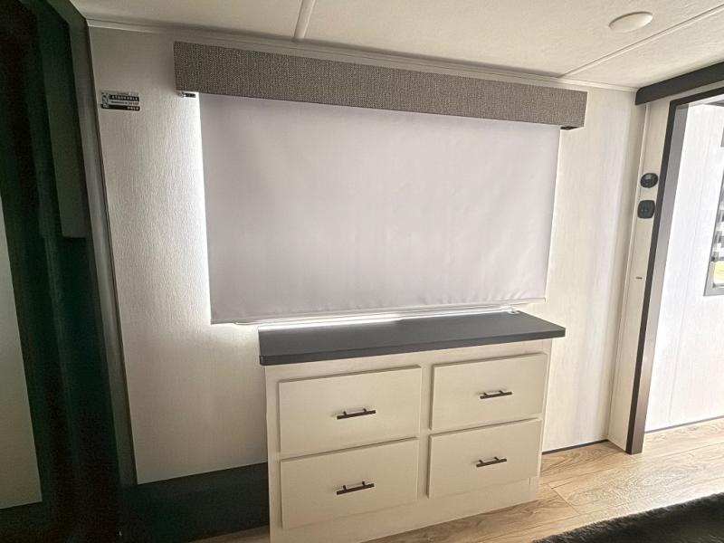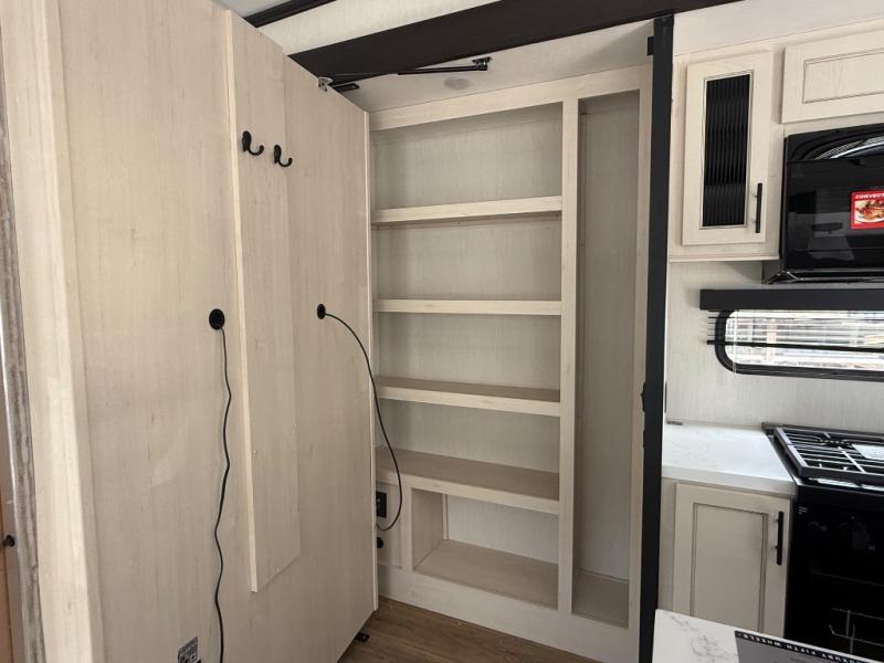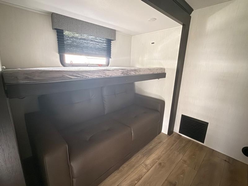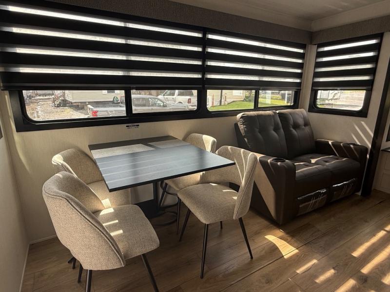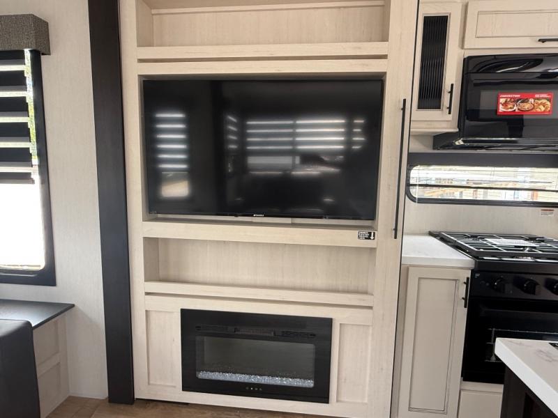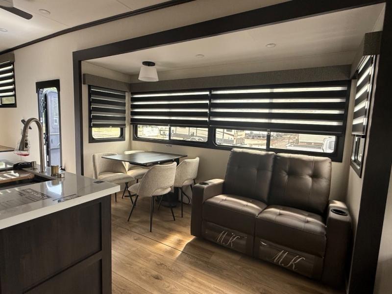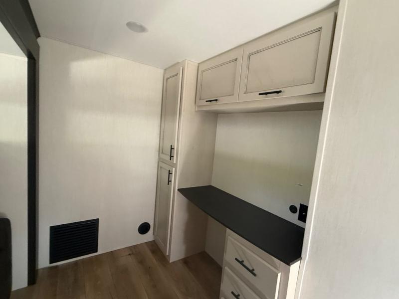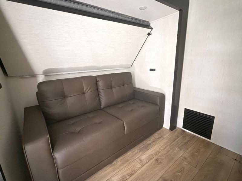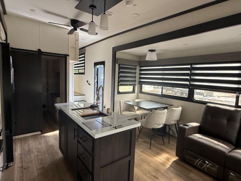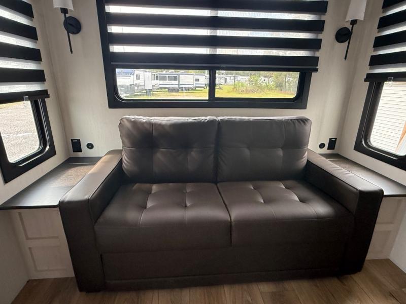 There is much to love in this fifth wheel! Starting with the second bedroom which has a slide that houses a flip-up bunk above a tri-fold sofa across from a desk with drawers, a drop zone, and a wardrobe, plus above all of that is a storage/bunk loft. The rear living area includes a tri-fold sofa, a TV with a hidden pantry behind, and theater seating for two making this space another area at night for guests. In the morning, you can prepare breakfast on the kitchen island, then dine together at the versatile dinette/desk. The full bath will allow you to stay clean throughout your trip, and you'll feel right at home in the front private bedroom with a camper king bed, a dresser, and front wardrobe. Outside, a kitchen and two power awnings create an inviting space!