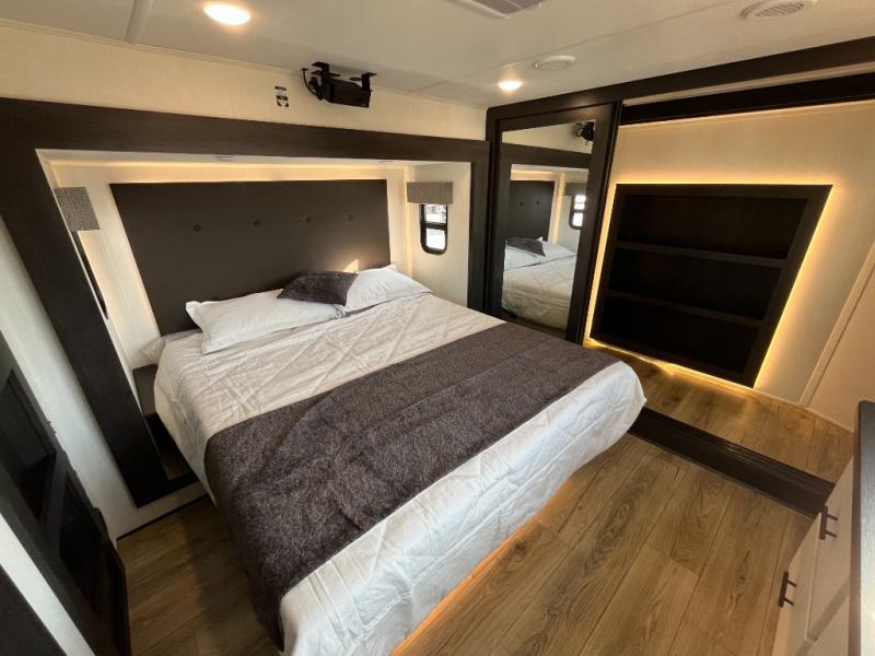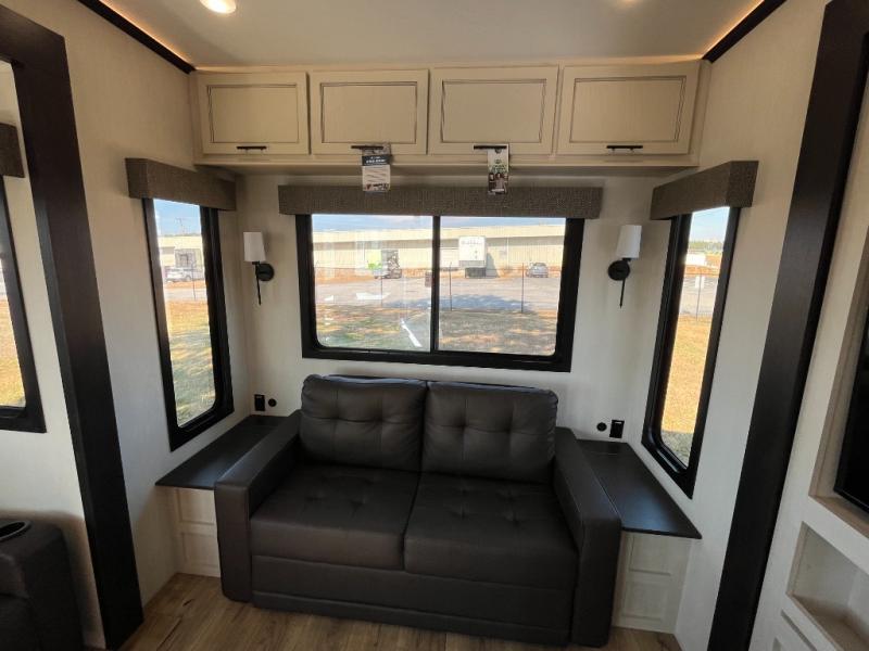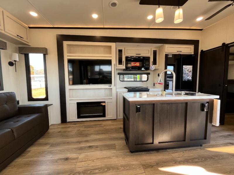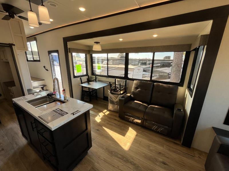 There is much to love in this fifth wheel! Starting with the second bedroom which has a slide that houses a flip-up bunk above a tri-fold sofa across from a desk with drawers, a drop zone, and a wardrobe, plus above all of that is a storage/bunk loft. The rear living area includes a tri-fold sofa, a TV with a hidden pantry behind, and theater seating for two making this space another area at night for guests. In the morning, you can prepare breakfast on the kitchen island, then dine together at the versatile dinette/desk. The full bath will allow you to stay clean throughout your trip, and you'll feel right at home in the front private bedroom with a camper king bed, a dresser, and front wardrobe. Outside, a kitchen and two power awnings create an inviting space!