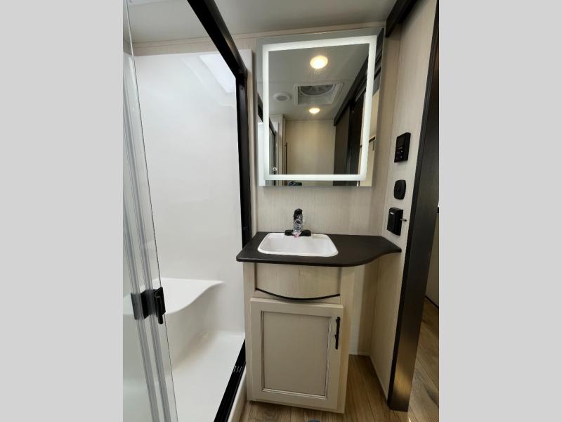 You will experience luxurious camping trips at an affordable price with any one of these Forest River Sabre fifth wheels! These models are durable and ready to travel anytime of the year thanks to features like the high-gloss gel-coat front cap with LED lighting, the PVC roof membrane, and the forced air underbelly with enclosed gate valves. The electric auto-leveling system makes setting up easy and safe, and the adjustable power awning with LED lighting will create an inviting outdoor living space. Each model includes a universal docking station which includes a black tank flush and an outside shower, and adjustable stable steps for you to enter and exit the unit safely. Inside, you will love the design of the ambient accent lighting in the living area, the real wood lumbercore cabinetry, and the linoleum flooring!