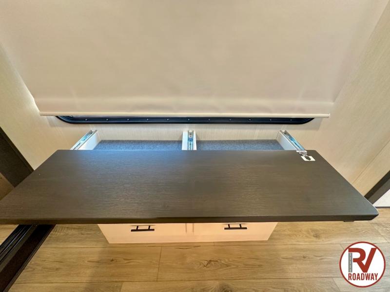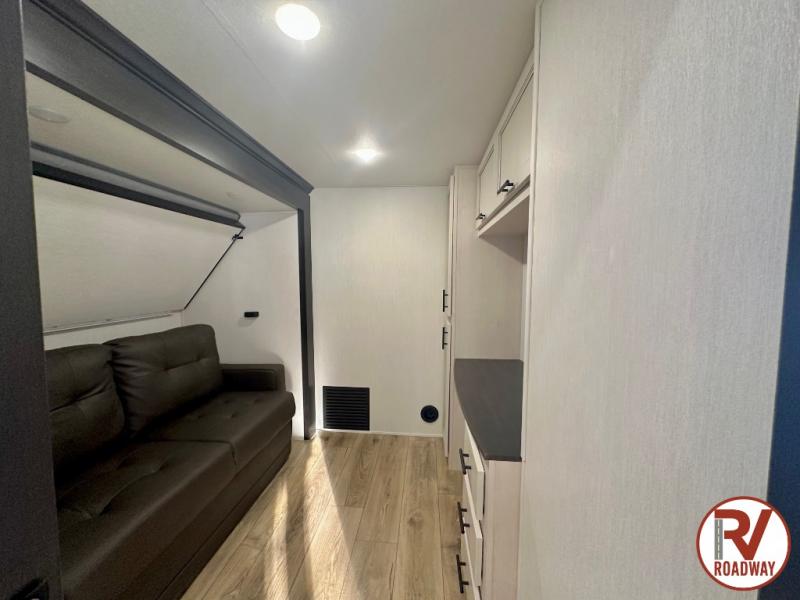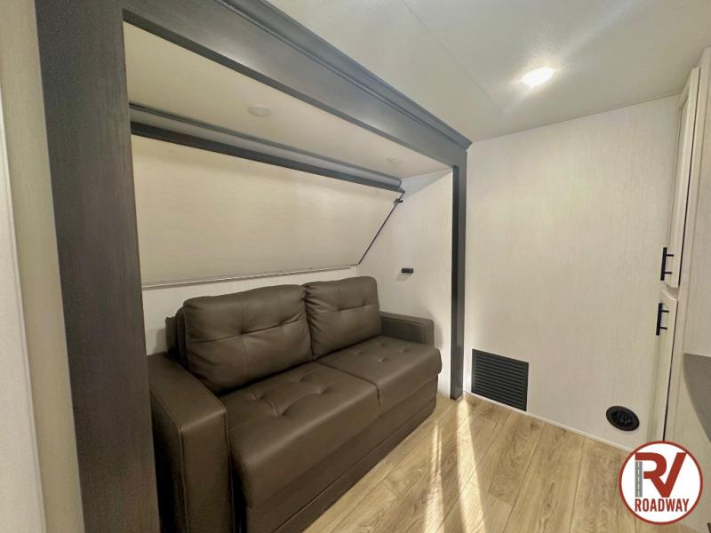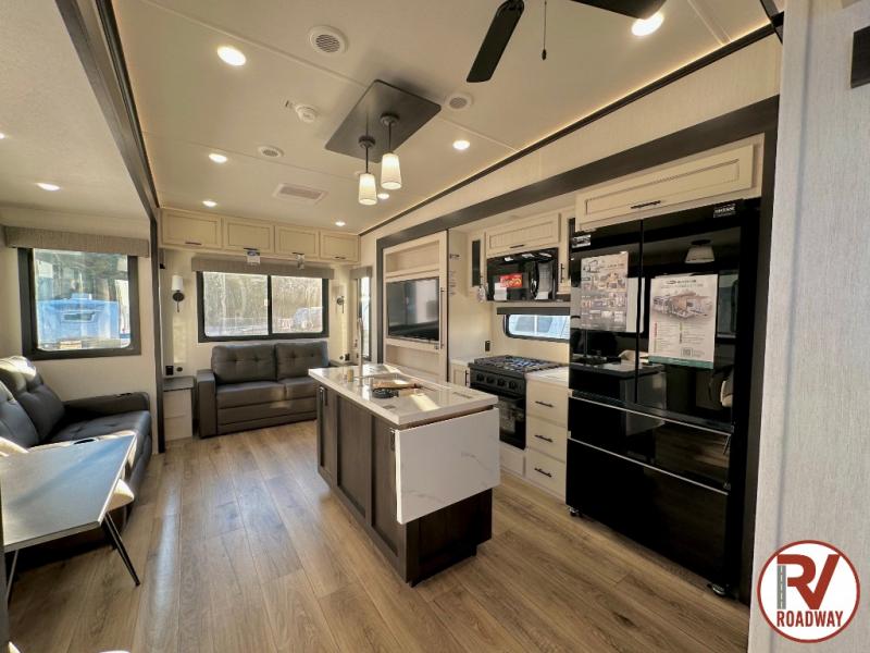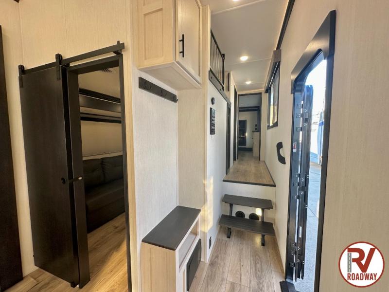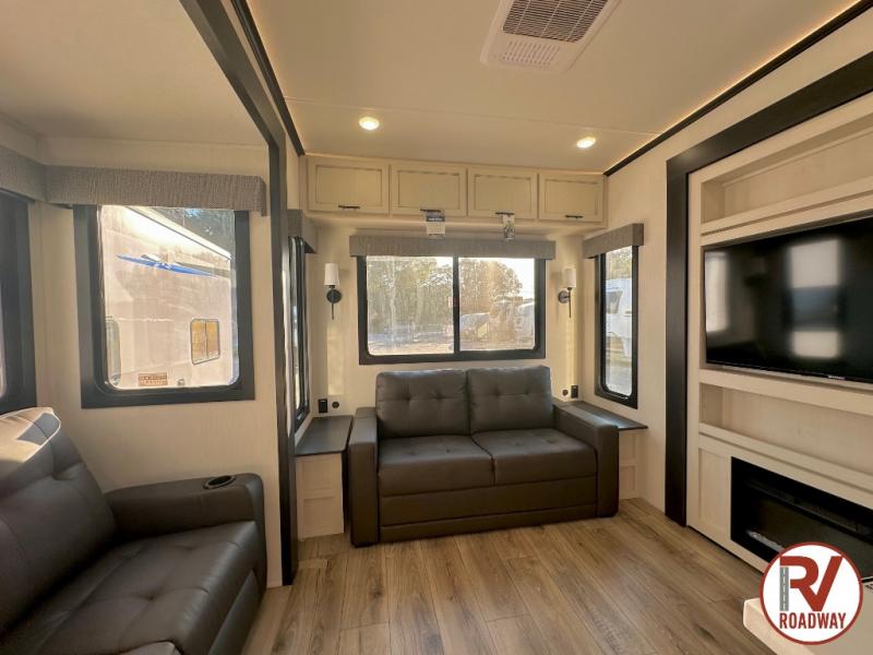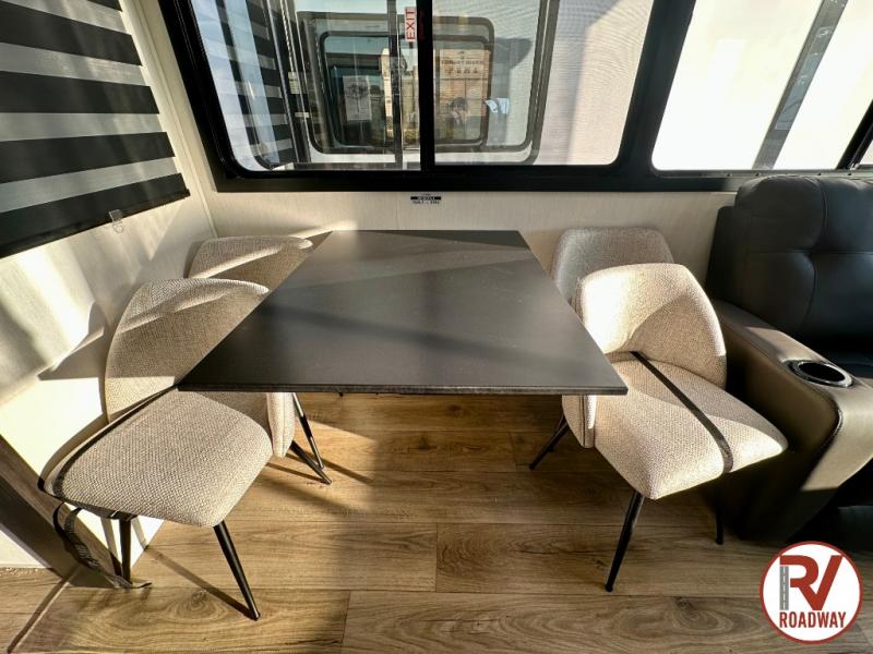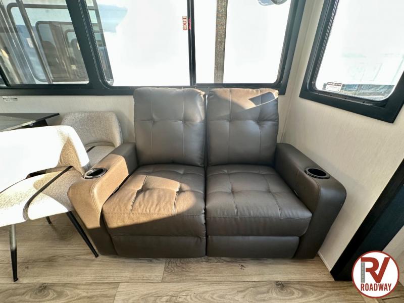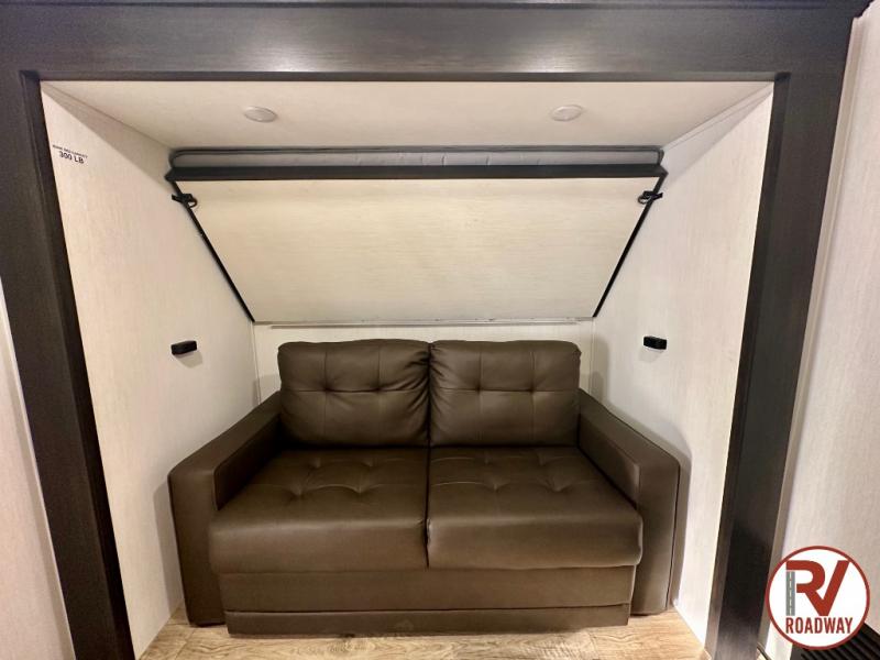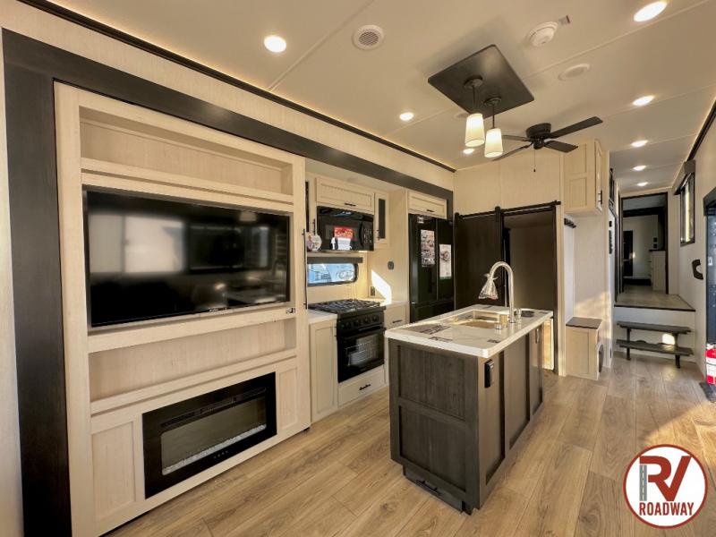 There is much to love in this fifth wheel! Starting with the second bedroom which has a slide that houses a flip-up bunk above a tri-fold sofa across from a desk with drawers, a drop zone, and a wardrobe, plus above all of that is a storage/bunk loft. The rear living area includes a tri-fold sofa, a TV with a hidden pantry behind, and theater seating for two making this space another area at night for guests. In the morning, you can prepare breakfast on the kitchen island, then dine together at the versatile dinette/desk. The full bath will allow you to stay clean throughout your trip, and you'll feel right at home in the front private bedroom with a camper king bed, a dresser, and front wardrobe. Outside, a kitchen and two power awnings create an inviting space!