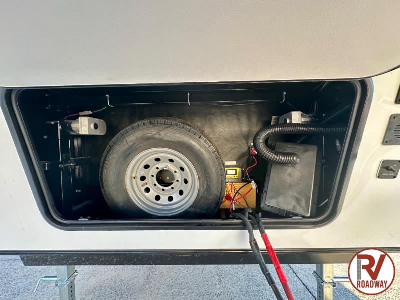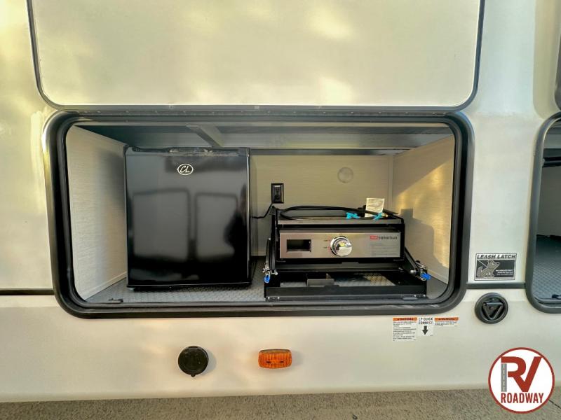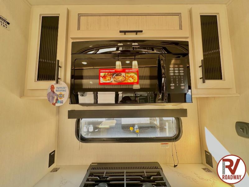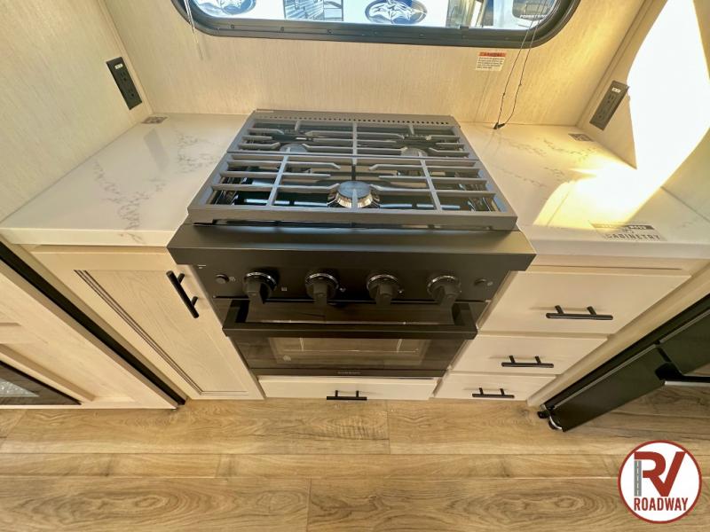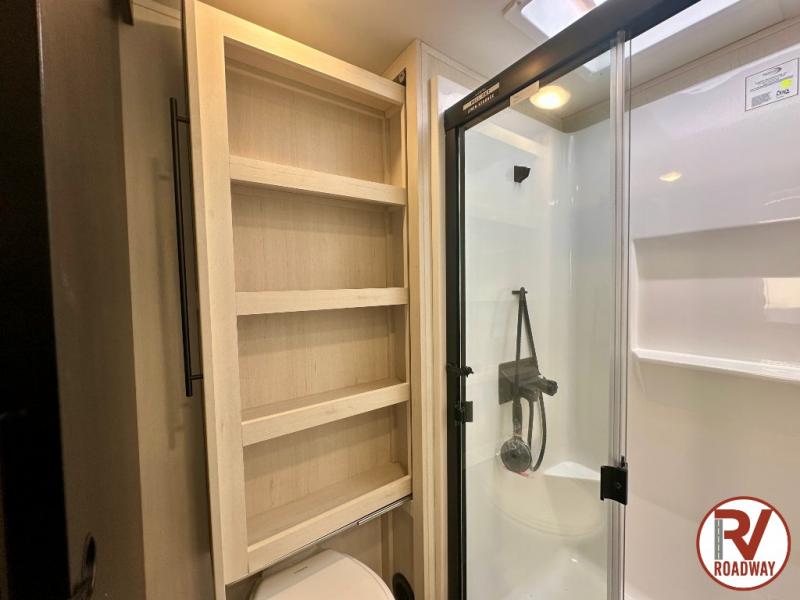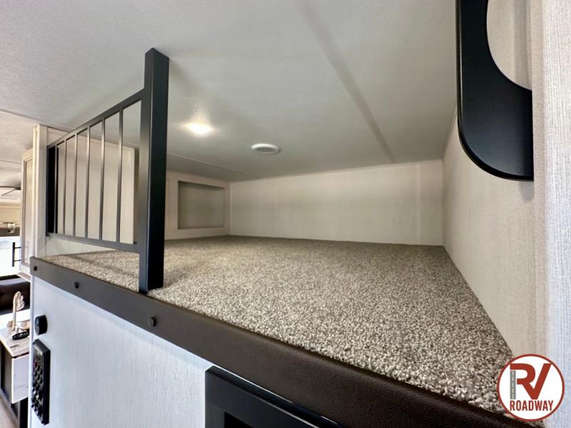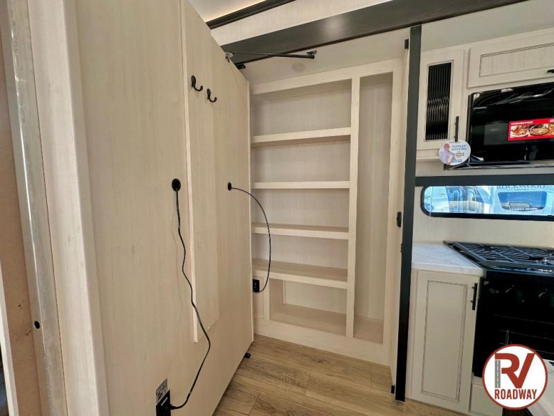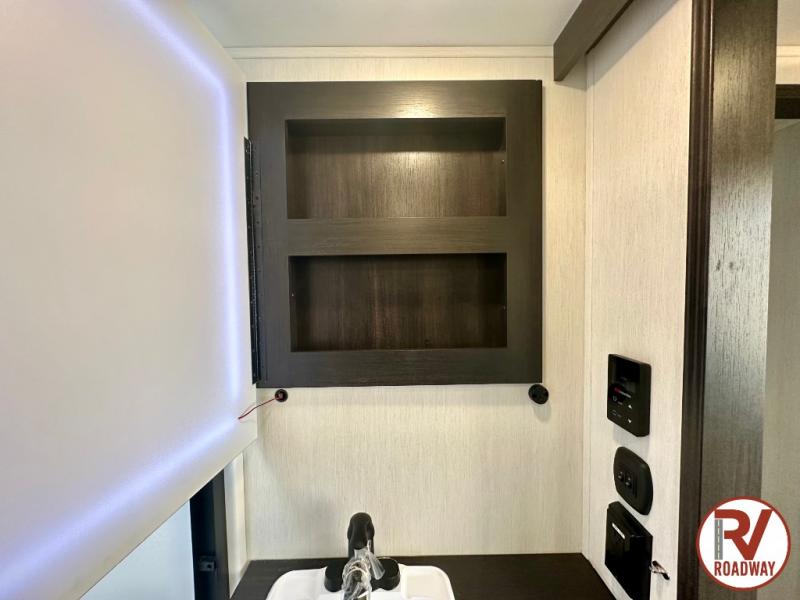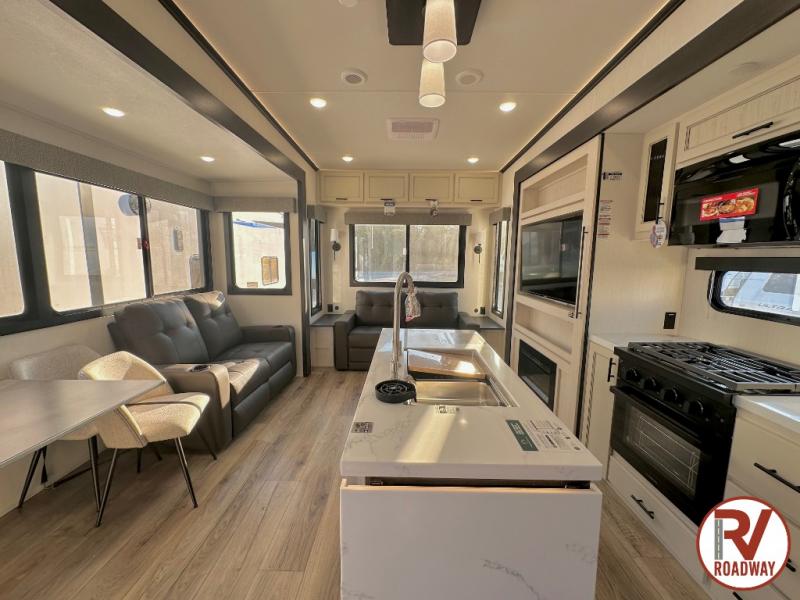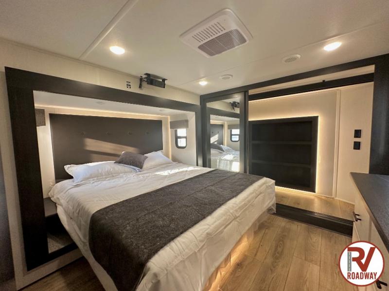 There is much to love in this fifth wheel! Starting with the second bedroom which has a slide that houses a flip-up bunk above a tri-fold sofa across from a desk with drawers, a drop zone, and a wardrobe, plus above all of that is a storage/bunk loft. The rear living area includes a tri-fold sofa, a TV with a hidden pantry behind, and theater seating for two making this space another area at night for guests. In the morning, you can prepare breakfast on the kitchen island, then dine together at the versatile dinette/desk. The full bath will allow you to stay clean throughout your trip, and you'll feel right at home in the front private bedroom with a camper king bed, a dresser, and front wardrobe. Outside, a kitchen and two power awnings create an inviting space!