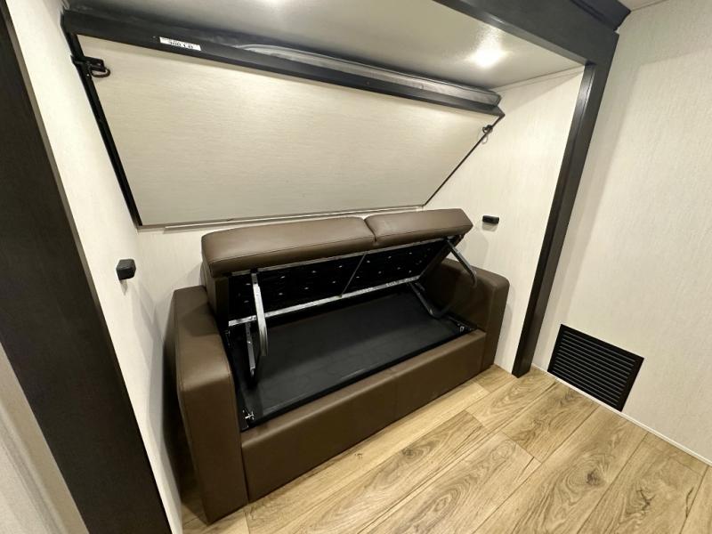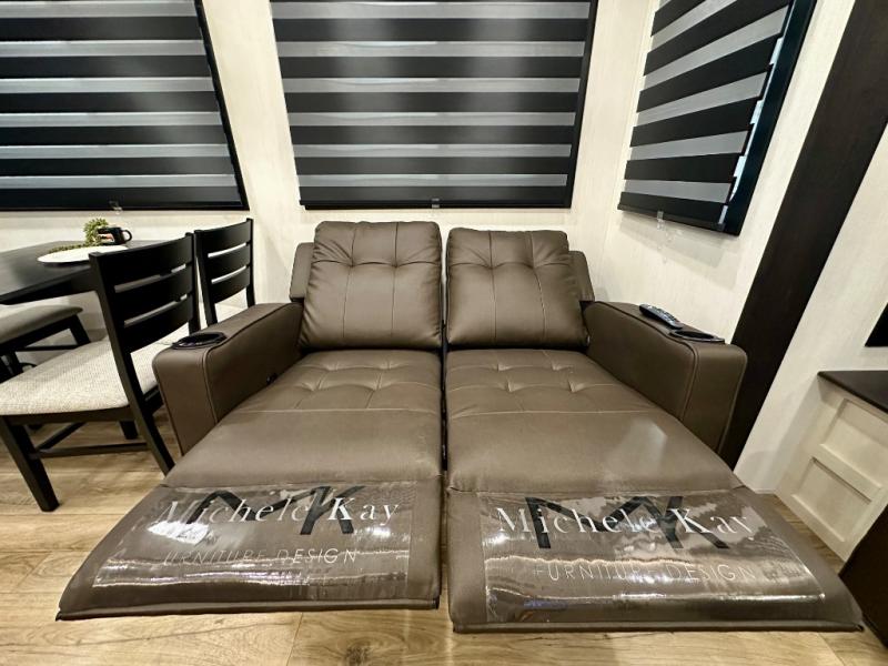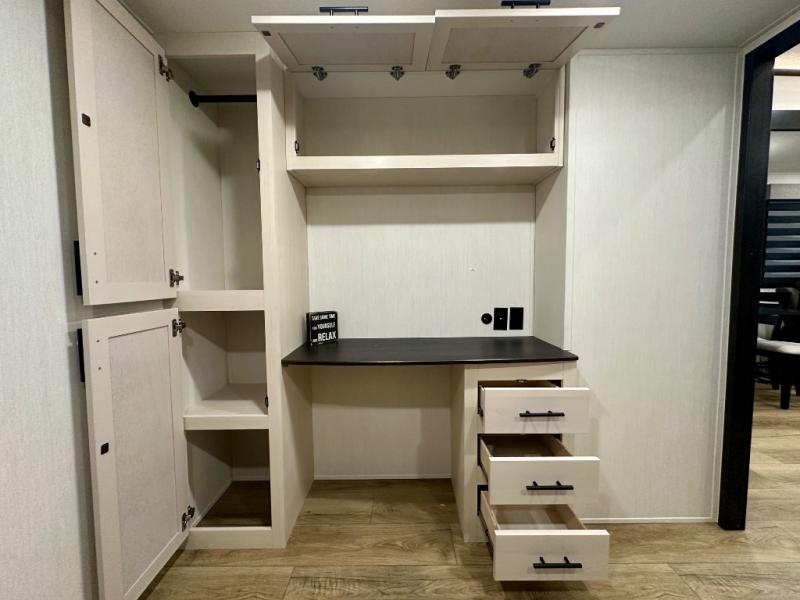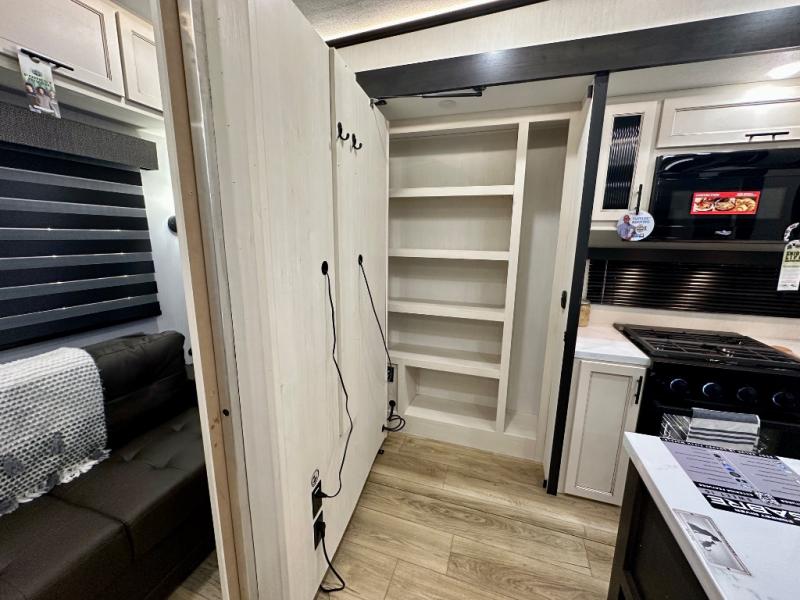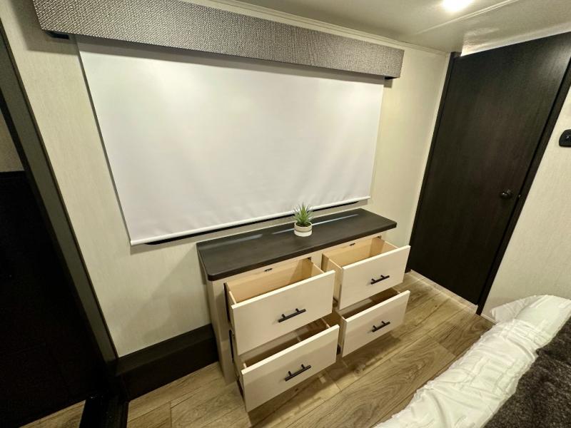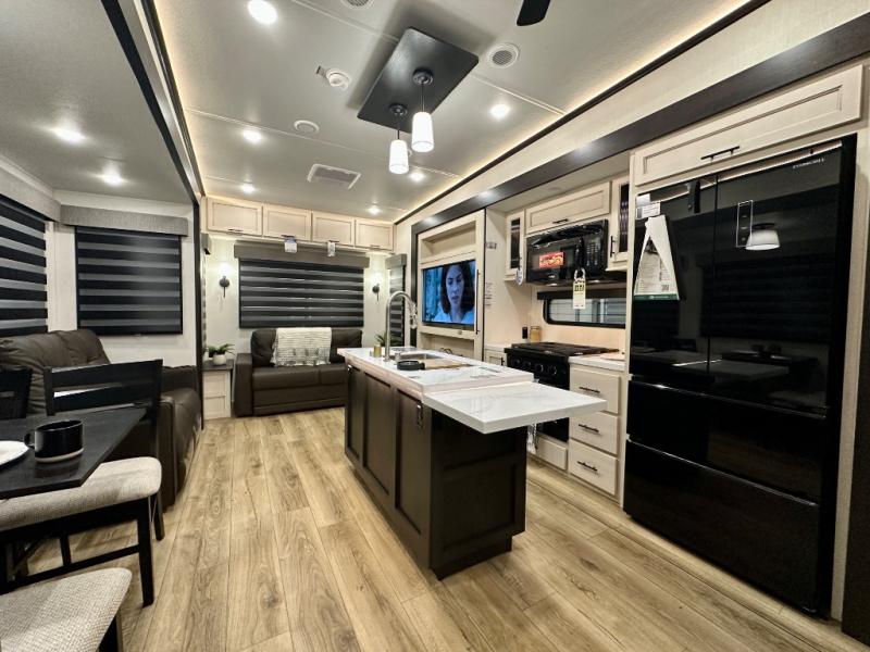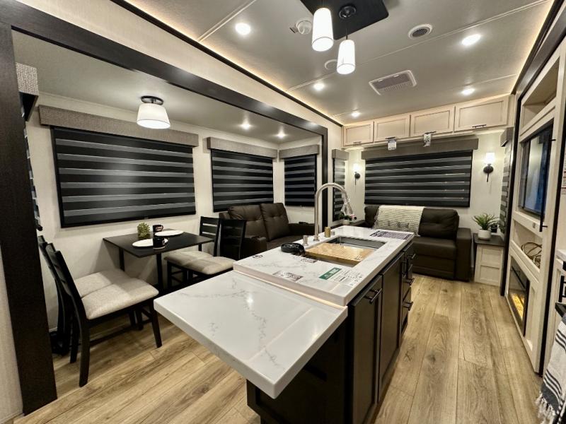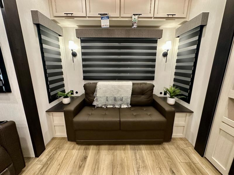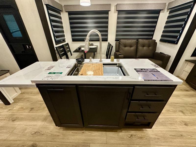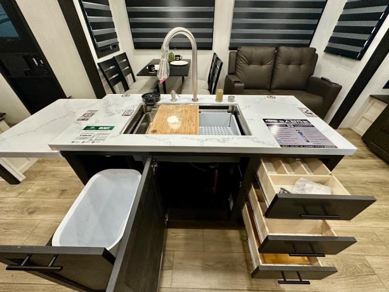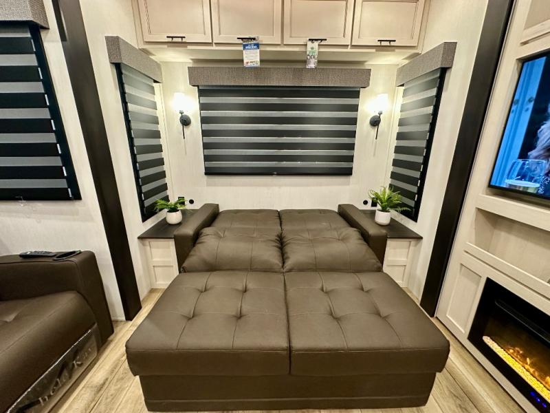 There is much to love in this fifth wheel! Starting with the second bedroom which has a slide that houses a flip-up bunk above a tri-fold sofa across from a desk with drawers, a drop zone, and a wardrobe, plus above all of that is a storage/bunk loft. The rear living area includes a tri-fold sofa, a TV with a hidden pantry behind, and theater seating for two making this space another area at night for guests. In the morning, you can prepare breakfast on the kitchen island, then dine together at the versatile dinette/desk. The full bath will allow you to stay clean throughout your trip, and you'll feel right at home in the front private bedroom with a camper king bed, a dresser, and front wardrobe. Outside, a kitchen and two power awnings create an inviting space!