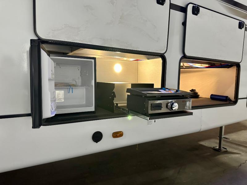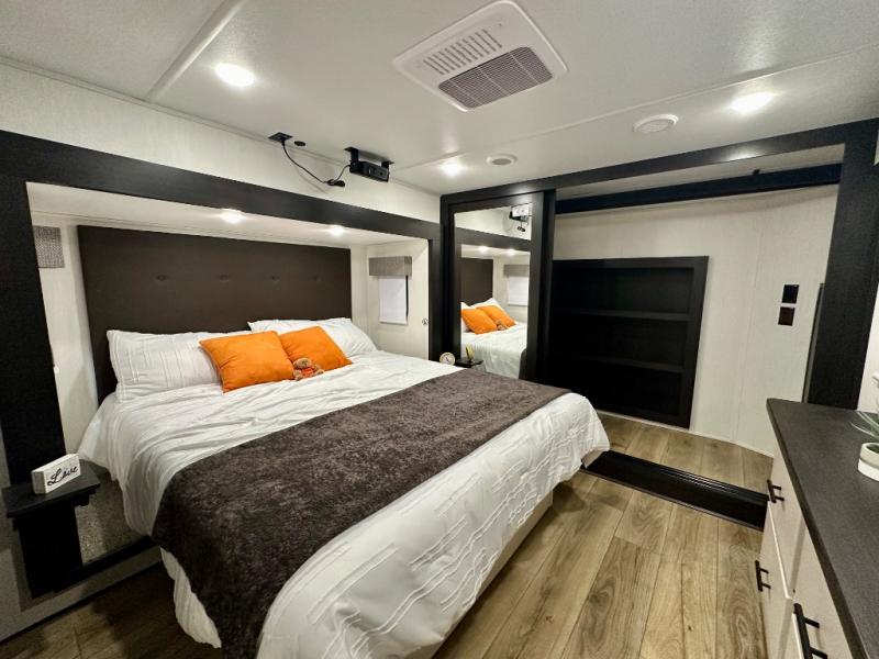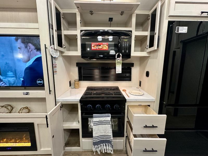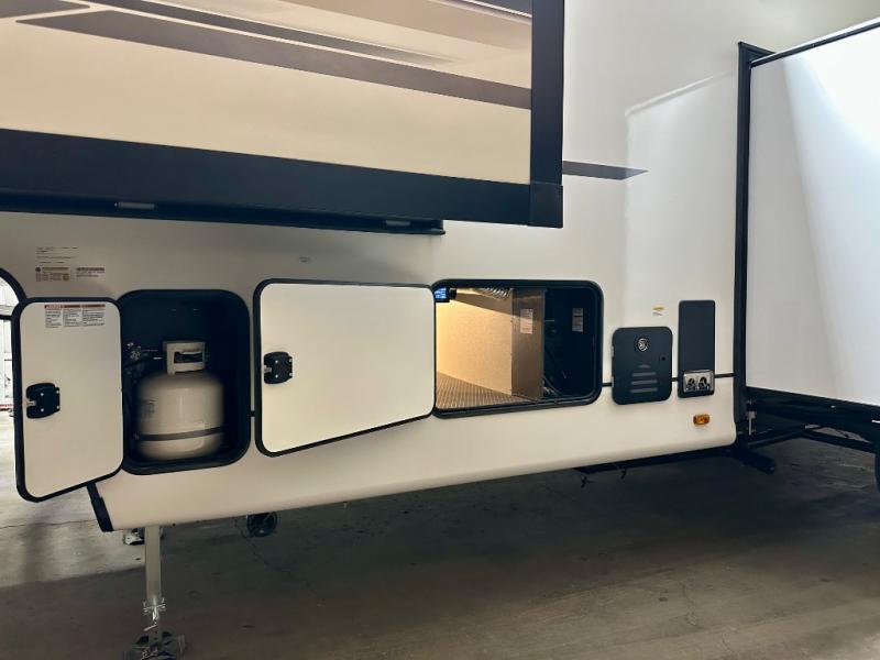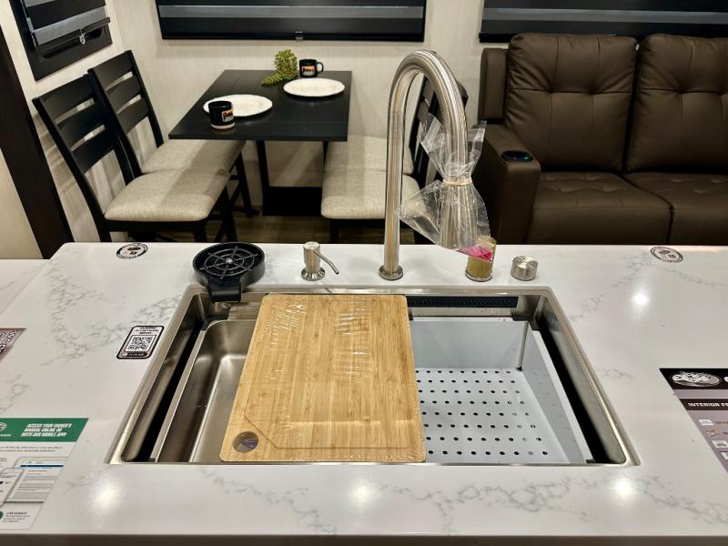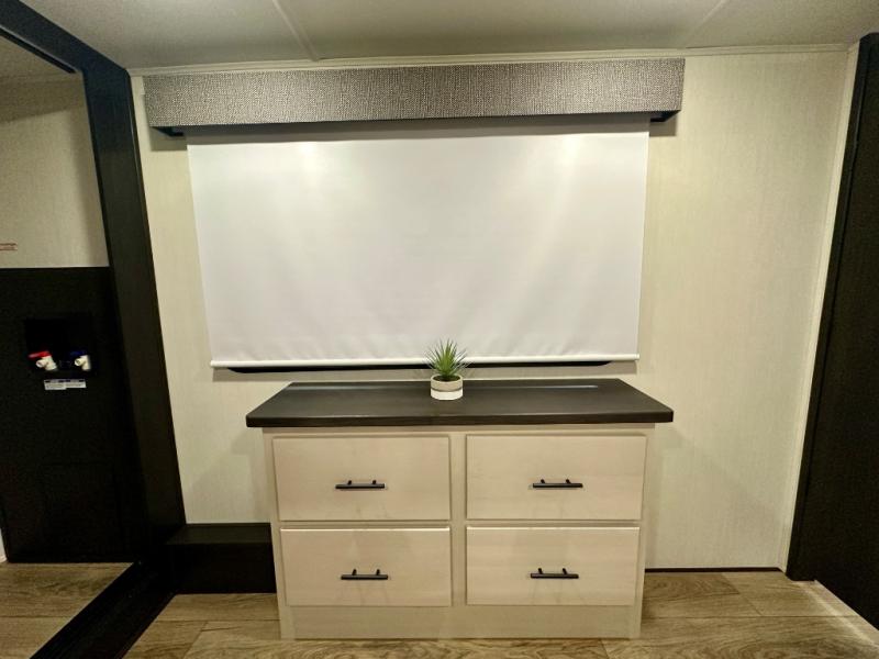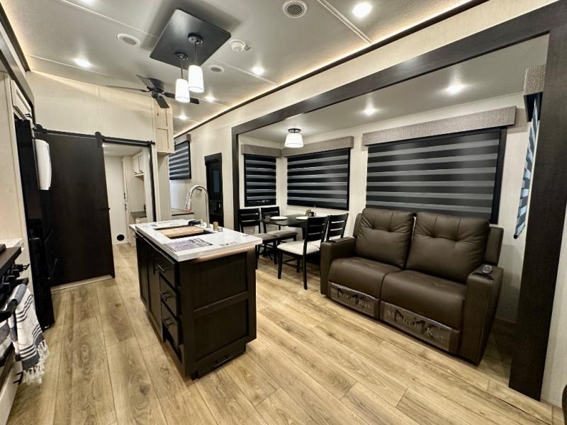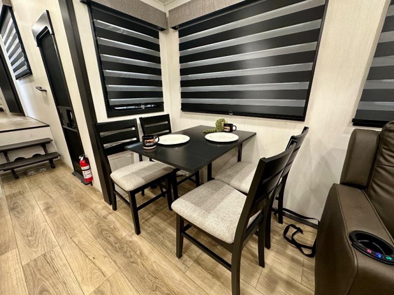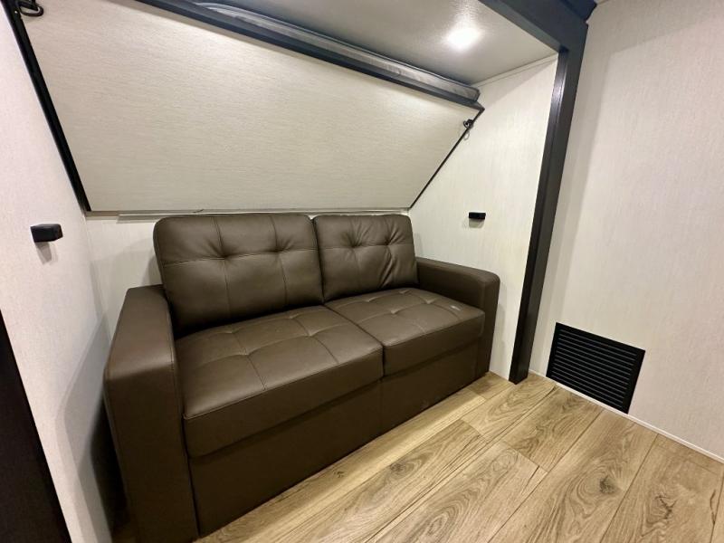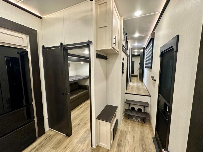 There is much to love in this fifth wheel! Starting with the second bedroom which has a slide that houses a flip-up bunk above a tri-fold sofa across from a desk with drawers, a drop zone, and a wardrobe, plus above all of that is a storage/bunk loft. The rear living area includes a tri-fold sofa, a TV with a hidden pantry behind, and theater seating for two making this space another area at night for guests. In the morning, you can prepare breakfast on the kitchen island, then dine together at the versatile dinette/desk. The full bath will allow you to stay clean throughout your trip, and you'll feel right at home in the front private bedroom with a camper king bed, a dresser, and front wardrobe. Outside, a kitchen and two power awnings create an inviting space!