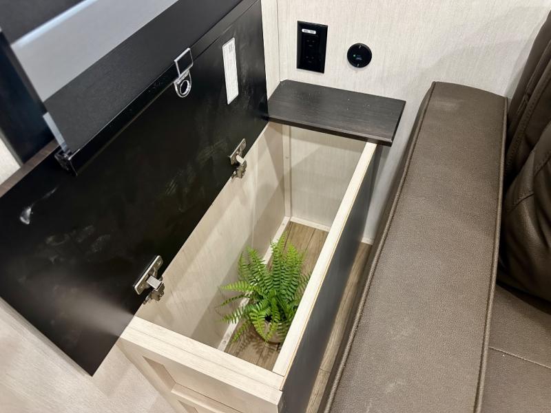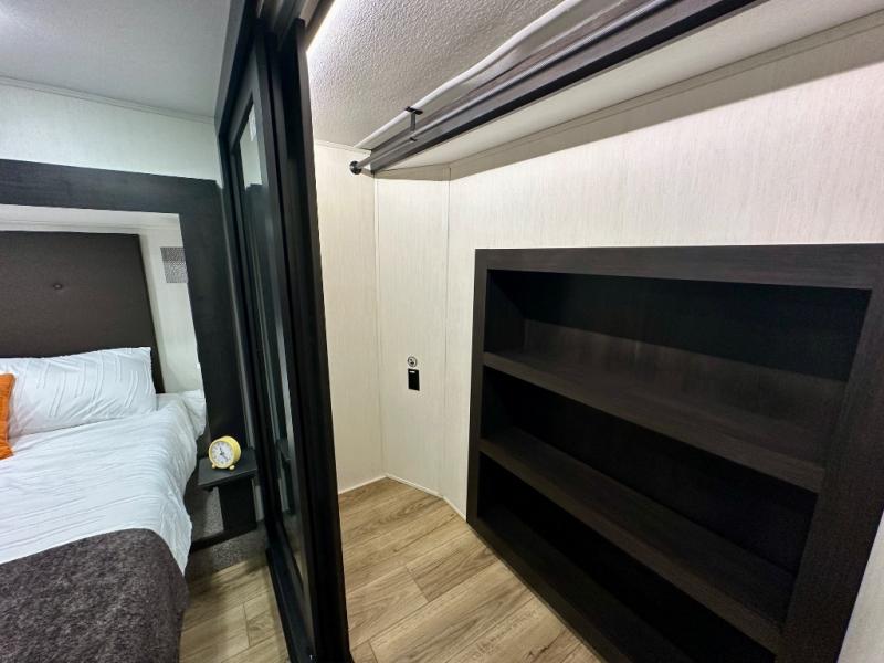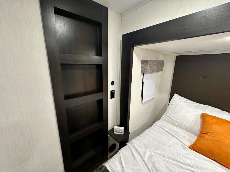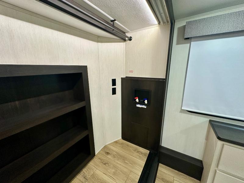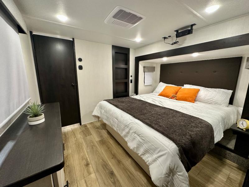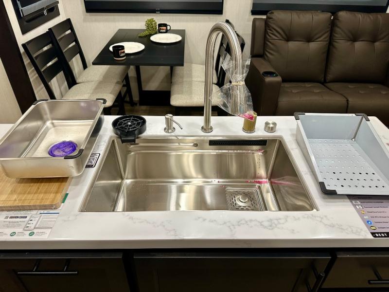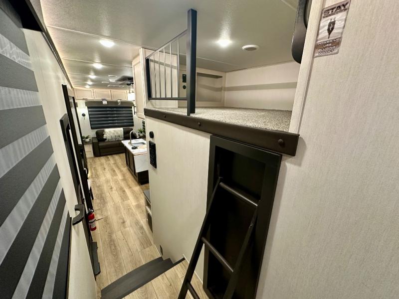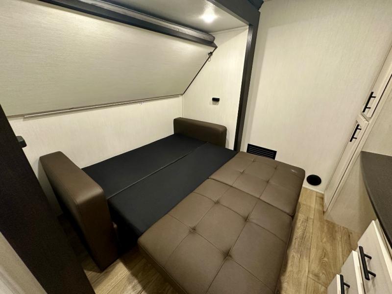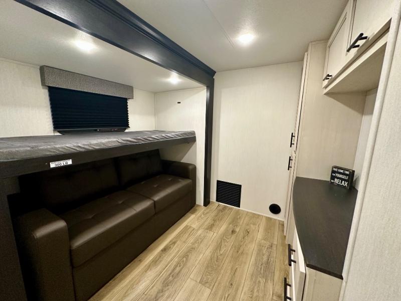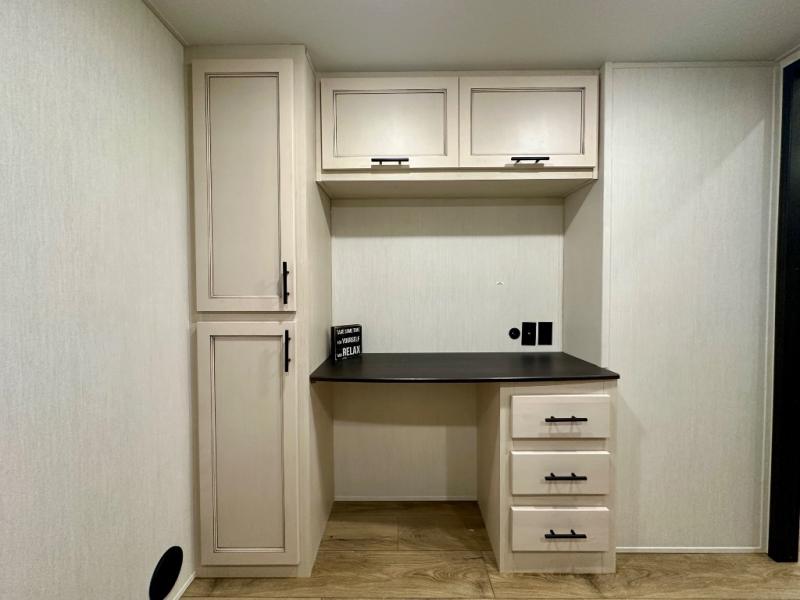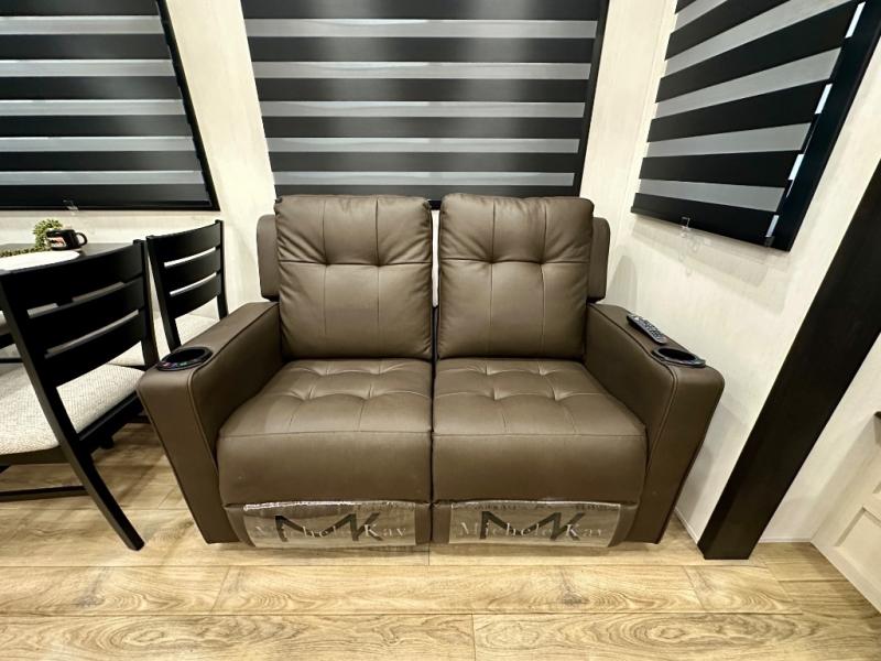 There is much to love in this fifth wheel! Starting with the second bedroom which has a slide that houses a flip-up bunk above a tri-fold sofa across from a desk with drawers, a drop zone, and a wardrobe, plus above all of that is a storage/bunk loft. The rear living area includes a tri-fold sofa, a TV with a hidden pantry behind, and theater seating for two making this space another area at night for guests. In the morning, you can prepare breakfast on the kitchen island, then dine together at the versatile dinette/desk. The full bath will allow you to stay clean throughout your trip, and you'll feel right at home in the front private bedroom with a camper king bed, a dresser, and front wardrobe. Outside, a kitchen and two power awnings create an inviting space!