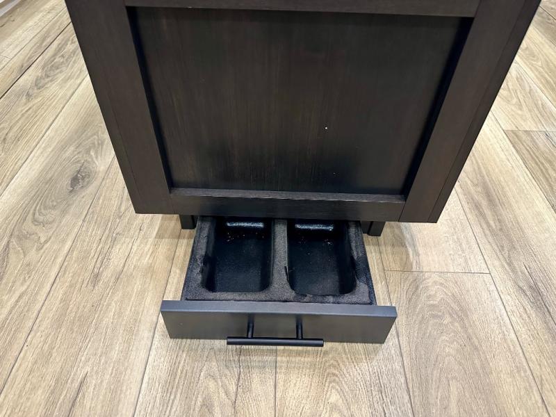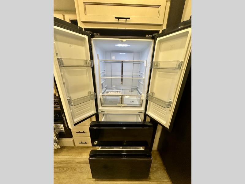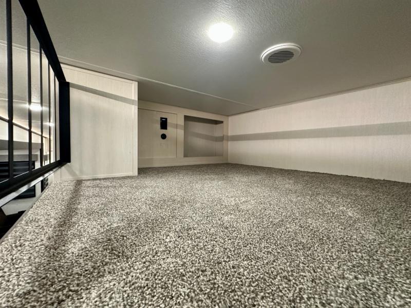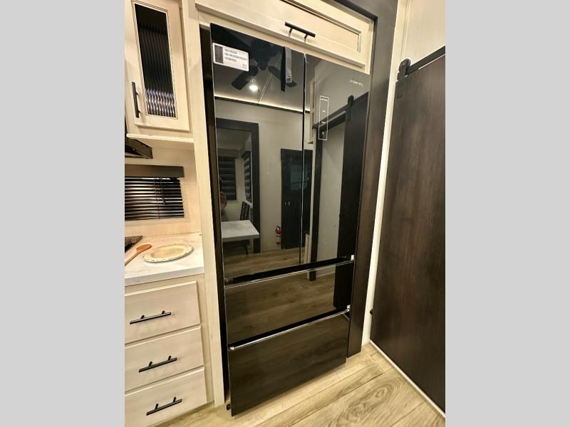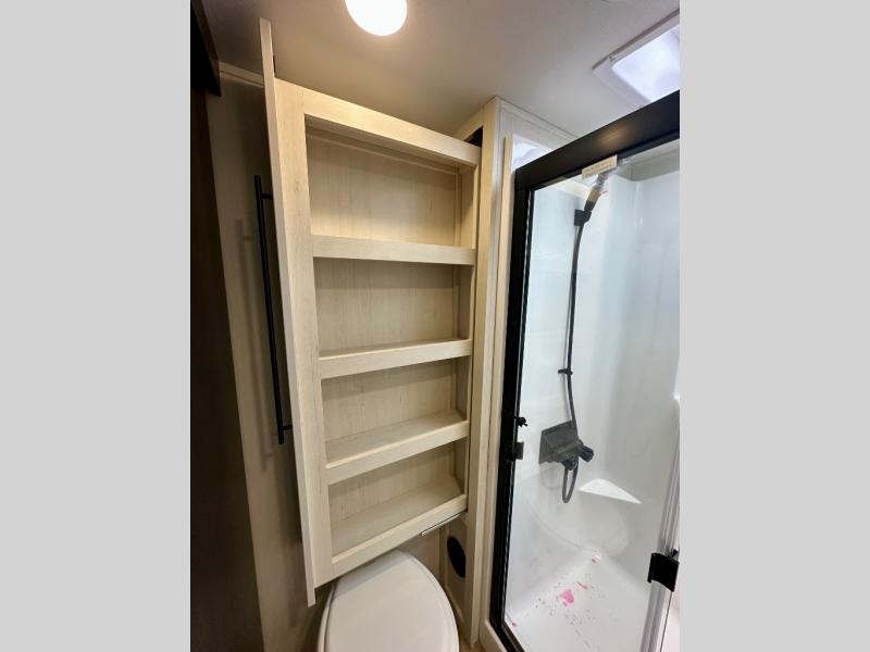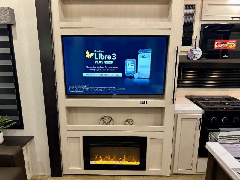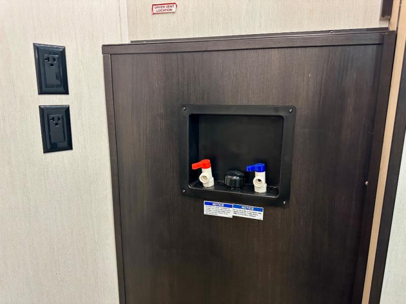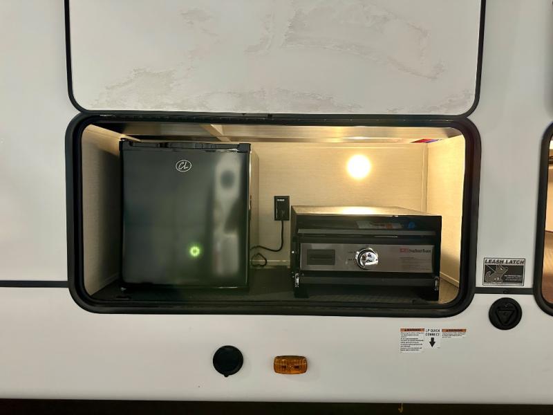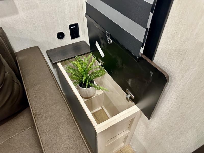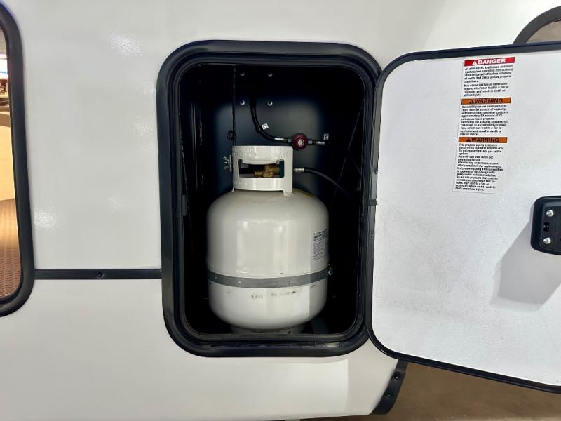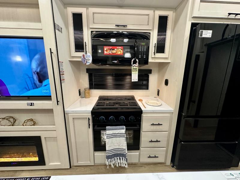 There is much to love in this fifth wheel! Starting with the second bedroom which has a slide that houses a flip-up bunk above a tri-fold sofa across from a desk with drawers, a drop zone, and a wardrobe, plus above all of that is a storage/bunk loft. The rear living area includes a tri-fold sofa, a TV with a hidden pantry behind, and theater seating for two making this space another area at night for guests. In the morning, you can prepare breakfast on the kitchen island, then dine together at the versatile dinette/desk. The full bath will allow you to stay clean throughout your trip, and you'll feel right at home in the front private bedroom with a camper king bed, a dresser, and front wardrobe. Outside, a kitchen and two power awnings create an inviting space!