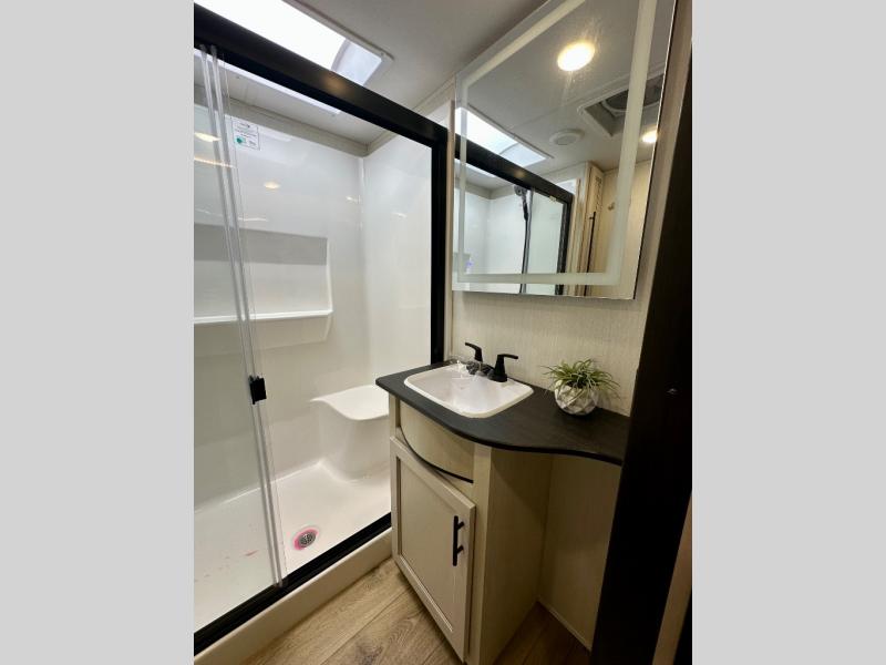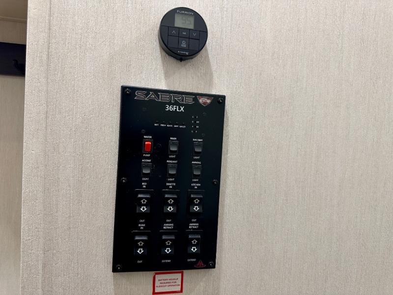 You will experience luxurious camping trips at an affordable price with any one of these Forest River Sabre fifth wheels! These models are durable and ready to travel anytime of the year thanks to features like the high-gloss gel-coat front cap with LED lighting, the PVC roof membrane, and the forced air underbelly with enclosed gate valves. The electric auto-leveling system makes setting up easy and safe, and the adjustable power awning with LED lighting will create an inviting outdoor living space. Each model includes a universal docking station which includes a black tank flush and an outside shower, and adjustable stable steps for you to enter and exit the unit safely. Inside, you will love the design of the ambient accent lighting in the living area, the real wood lumbercore cabinetry, and the linoleum flooring!