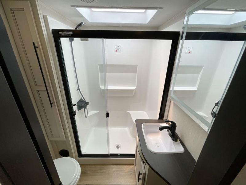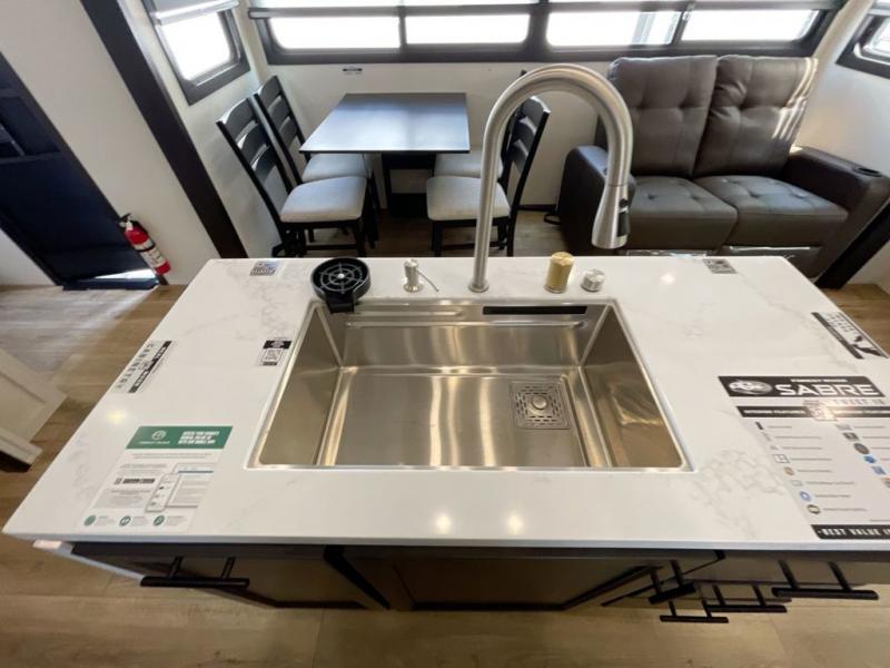 You will experience luxurious camping trips at an affordable price with any one of these Forest River Sabre fifth wheels! These models are durable and ready to travel anytime of the year thanks to features like the high-gloss gel-coat front cap with LED lighting, the PVC roof membrane, and the forced air underbelly with enclosed gate valves. The electric auto-leveling system makes setting up easy and safe, and the adjustable power awning with LED lighting will create an inviting outdoor living space. Each model includes a universal docking station which includes a black tank flush and an outside shower, and adjustable stable steps for you to enter and exit the unit safely. Inside, you will love the design of the ambient accent lighting in the living area, the real wood lumbercore cabinetry, and the linoleum flooring!