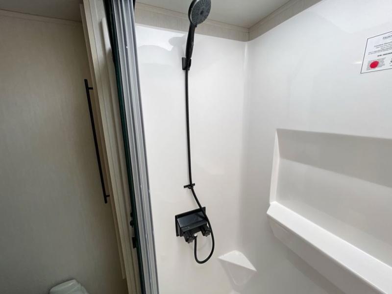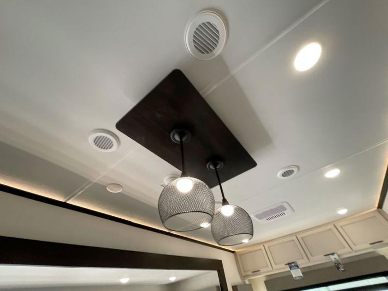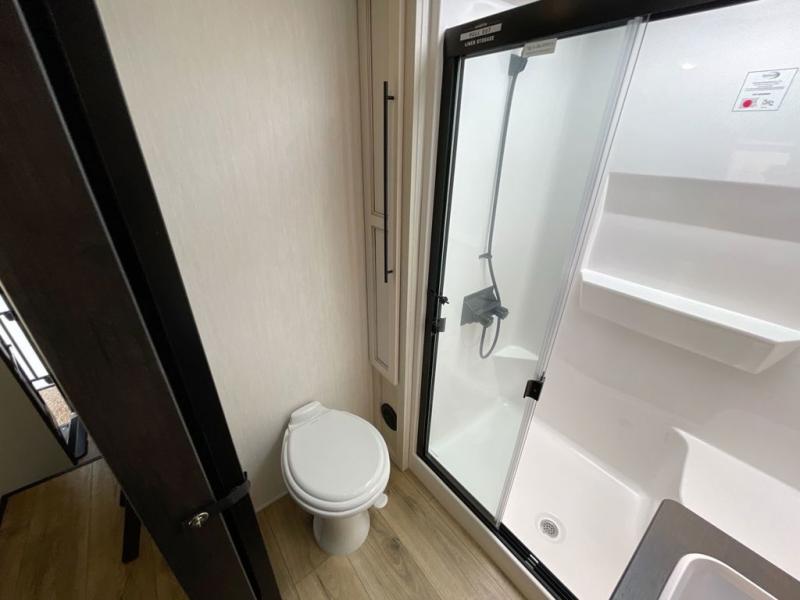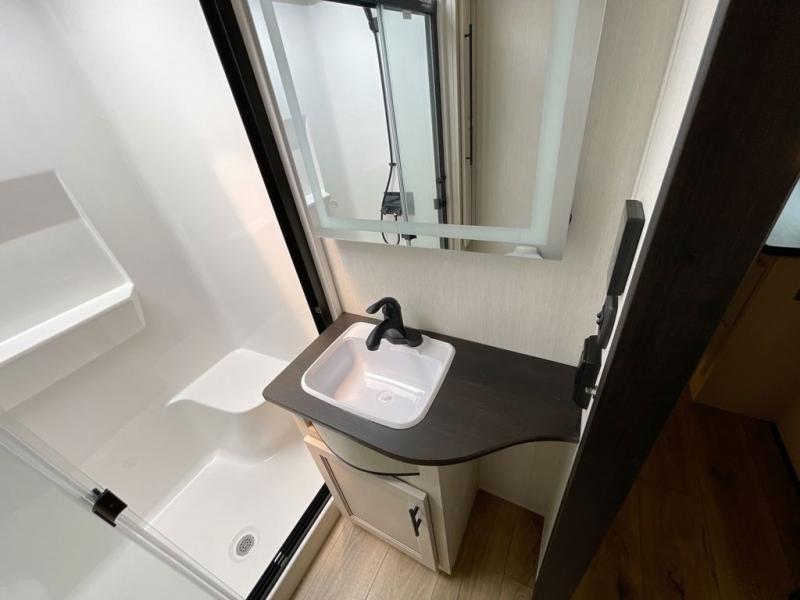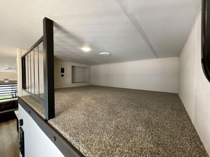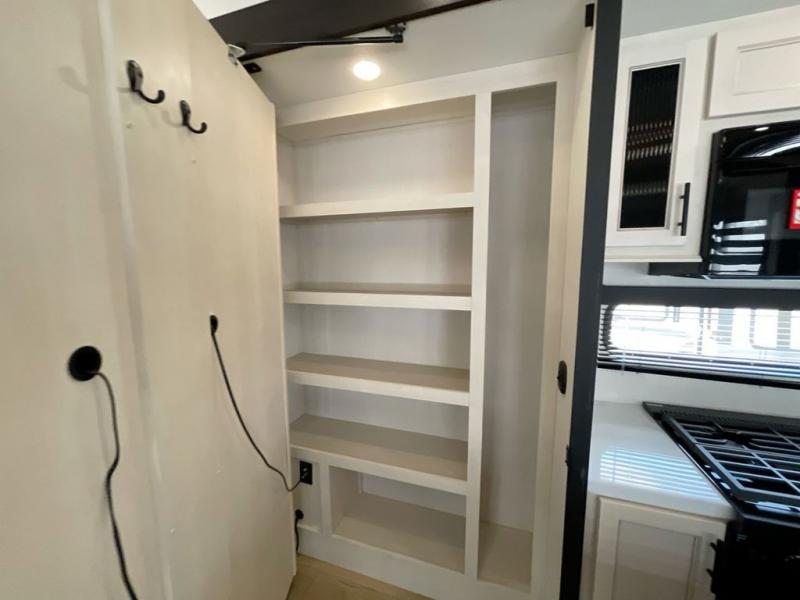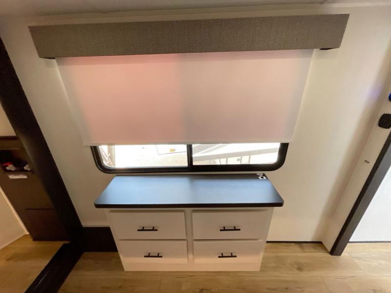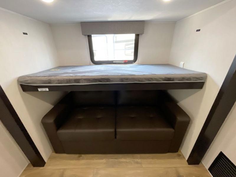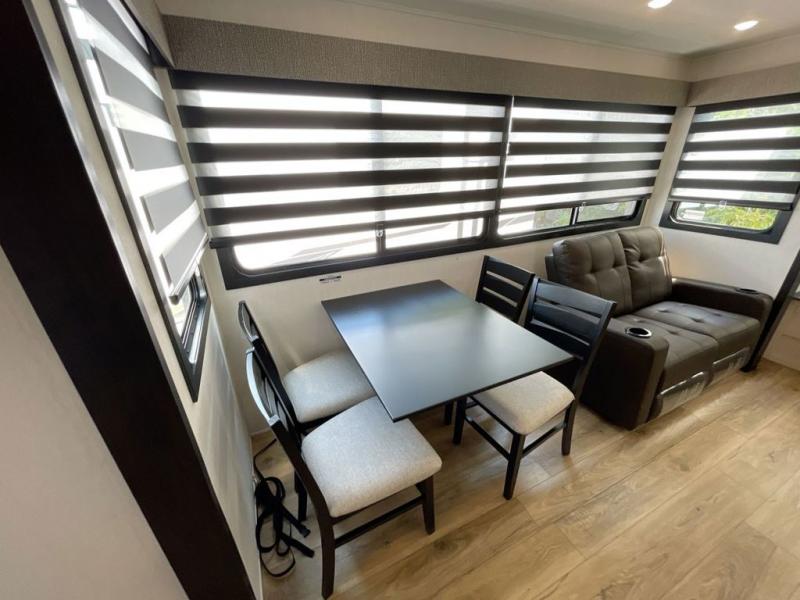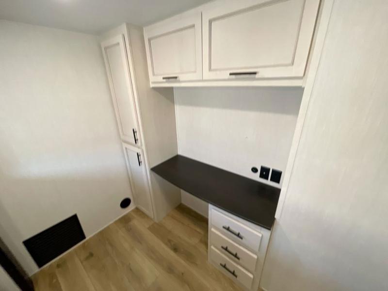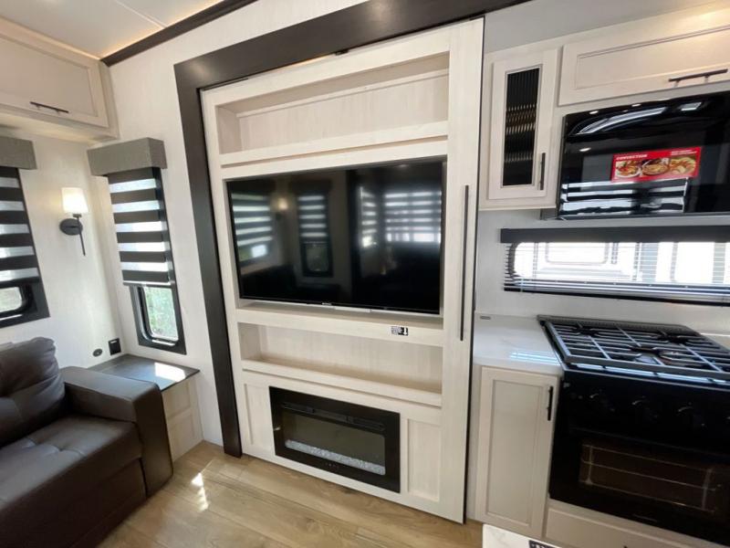 There is much to love in this fifth wheel! Starting with the second bedroom which has a slide that houses a flip-up bunk above a tri-fold sofa across from a desk with drawers, a drop zone, and a wardrobe, plus above all of that is a storage/bunk loft. The rear living area includes a tri-fold sofa, a TV with a hidden pantry behind, and theater seating for two making this space another area at night for guests. In the morning, you can prepare breakfast on the kitchen island, then dine together at the versatile dinette/desk. The full bath will allow you to stay clean throughout your trip, and you'll feel right at home in the front private bedroom with a camper king bed, a dresser, and front wardrobe. Outside, a kitchen and two power awnings create an inviting space!