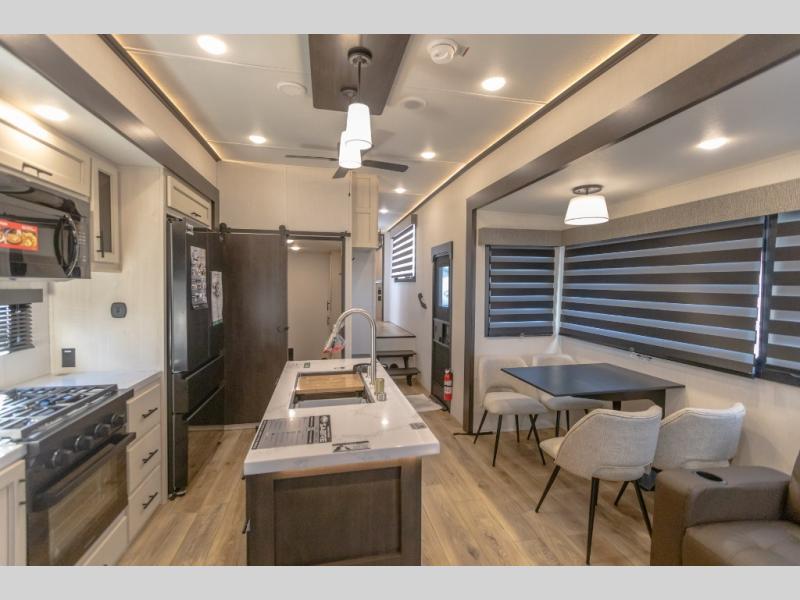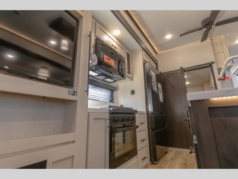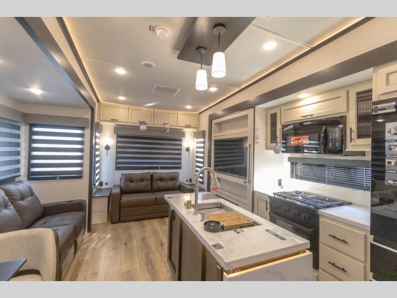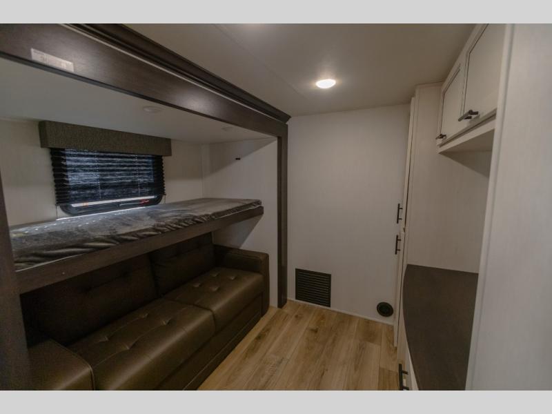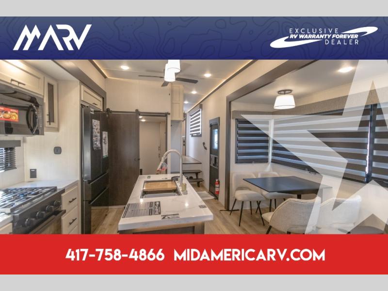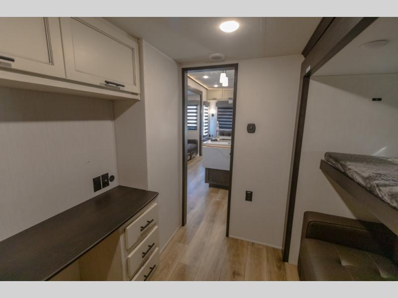 There is much to love in this fifth wheel! Starting with the second bedroom which has a slide that houses a flip-up bunk above a tri-fold sofa across from a desk with drawers, a drop zone, and a wardrobe, plus above all of that is a storage/bunk loft. The rear living area includes a tri-fold sofa, a TV with a hidden pantry behind, and theater seating for two making this space another area at night for guests. In the morning, you can prepare breakfast on the kitchen island, then dine together at the versatile dinette/desk. The full bath will allow you to stay clean throughout your trip, and you'll feel right at home in the front private bedroom with a camper king bed, a dresser, and front wardrobe. Outside, a kitchen and two power awnings create an inviting space!