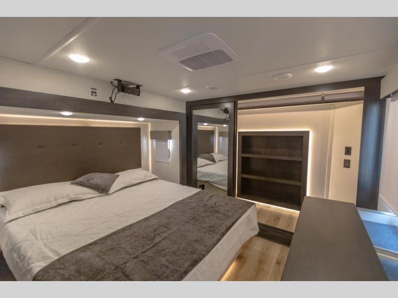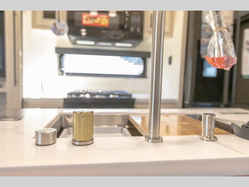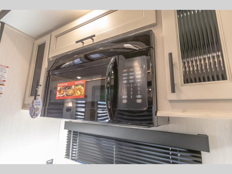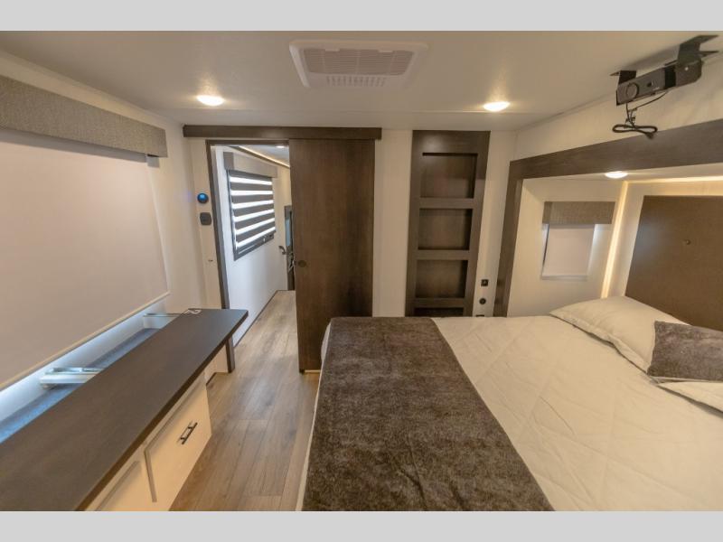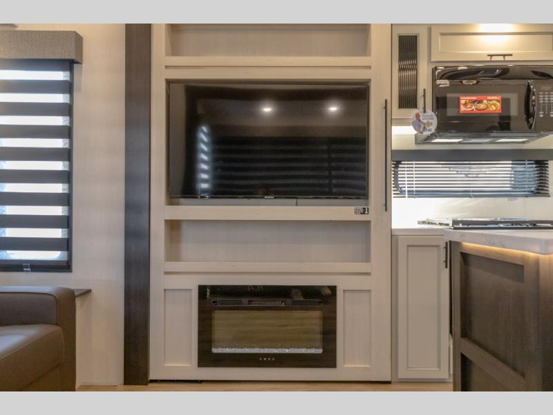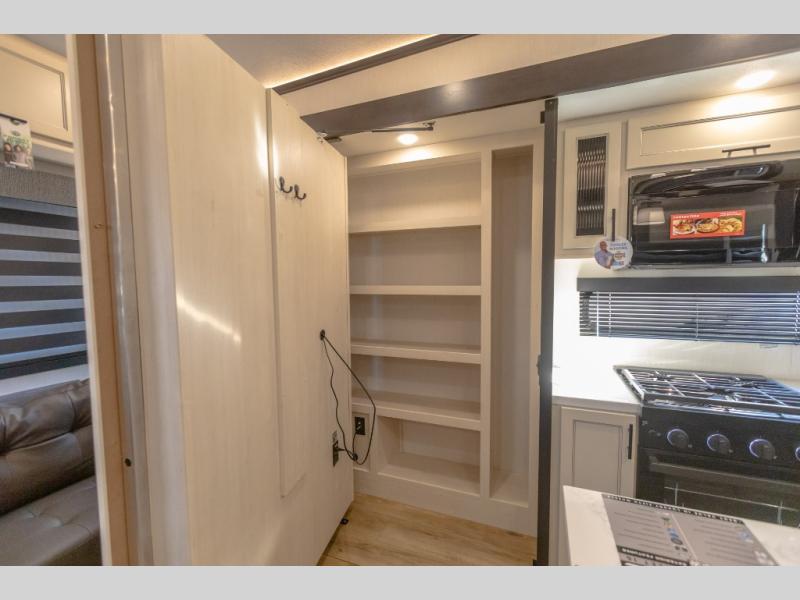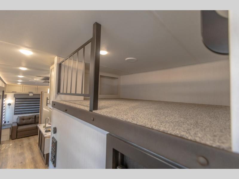 There is much to love in this fifth wheel! Starting with the second bedroom which has a slide that houses a flip-up bunk above a tri-fold sofa across from a desk with drawers, a drop zone, and a wardrobe, plus above all of that is a storage/bunk loft. The rear living area includes a tri-fold sofa, a TV with a hidden pantry behind, and theater seating for two making this space another area at night for guests. In the morning, you can prepare breakfast on the kitchen island, then dine together at the versatile dinette/desk. The full bath will allow you to stay clean throughout your trip, and you'll feel right at home in the front private bedroom with a camper king bed, a dresser, and front wardrobe. Outside, a kitchen and two power awnings create an inviting space!
