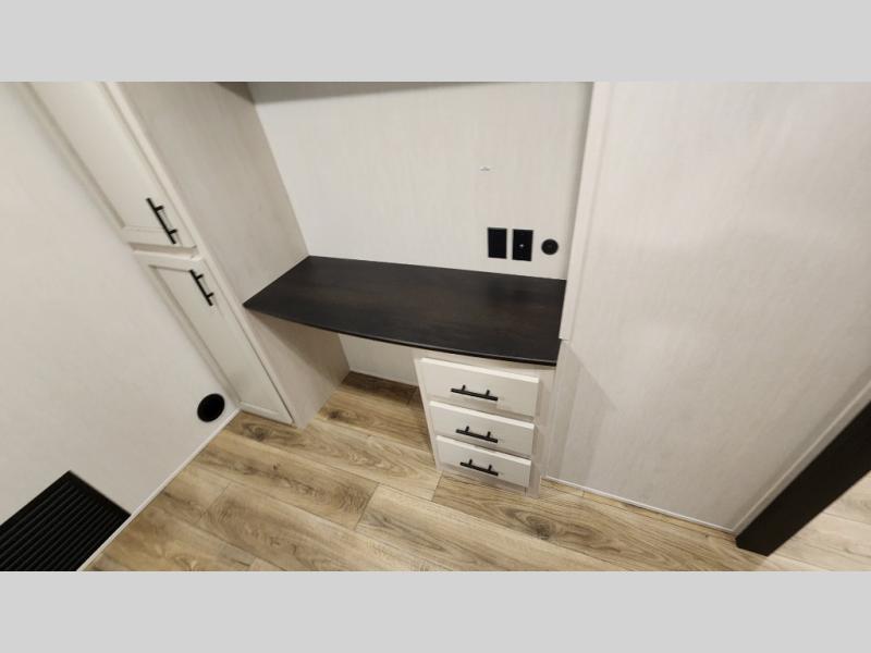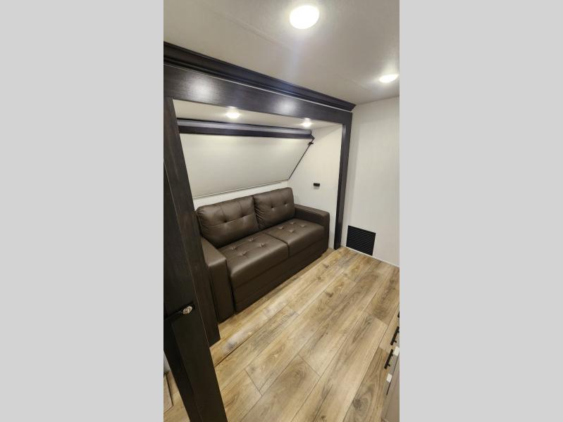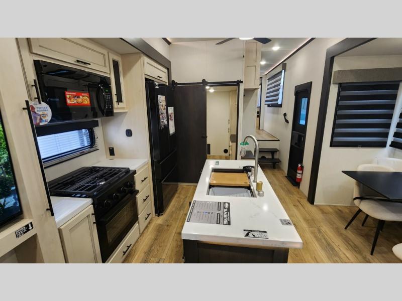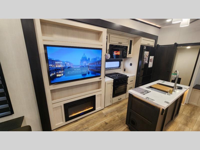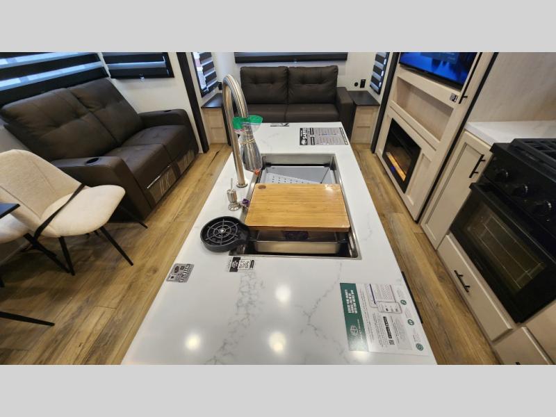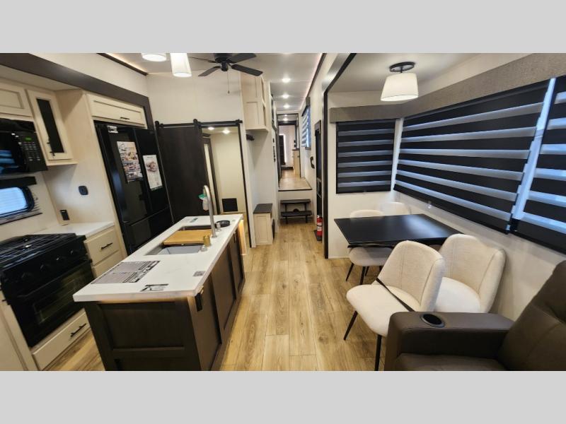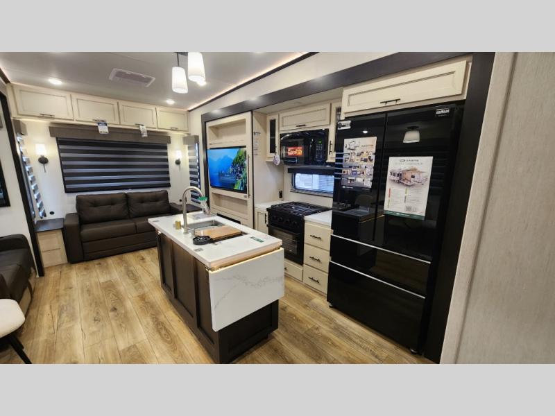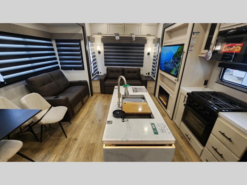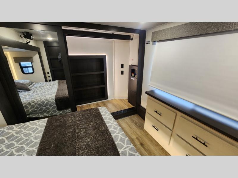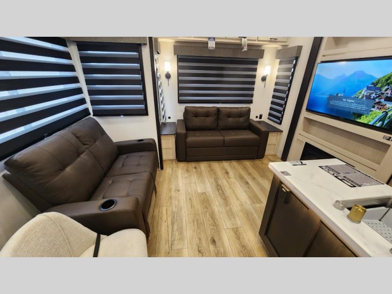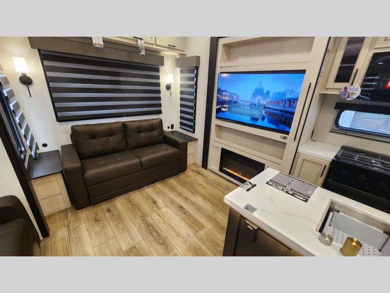 There is much to love in this fifth wheel! Starting with the second bedroom which has a slide that houses a flip-up bunk above a tri-fold sofa across from a desk with drawers, a drop zone, and a wardrobe, plus above all of that is a storage/bunk loft. The rear living area includes a tri-fold sofa, a TV with a hidden pantry behind, and theater seating for two making this space another area at night for guests. In the morning, you can prepare breakfast on the kitchen island, then dine together at the versatile dinette/desk. The full bath will allow you to stay clean throughout your trip, and you'll feel right at home in the front private bedroom with a camper king bed, a dresser, and front wardrobe. Outside, a kitchen and two power awnings create an inviting space!