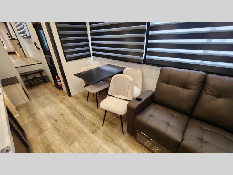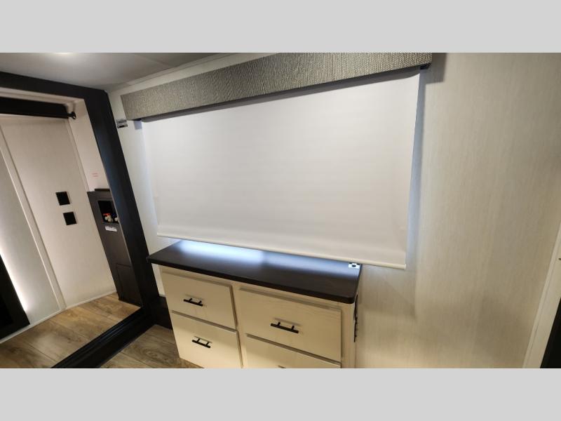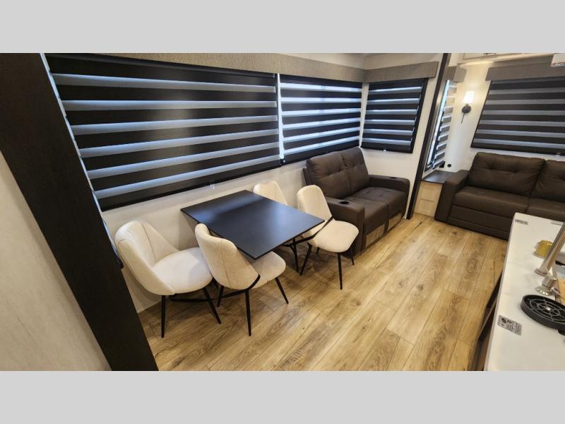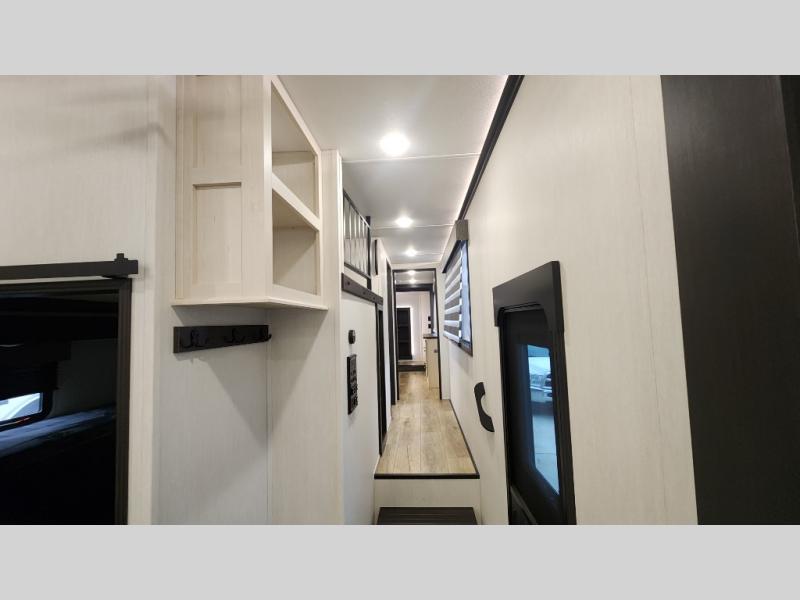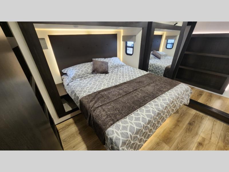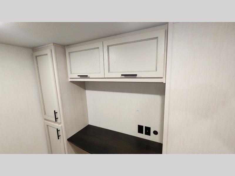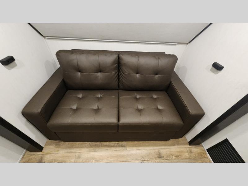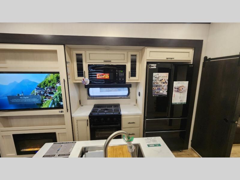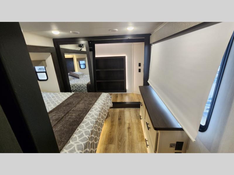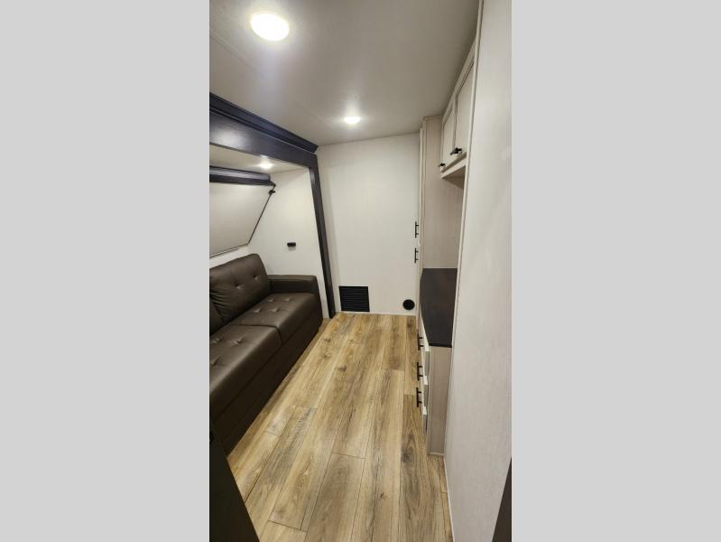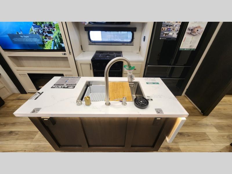 There is much to love in this fifth wheel! Starting with the second bedroom which has a slide that houses a flip-up bunk above a tri-fold sofa across from a desk with drawers, a drop zone, and a wardrobe, plus above all of that is a storage/bunk loft. The rear living area includes a tri-fold sofa, a TV with a hidden pantry behind, and theater seating for two making this space another area at night for guests. In the morning, you can prepare breakfast on the kitchen island, then dine together at the versatile dinette/desk. The full bath will allow you to stay clean throughout your trip, and you'll feel right at home in the front private bedroom with a camper king bed, a dresser, and front wardrobe. Outside, a kitchen and two power awnings create an inviting space!