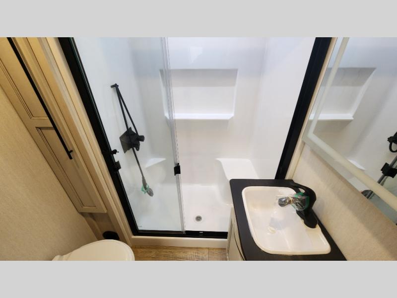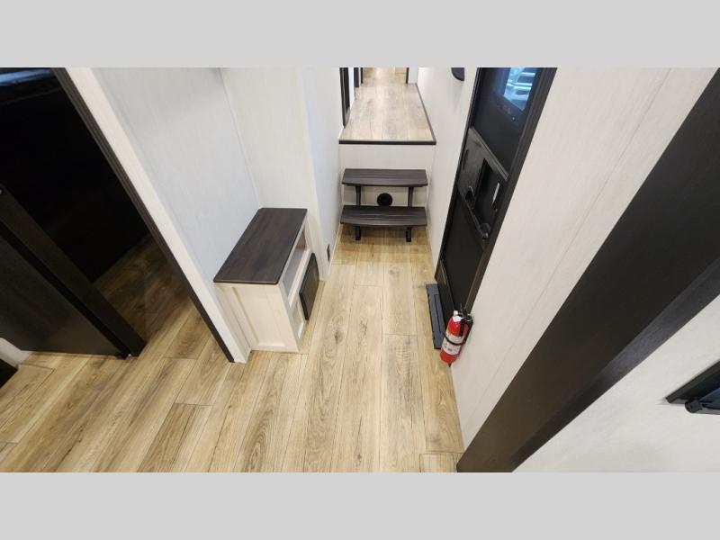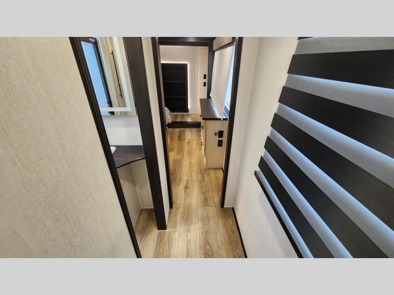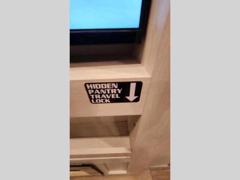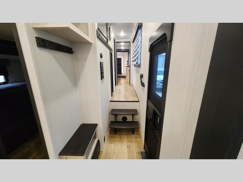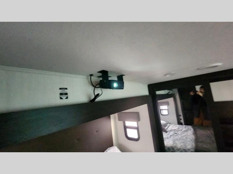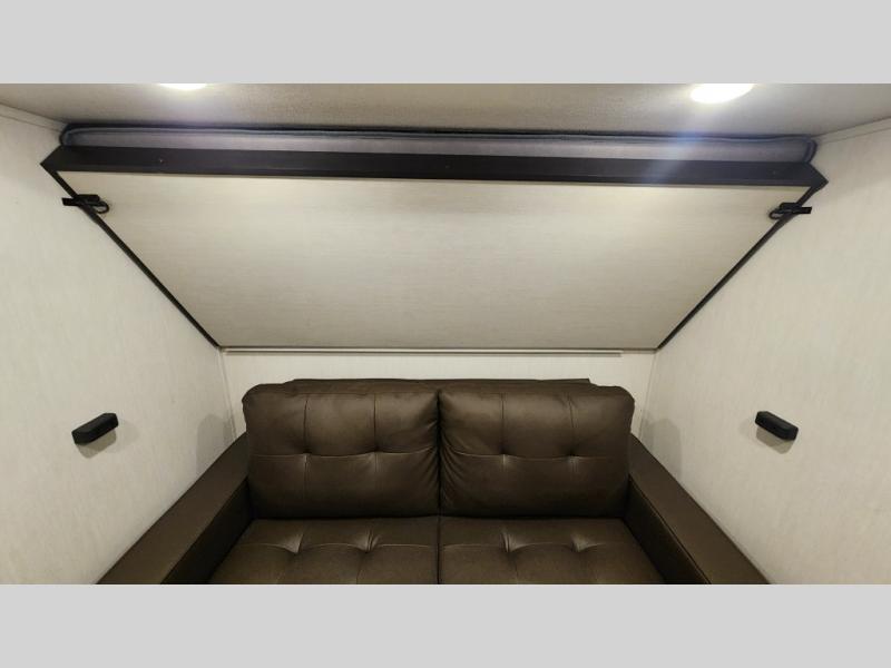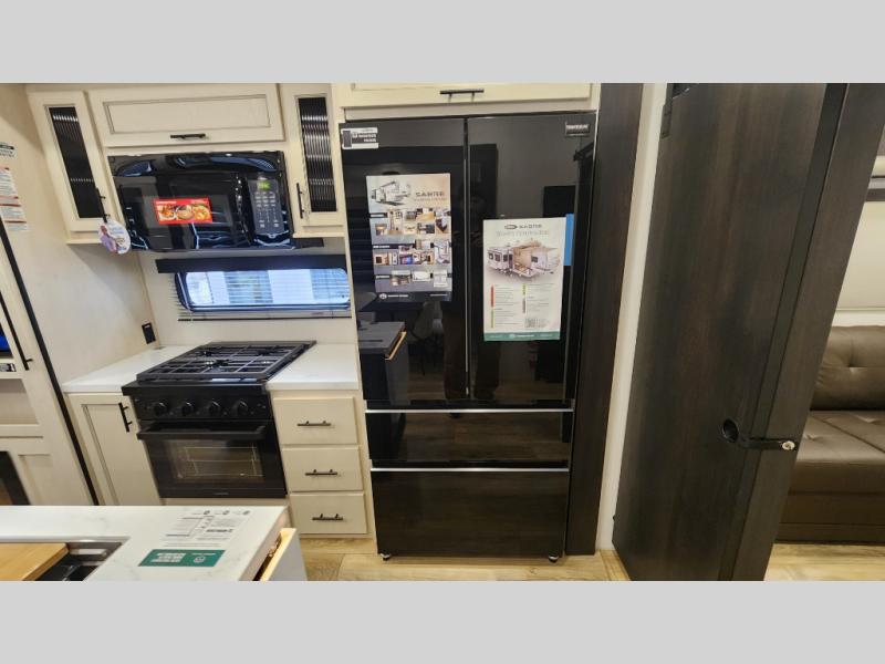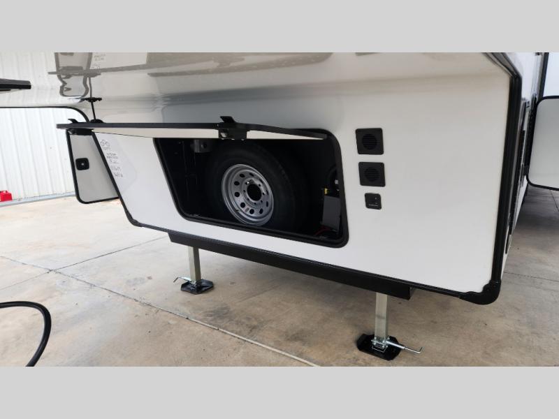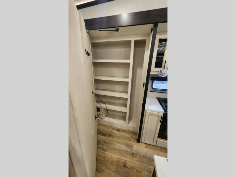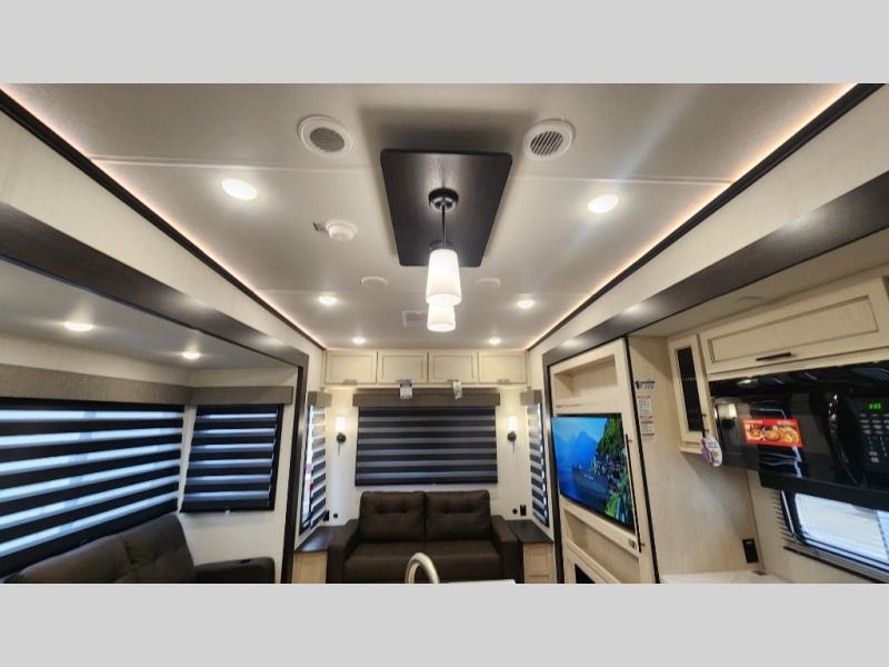 There is much to love in this fifth wheel! Starting with the second bedroom which has a slide that houses a flip-up bunk above a tri-fold sofa across from a desk with drawers, a drop zone, and a wardrobe, plus above all of that is a storage/bunk loft. The rear living area includes a tri-fold sofa, a TV with a hidden pantry behind, and theater seating for two making this space another area at night for guests. In the morning, you can prepare breakfast on the kitchen island, then dine together at the versatile dinette/desk. The full bath will allow you to stay clean throughout your trip, and you'll feel right at home in the front private bedroom with a camper king bed, a dresser, and front wardrobe. Outside, a kitchen and two power awnings create an inviting space!