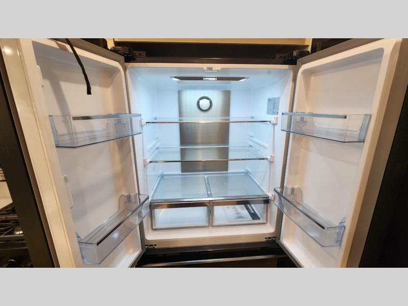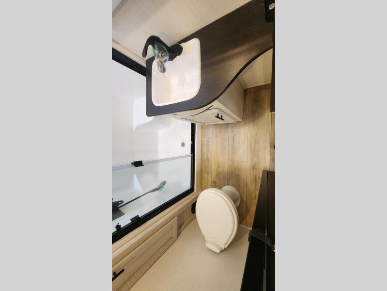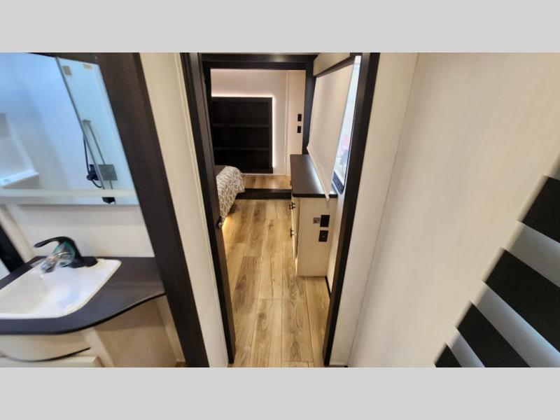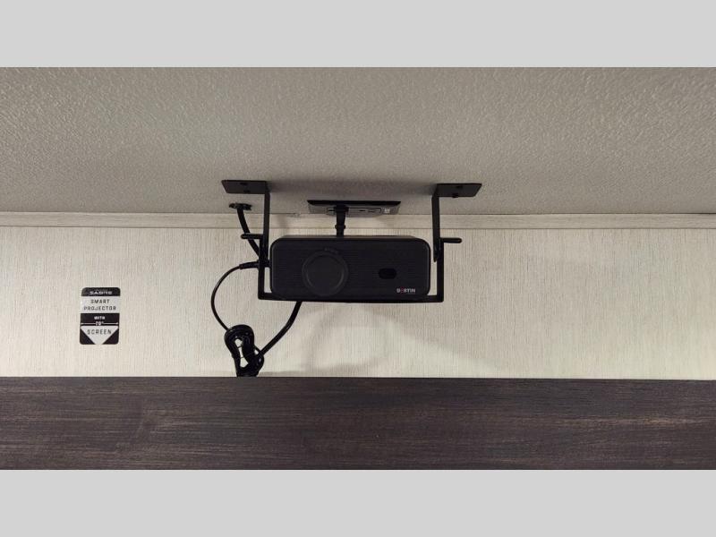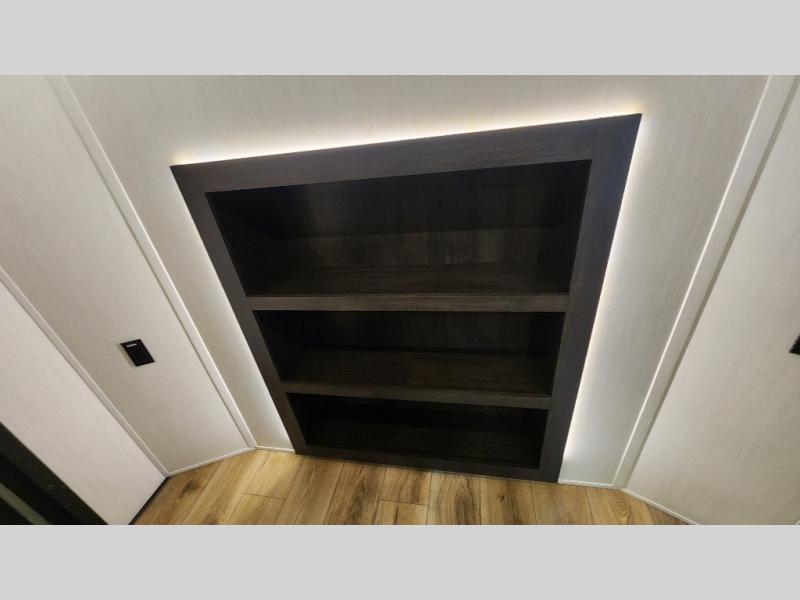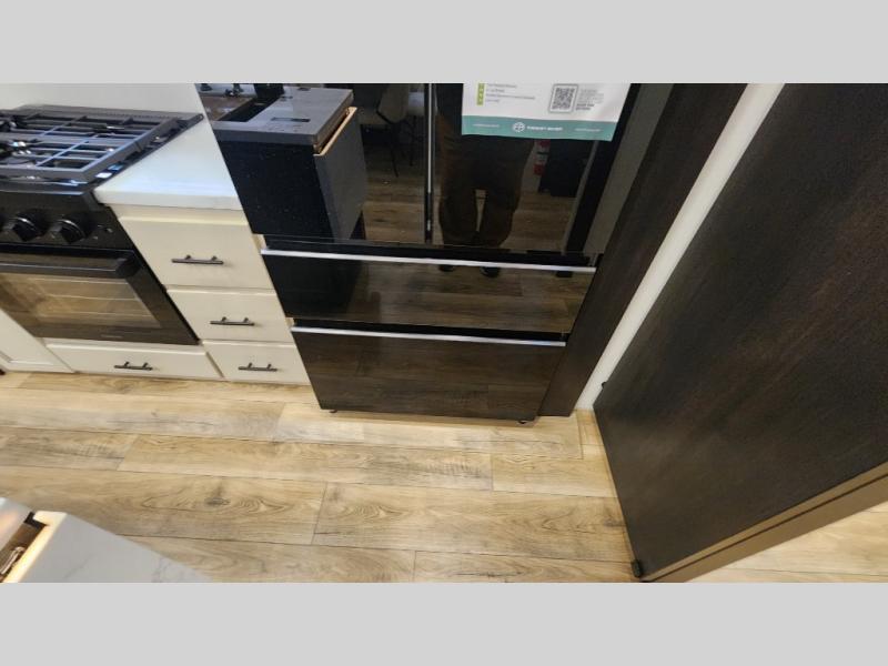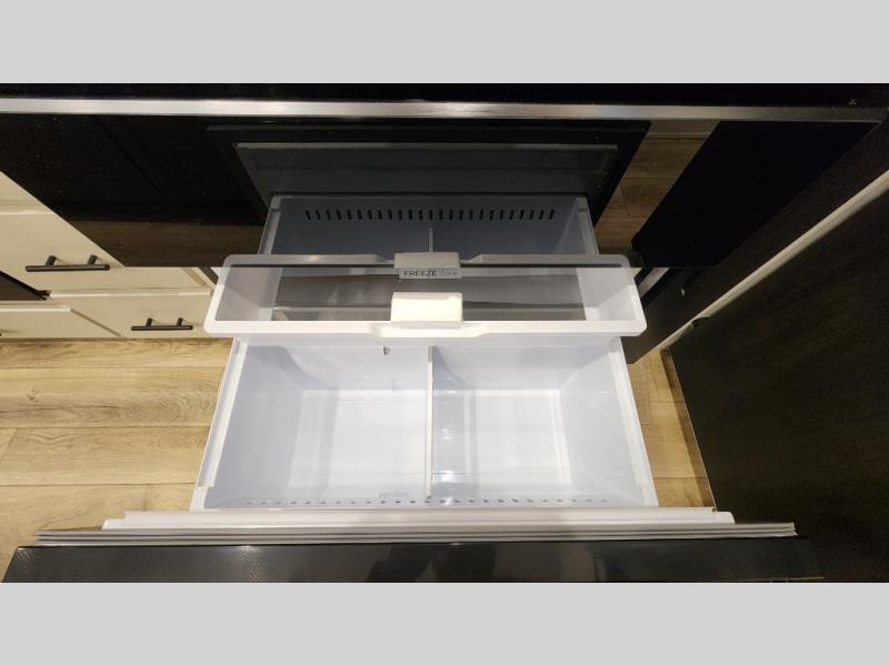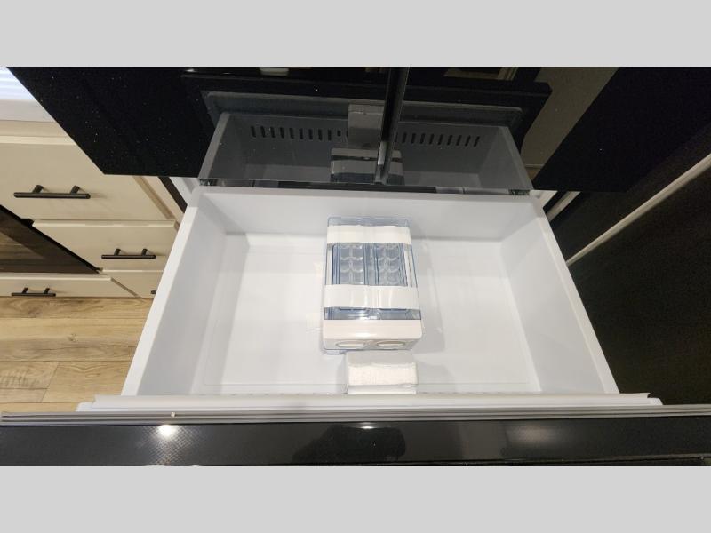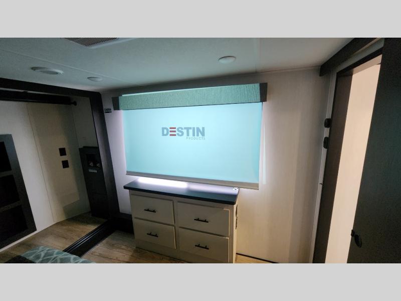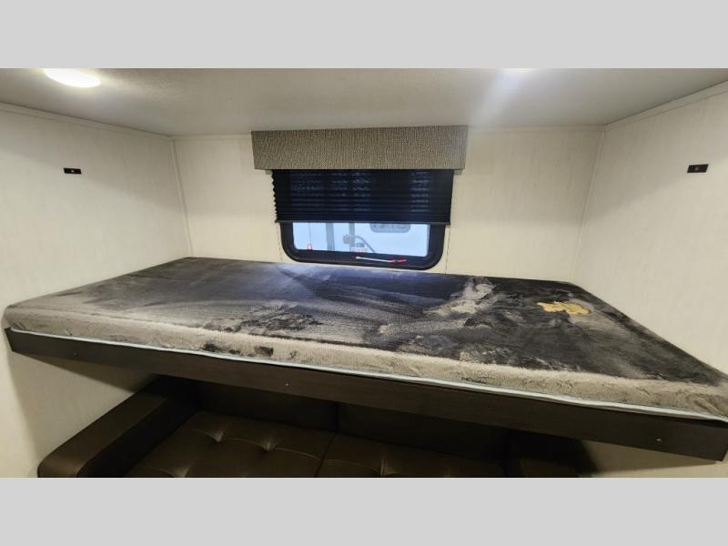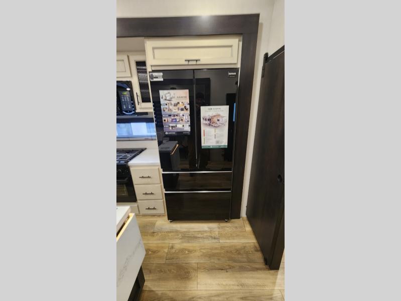 There is much to love in this fifth wheel! Starting with the second bedroom which has a slide that houses a flip-up bunk above a tri-fold sofa across from a desk with drawers, a drop zone, and a wardrobe, plus above all of that is a storage/bunk loft. The rear living area includes a tri-fold sofa, a TV with a hidden pantry behind, and theater seating for two making this space another area at night for guests. In the morning, you can prepare breakfast on the kitchen island, then dine together at the versatile dinette/desk. The full bath will allow you to stay clean throughout your trip, and you'll feel right at home in the front private bedroom with a camper king bed, a dresser, and front wardrobe. Outside, a kitchen and two power awnings create an inviting space!