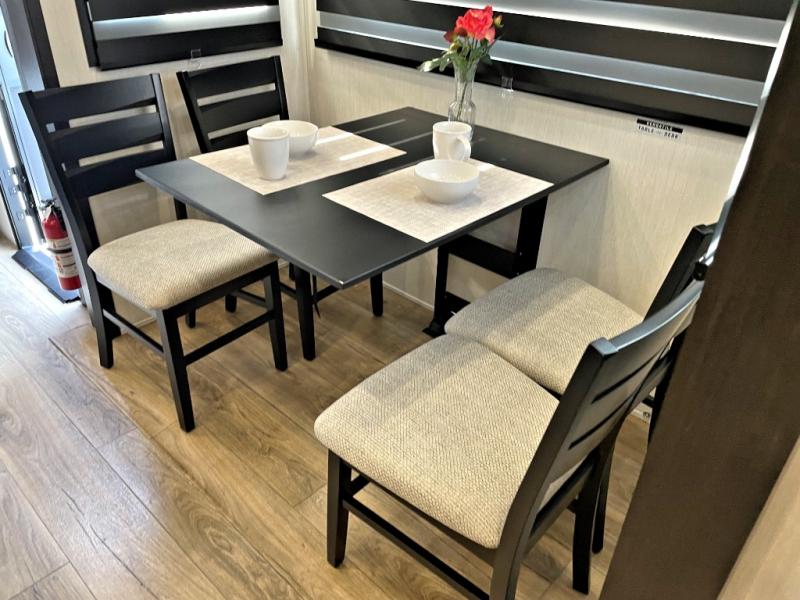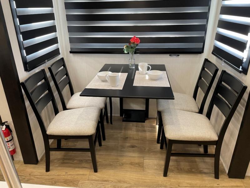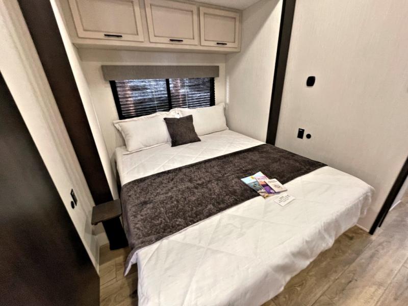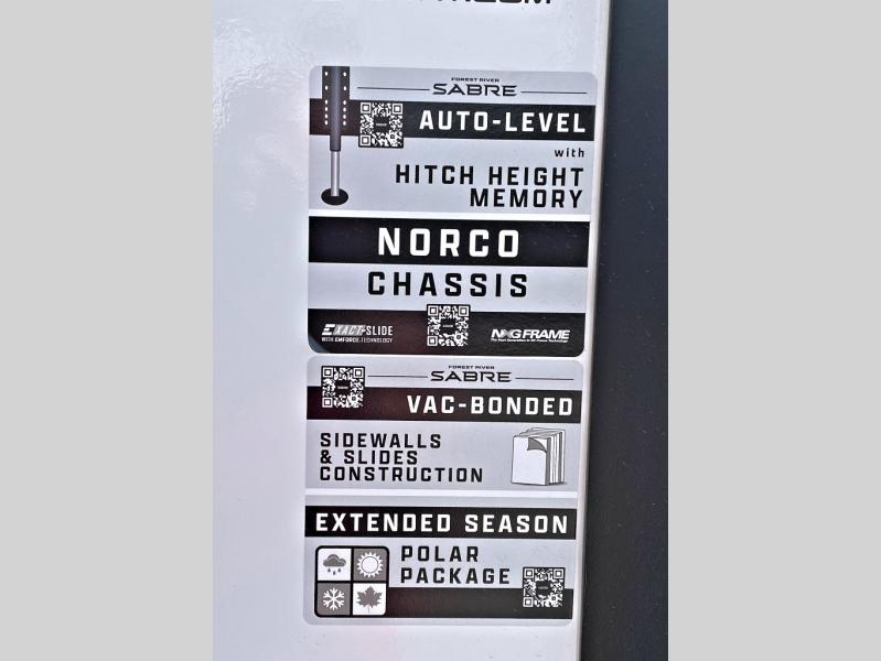 You will experience luxurious camping trips at an affordable price with any one of these Forest River Sabre fifth wheels! These models are durable and ready to travel anytime of the year thanks to features like the high-gloss gel-coat front cap with LED lighting, the PVC roof membrane, and the forced air underbelly with enclosed gate valves. The electric auto-leveling system makes setting up easy and safe, and the adjustable power awning with LED lighting will create an inviting outdoor living space. Each model includes a universal docking station which includes a black tank flush and an outside shower, and detachable and adjustable stable steps for you to enter and exit the unit safely. Inside, you will love the design of the ambient accent lighting in the living area, the real wood lumbercore cabinetry, and the linoleum flooring!
