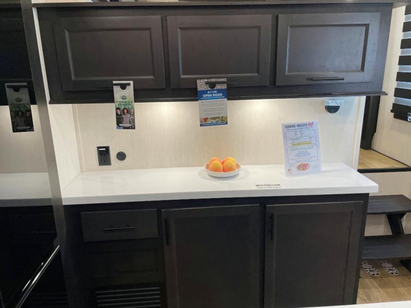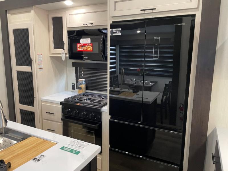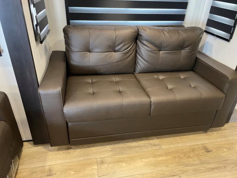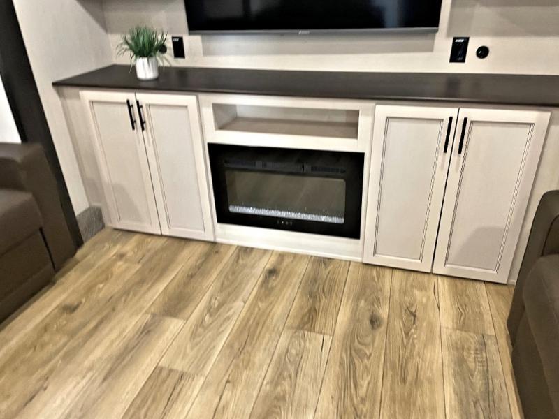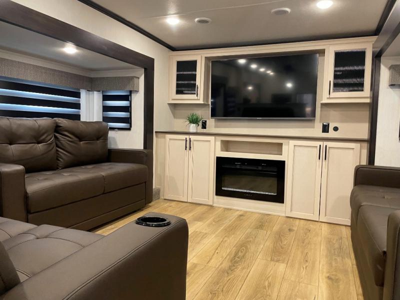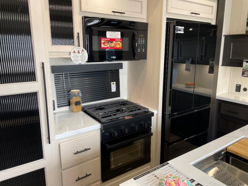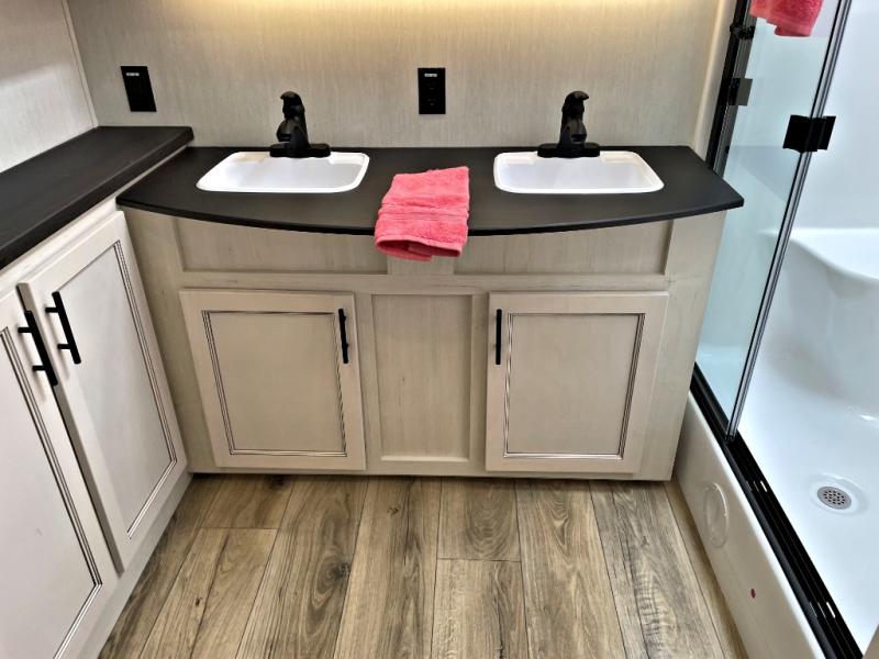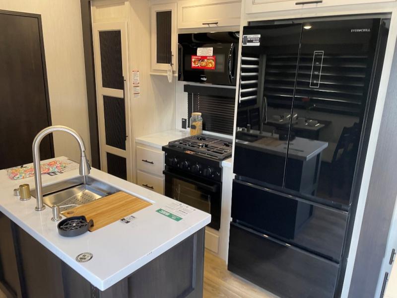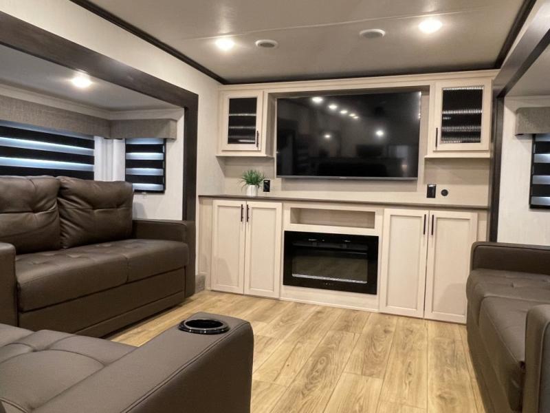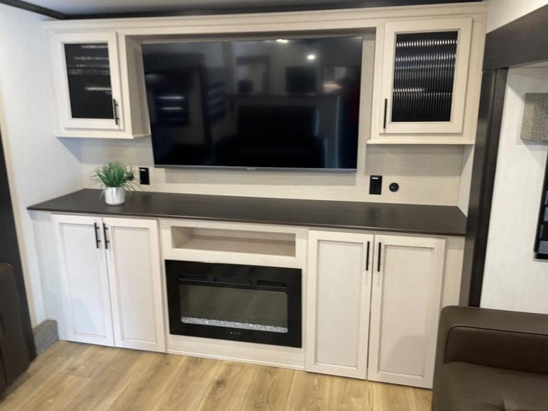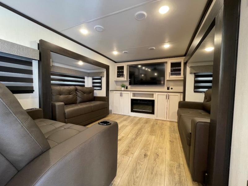 This Sabre fifth wheel with a full and half bath is sure to be a crowd pleaser! The front living area is the perfect place for everyone to visit each other comfortably on the two tri-fold sofas that can be transformed into extra sleeping spaces, or at the theater seating for complete relaxation. You will also find an entertainment center with a fireplace and a TV. This Sabre has a kitchen filled with convenient features, such as a 12V refrigerator with French doors, a kitchen island, and a lighted pantry with motion sensors. The rear master suite has access to its very own full bathroom with a double-sink vanity for two to get ready at once, and a wardrobe with washer and dryer prep for convenience!