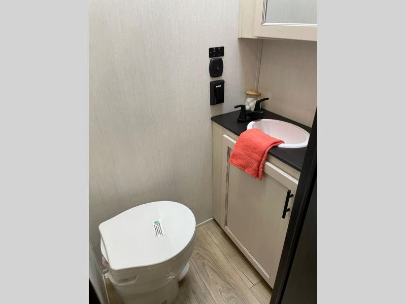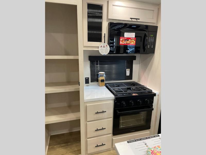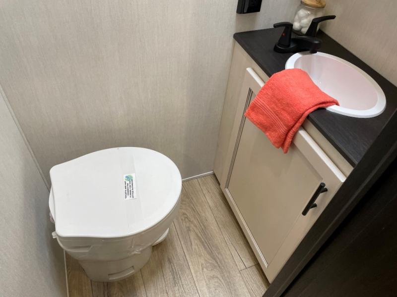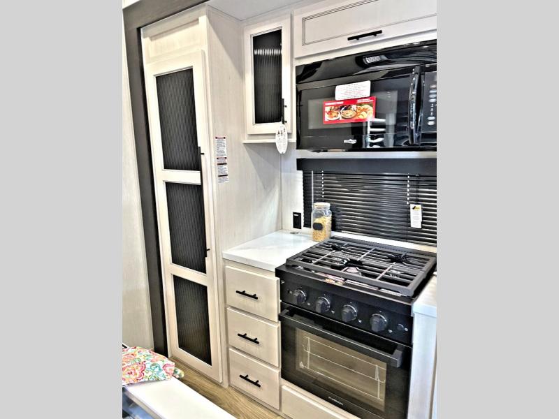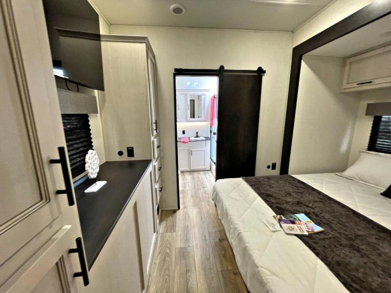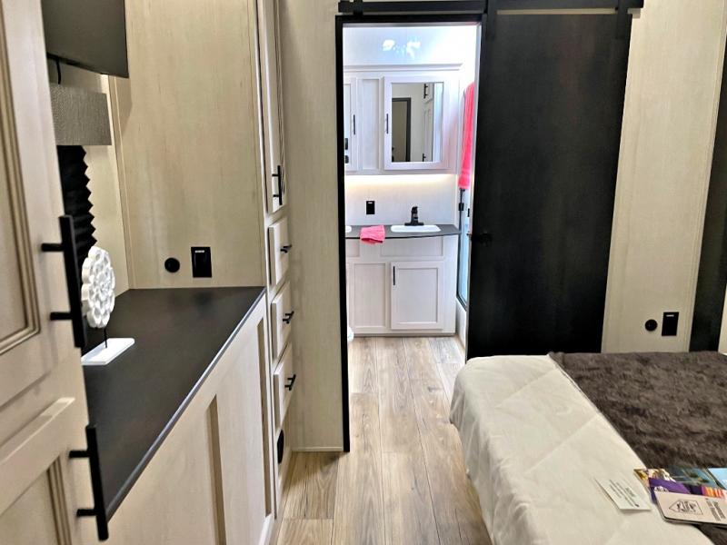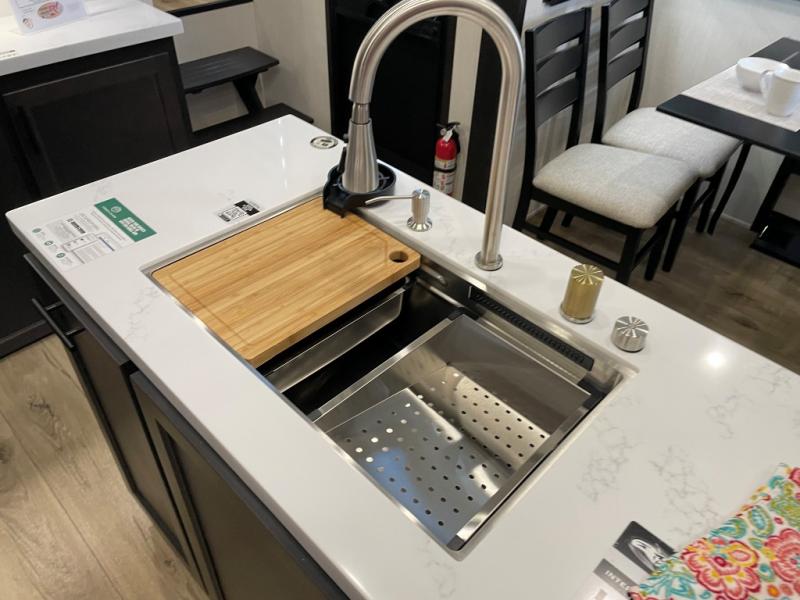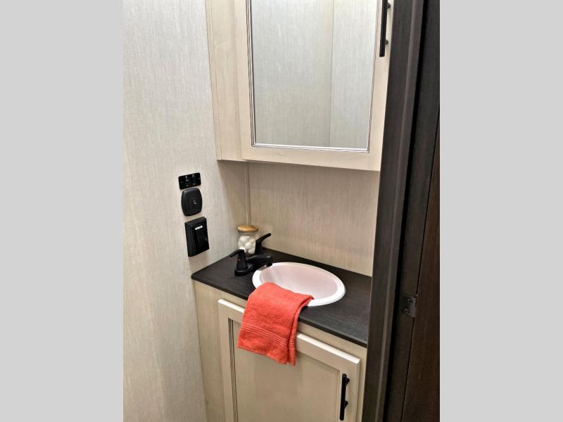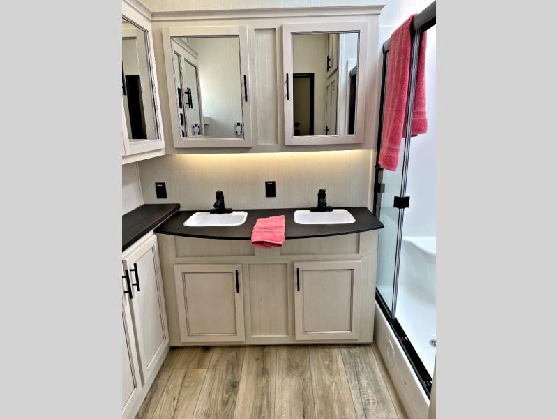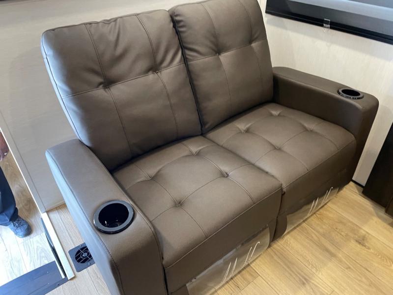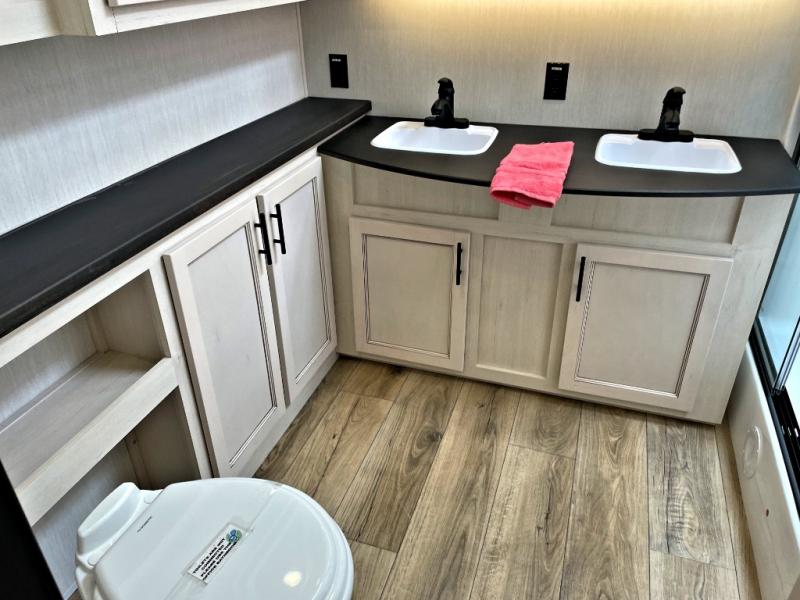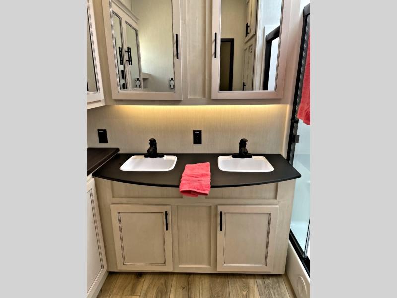 This Sabre fifth wheel with a full and half bath is sure to be a crowd pleaser! The front living area is the perfect place for everyone to visit each other comfortably on the two tri-fold sofas that can be transformed into extra sleeping spaces, or at the theater seating for complete relaxation. You will also find an entertainment center with a fireplace and a TV. This Sabre has a kitchen filled with convenient features, such as a 12V refrigerator with French doors, a kitchen island, and a lighted pantry with motion sensors. The rear master suite has access to its very own full bathroom with a double-sink vanity for two to get ready at once, and a wardrobe with washer and dryer prep for convenience!
