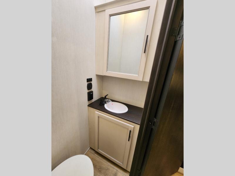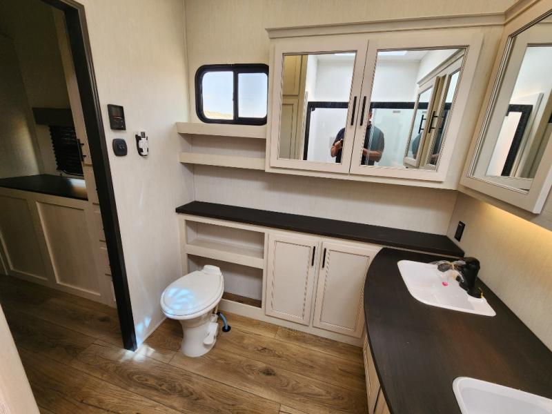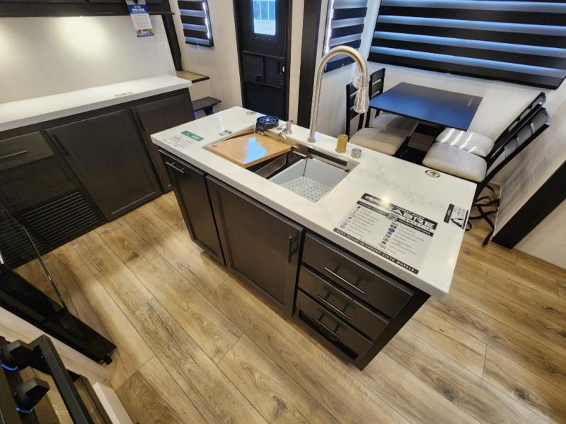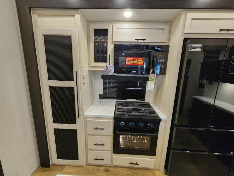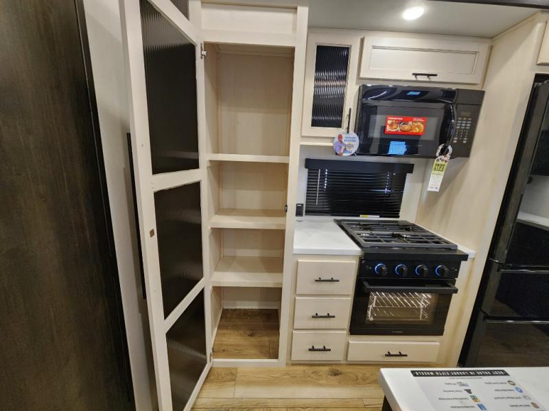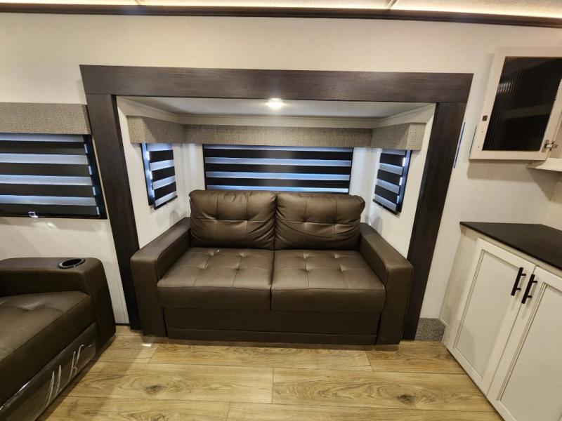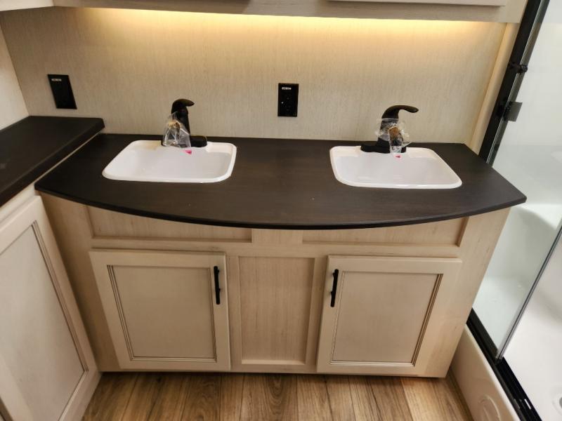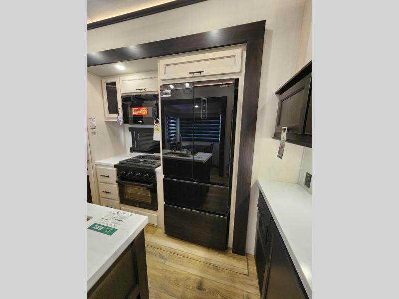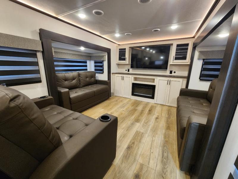 This Sabre fifth wheel with a full and half bath is sure to be a crowd pleaser! The front living area is the perfect place for everyone to visit each other comfortably on the two tri-fold sofas that can be transformed into extra sleeping spaces, or at the theater seating for complete relaxation. You will also find an entertainment center with a fireplace and a TV. This Sabre has a kitchen filled with convenient features, such as a residential size refrigerator, a kitchen island, and a kitchen pantry. The rear master suite has access to its very own full bathroom with a double-sink vanity for two to get ready at once, and a wardrobe with washer and dryer prep for convenience!