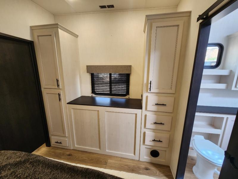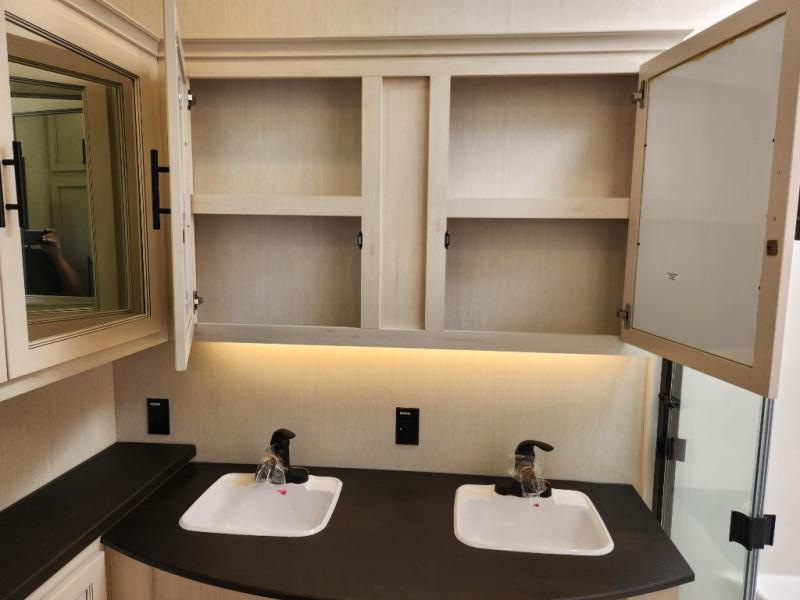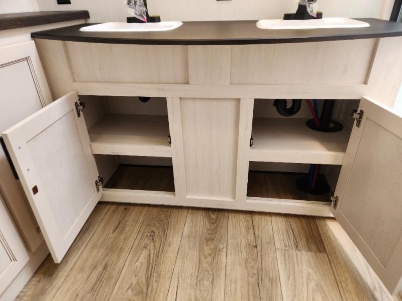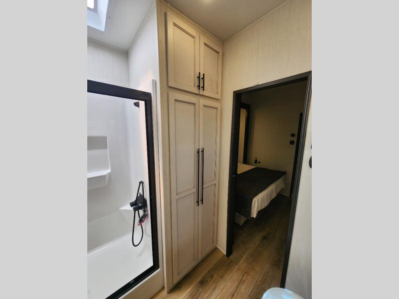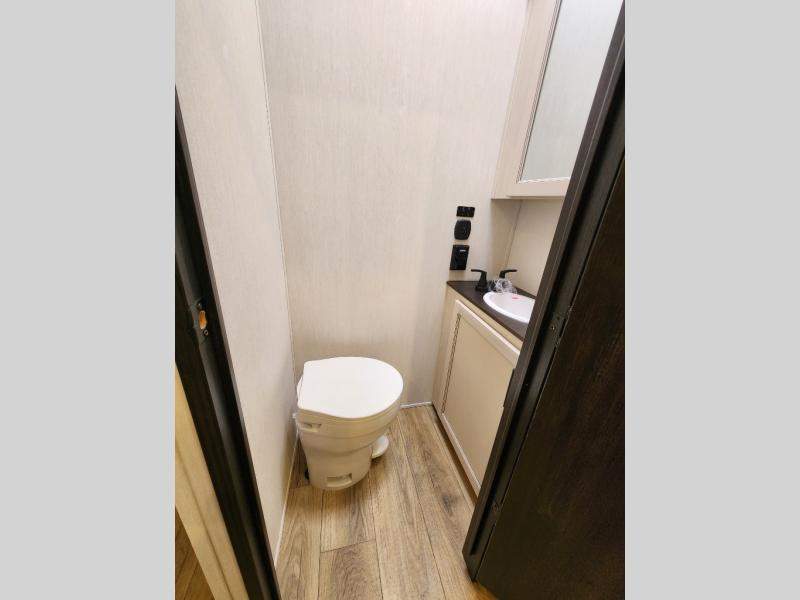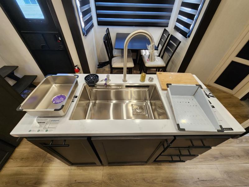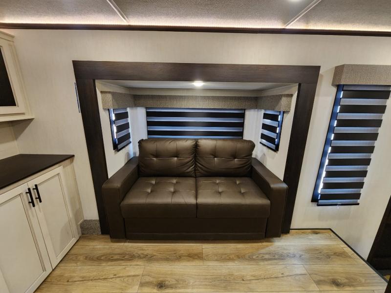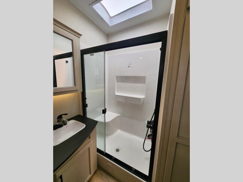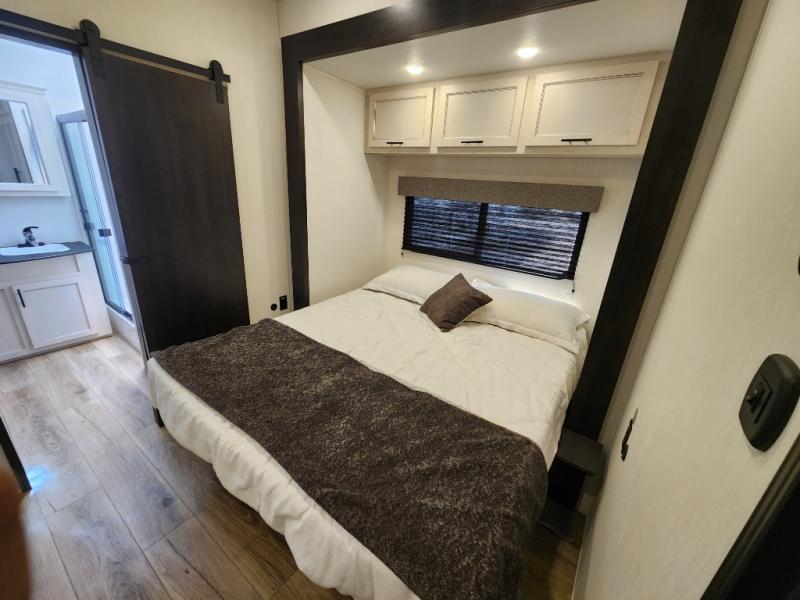 This Sabre fifth wheel with a full and half bath is sure to be a crowd pleaser! The front living area is the perfect place for everyone to visit each other comfortably on the two tri-fold sofas that can be transformed into extra sleeping spaces, or at the theater seating for complete relaxation. You will also find an entertainment center with a fireplace and a TV. This Sabre has a kitchen filled with convenient features, such as a residential size refrigerator, a kitchen island, and a kitchen pantry. The rear master suite has access to its very own full bathroom with a double-sink vanity for two to get ready at once, and a wardrobe with washer and dryer prep for convenience!
