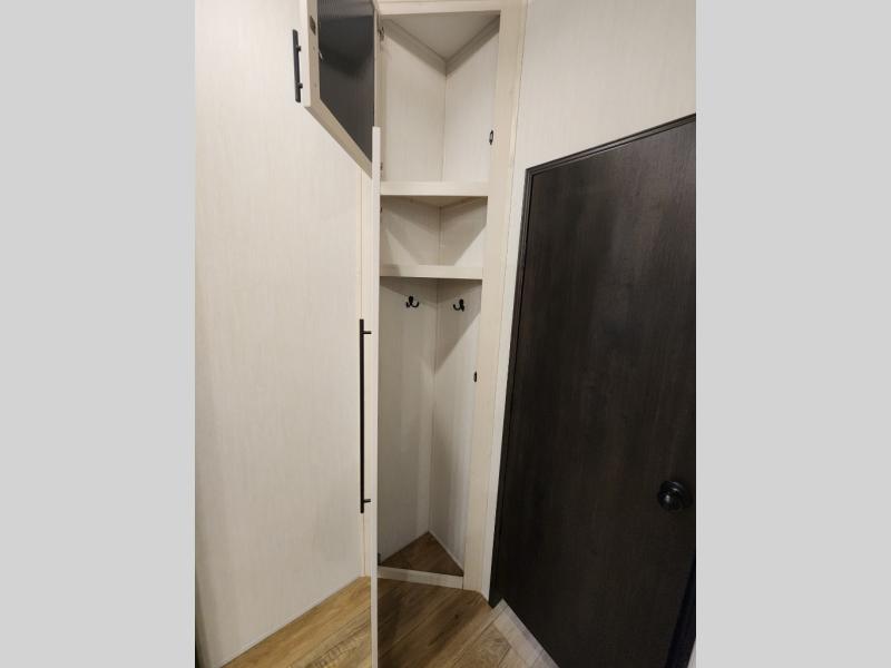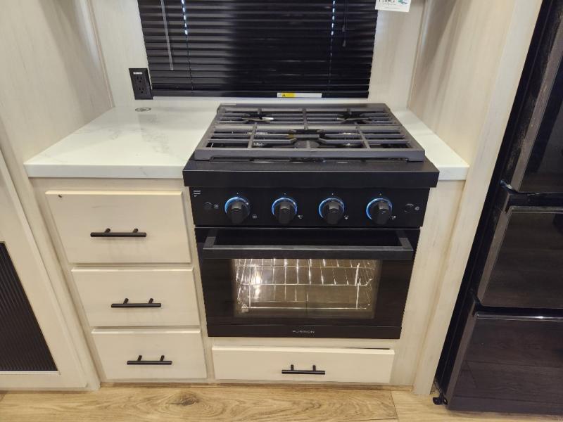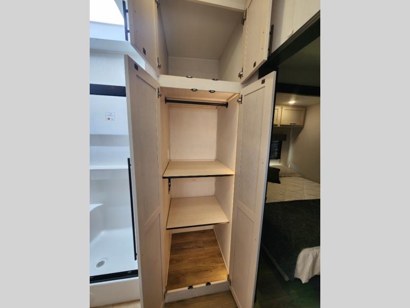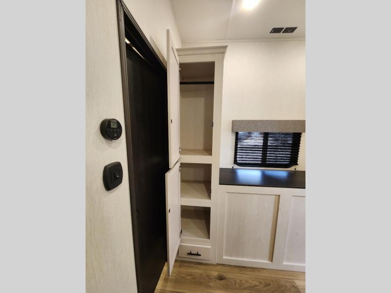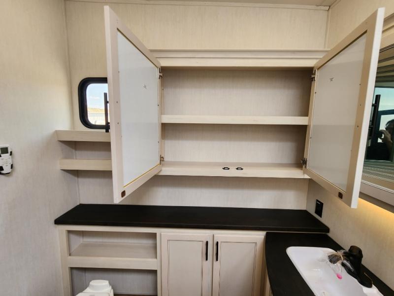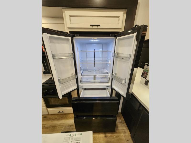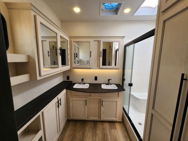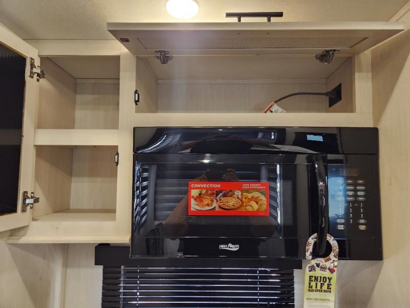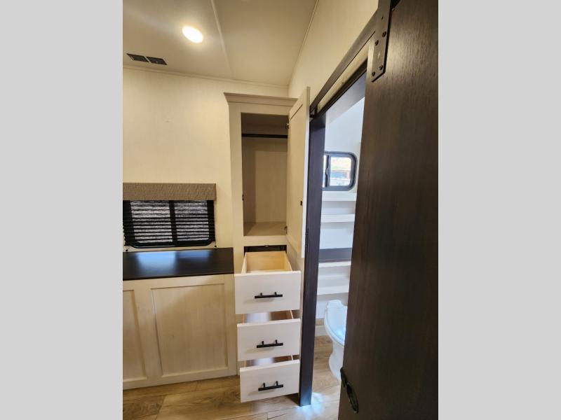 This Sabre fifth wheel with a full and half bath is sure to be a crowd pleaser! The front living area is the perfect place for everyone to visit each other comfortably on the two tri-fold sofas that can be transformed into extra sleeping spaces, or at the theater seating for complete relaxation. You will also find an entertainment center with a fireplace and a TV. This Sabre has a kitchen filled with convenient features, such as a residential size refrigerator, a kitchen island, and a kitchen pantry. The rear master suite has access to its very own full bathroom with a double-sink vanity for two to get ready at once, and a wardrobe with washer and dryer prep for convenience!