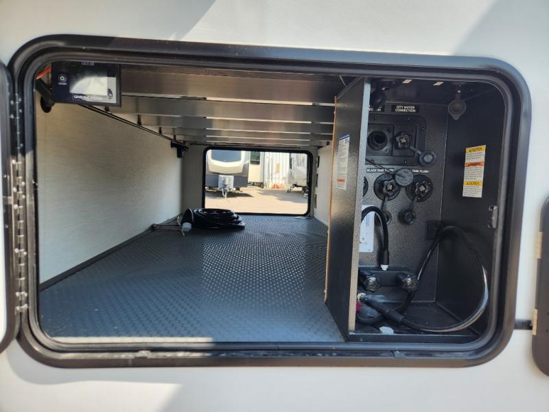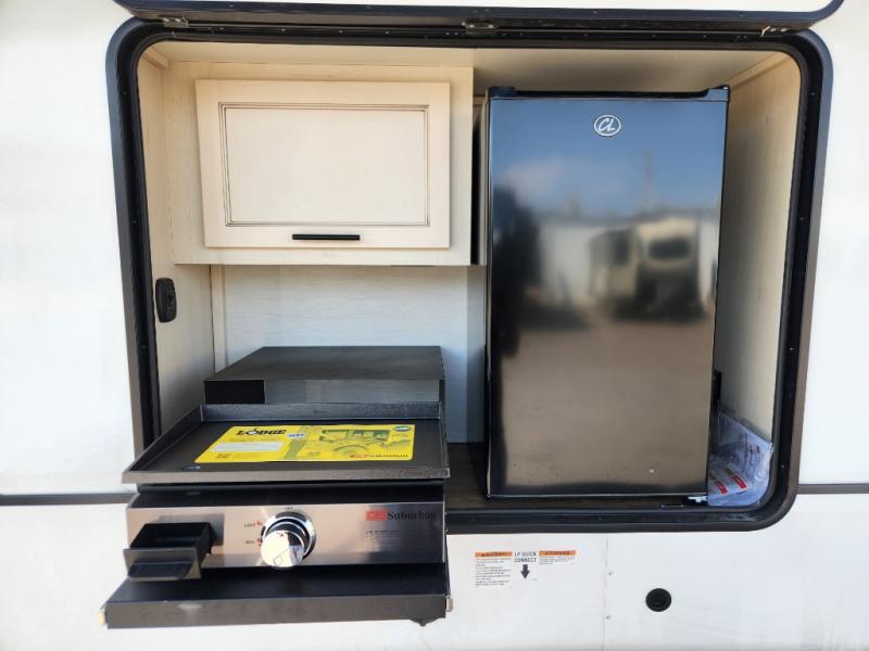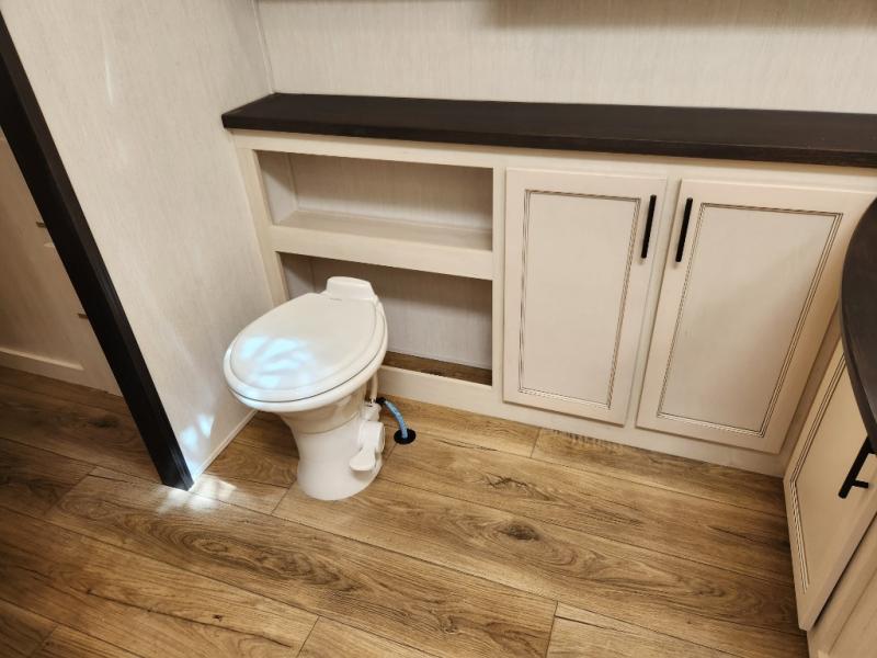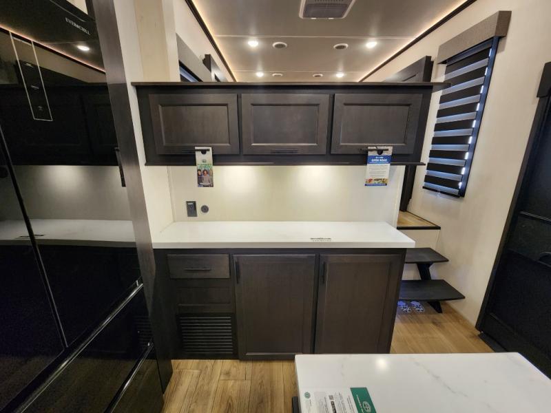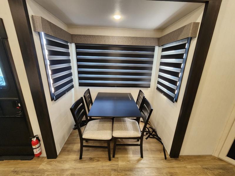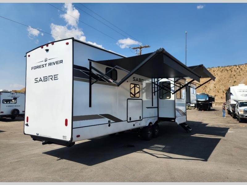 You will experience luxurious camping trips at an affordable price with any one of these Forest River Sabre fifth wheels! These models are durable and ready to travel anytime of the year thanks to features like the high-gloss gel-coat front cap with LED lighting, the PVC roof membrane, and the forced air underbelly with enclosed gate valves. The electric auto-leveling system makes setting up easy and safe, and the adjustable power awning with LED lighting will create an inviting outdoor living space. Each model includes a universal docking station which includes a black tank flush and an outside shower, and adjustable stable steps for you to enter and exit the unit safely. Inside, you will love the design of the ambient accent lighting in the living area, the real wood lumbercore cabinetry, and the linoleum flooring!