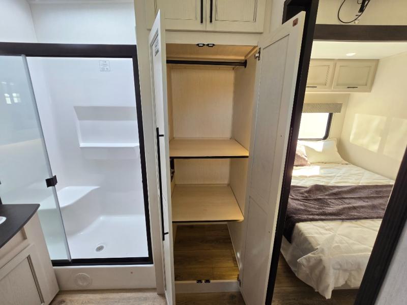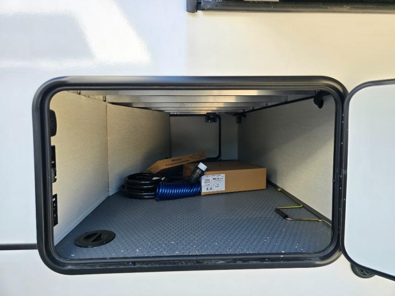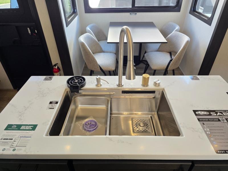 You will experience luxurious camping trips at an affordable price with any one of these Forest River Sabre fifth wheels! These models are durable and ready to travel anytime of the year thanks to features like the high-gloss gel-coat front cap with LED lighting, the PVC roof membrane, and the forced air underbelly with enclosed gate valves. The electric auto-leveling system makes setting up easy and safe, and the adjustable power awning with LED lighting will create an inviting outdoor living space. Each model includes a universal docking station which includes a black tank flush and an outside shower, and adjustable stable steps for you to enter and exit the unit safely. Inside, you will love the design of the ambient accent lighting in the living area, the real wood lumbercore cabinetry, and the linoleum flooring!