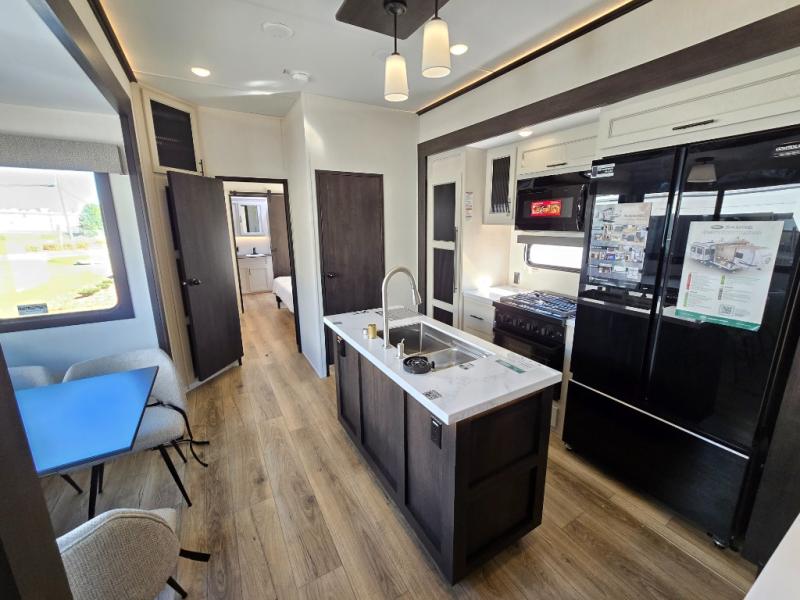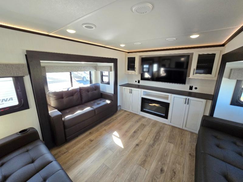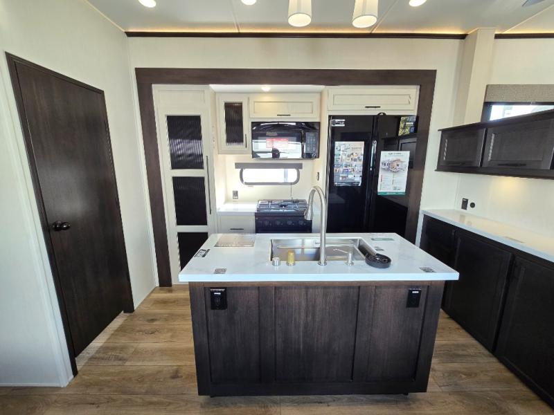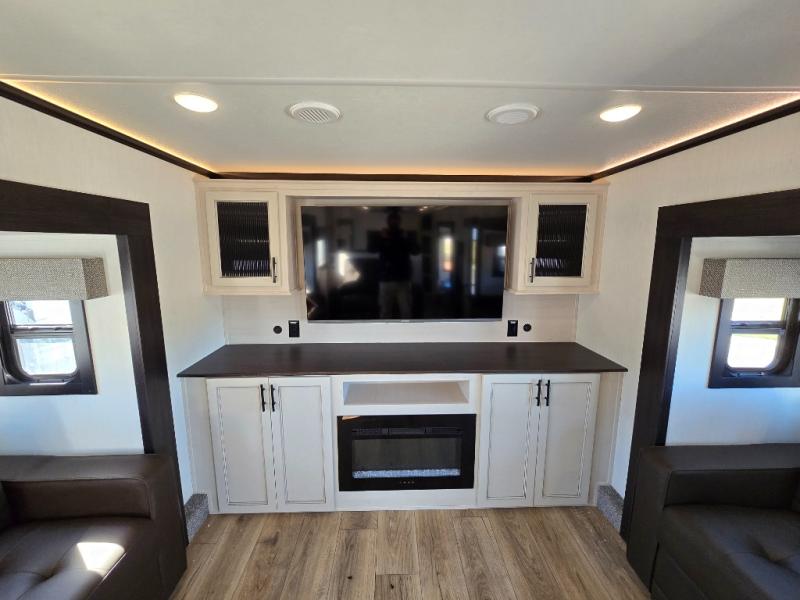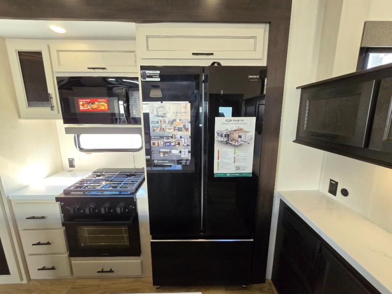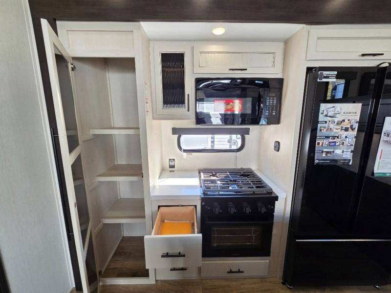 This Sabre fifth wheel with a full and half bath is sure to be a crowd pleaser! The front living area is the perfect place for everyone to visit each other comfortably on the two tri-fold sofas that can be transformed into extra sleeping spaces, or at the theater seating for complete relaxation. You will also find an entertainment center with a fireplace and a TV. This Sabre has a kitchen filled with convenient features, such as a residential size refrigerator, a kitchen island, and a kitchen pantry. The rear master suite has access to its very own full bathroom with a double-sink vanity for two to get ready at once, and a wardrobe with washer and dryer prep for convenience!