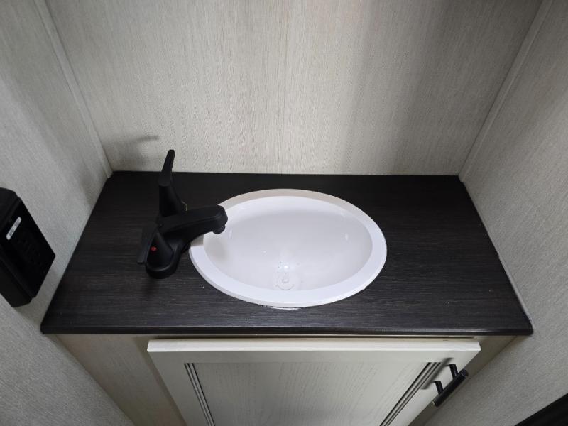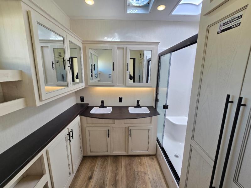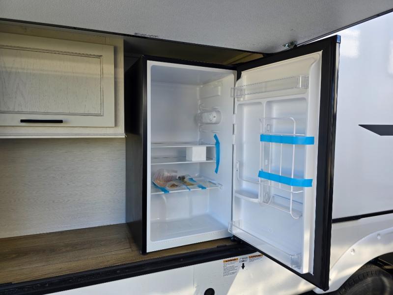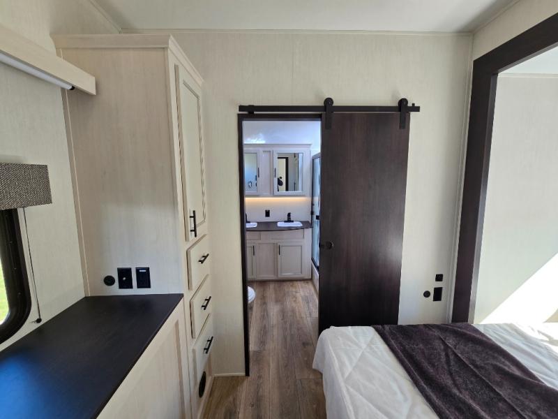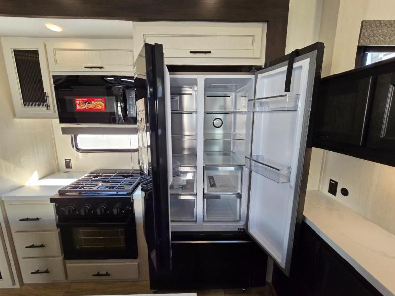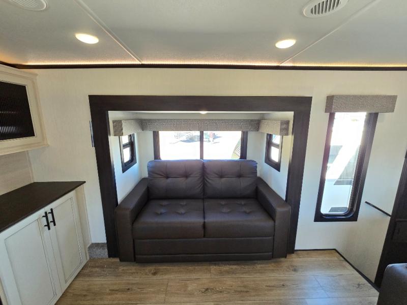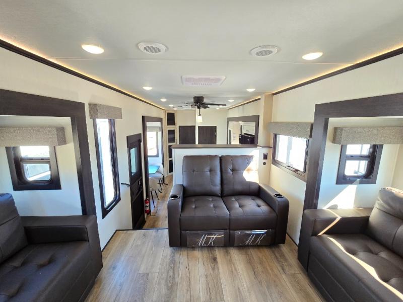 This Sabre fifth wheel with a full and half bath is sure to be a crowd pleaser! The front living area is the perfect place for everyone to visit each other comfortably on the two tri-fold sofas that can be transformed into extra sleeping spaces, or at the theater seating for complete relaxation. You will also find an entertainment center with a fireplace and a TV. This Sabre has a kitchen filled with convenient features, such as a residential size refrigerator, a kitchen island, and a kitchen pantry. The rear master suite has access to its very own full bathroom with a double-sink vanity for two to get ready at once, and a wardrobe with washer and dryer prep for convenience!