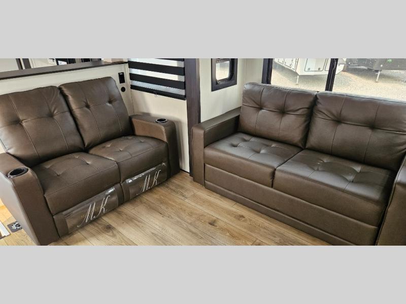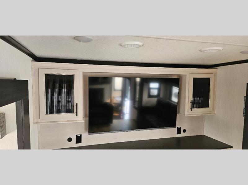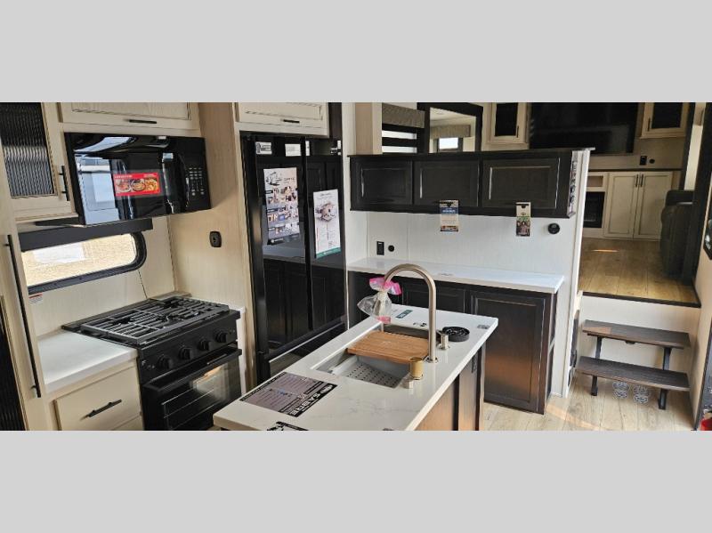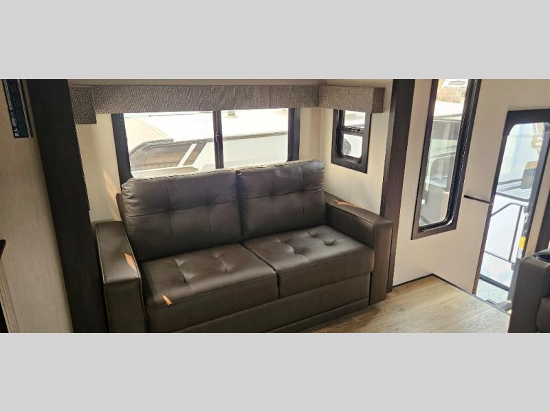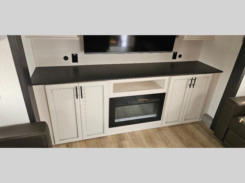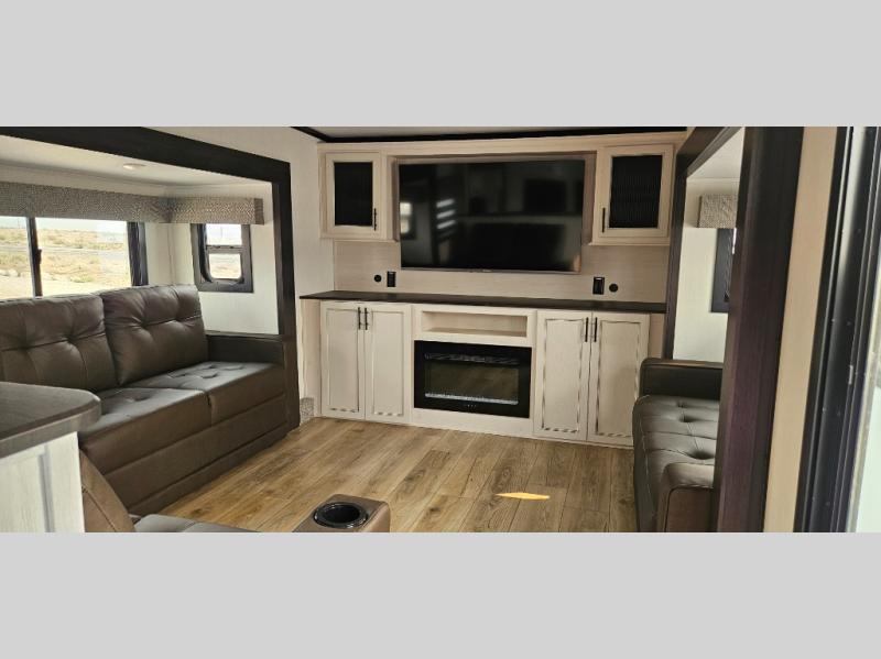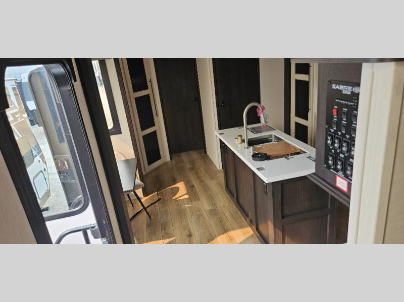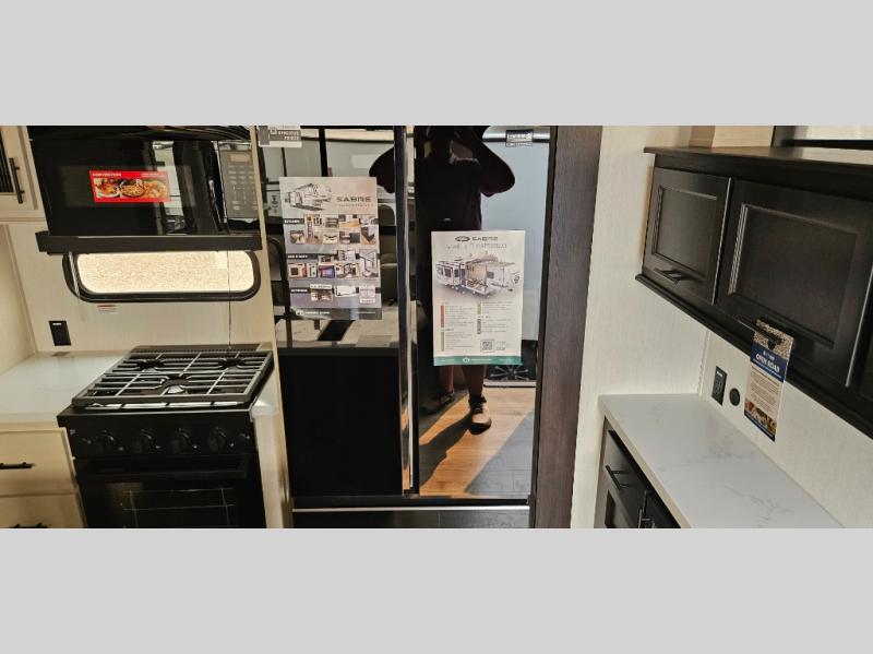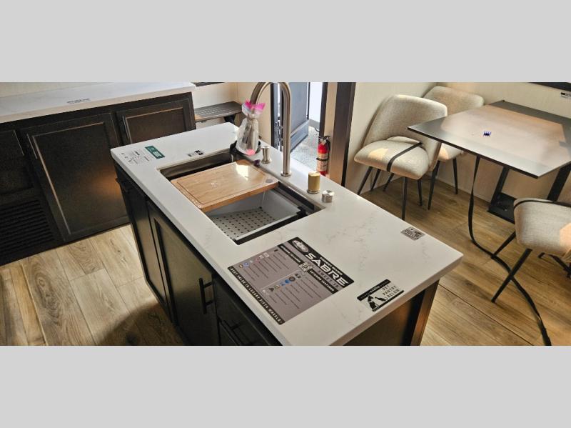 This Sabre fifth wheel with a full and half bath is sure to be a crowd pleaser! The front living area is the perfect place for everyone to visit each other comfortably on the two tri-fold sofas that can be transformed into extra sleeping spaces, or at the theater seating for complete relaxation. You will also find an entertainment center with a fireplace and a TV. This Sabre has a kitchen filled with convenient features, such as a residential size refrigerator, a kitchen island, and a kitchen pantry. The rear master suite has access to its very own full bathroom with a double-sink vanity for two to get ready at once, and a wardrobe with washer and dryer prep for convenience!