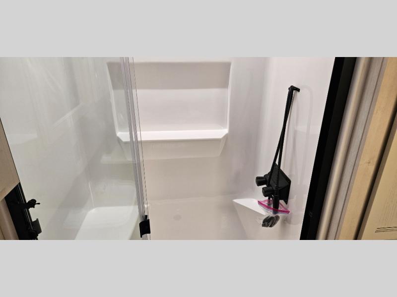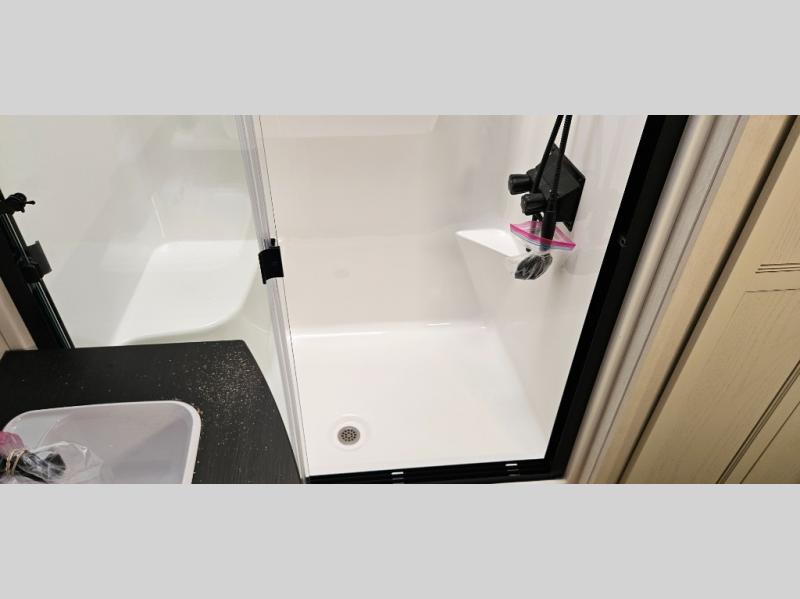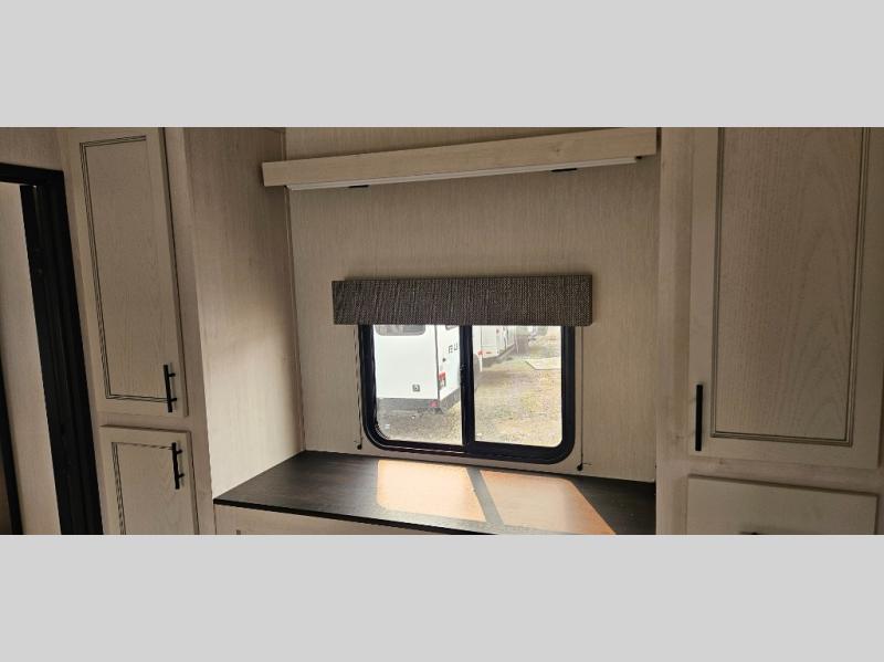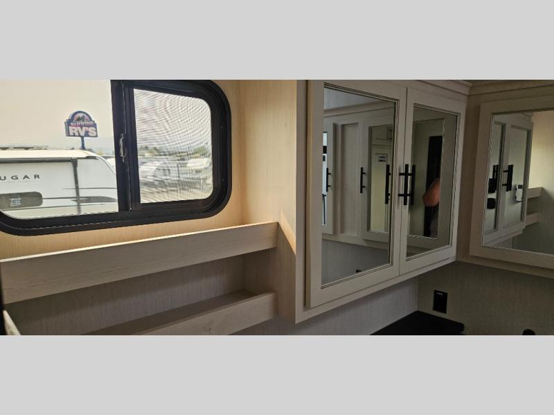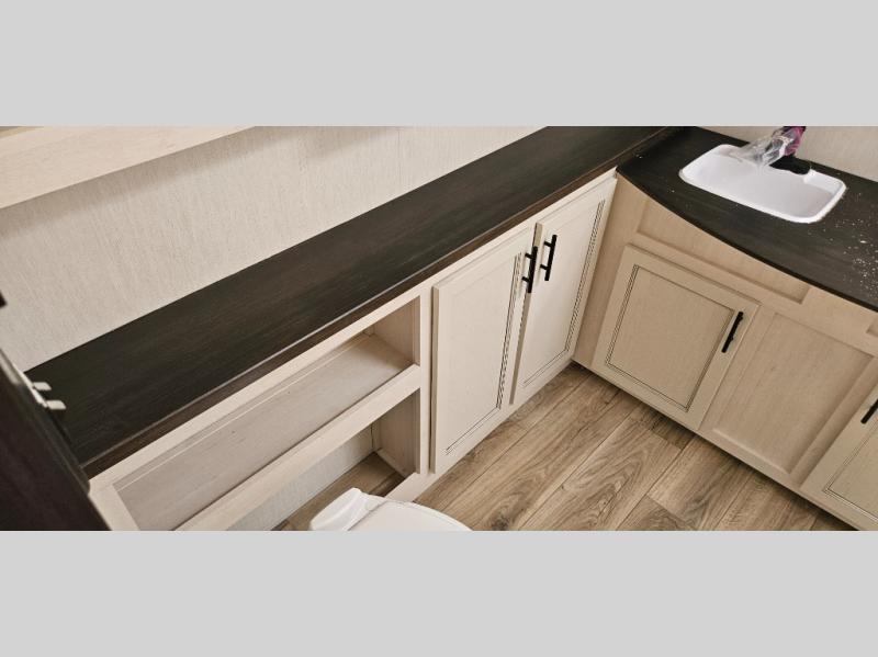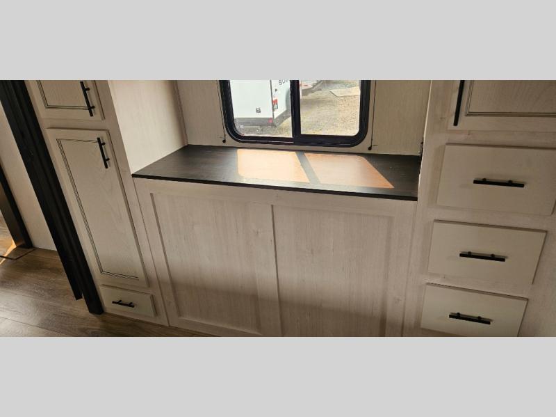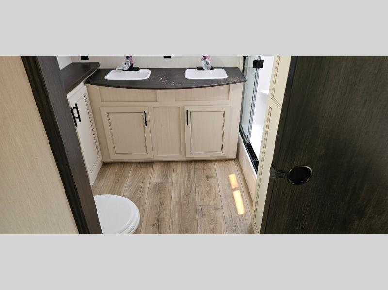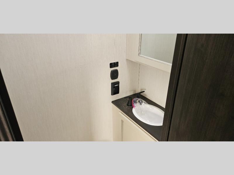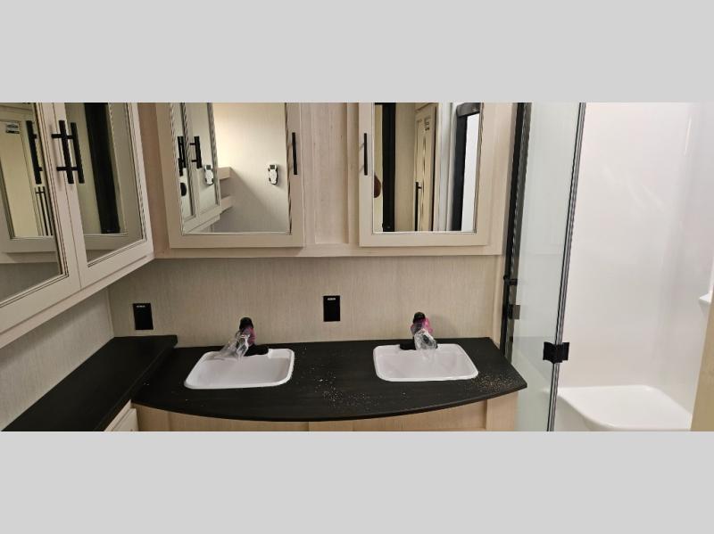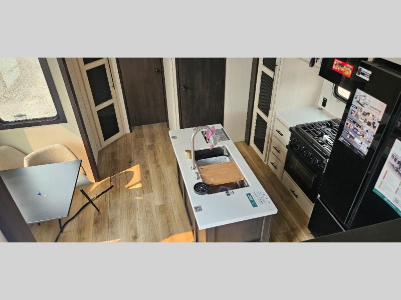 This Sabre fifth wheel with a full and half bath is sure to be a crowd pleaser! The front living area is the perfect place for everyone to visit each other comfortably on the two tri-fold sofas that can be transformed into extra sleeping spaces, or at the theater seating for complete relaxation. You will also find an entertainment center with a fireplace and a TV. This Sabre has a kitchen filled with convenient features, such as a residential size refrigerator, a kitchen island, and a kitchen pantry. The rear master suite has access to its very own full bathroom with a double-sink vanity for two to get ready at once, and a wardrobe with washer and dryer prep for convenience!