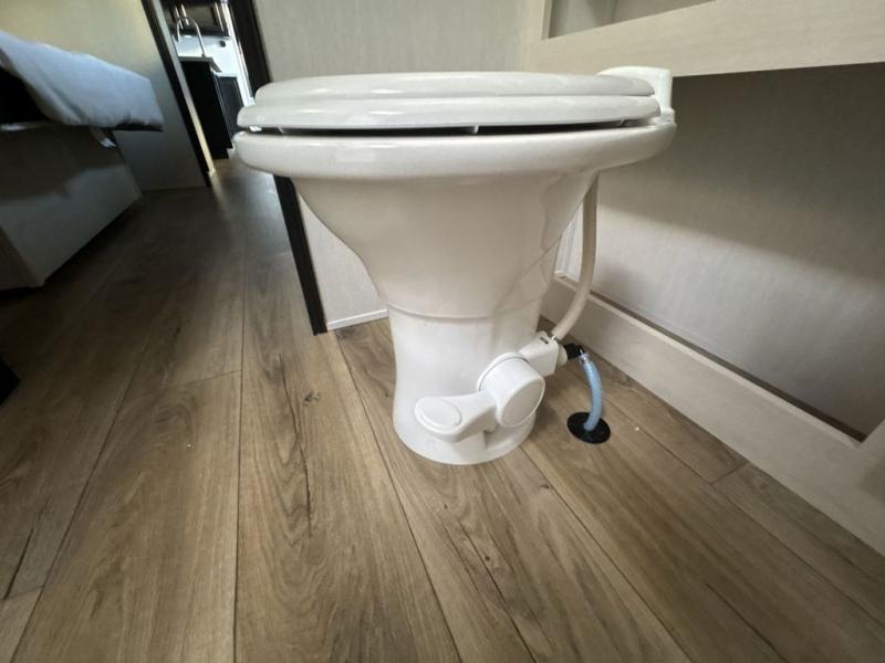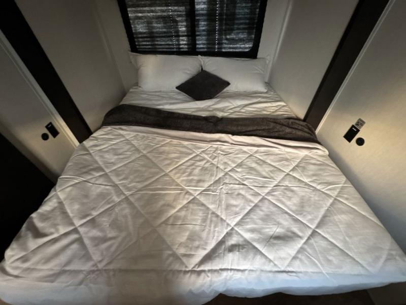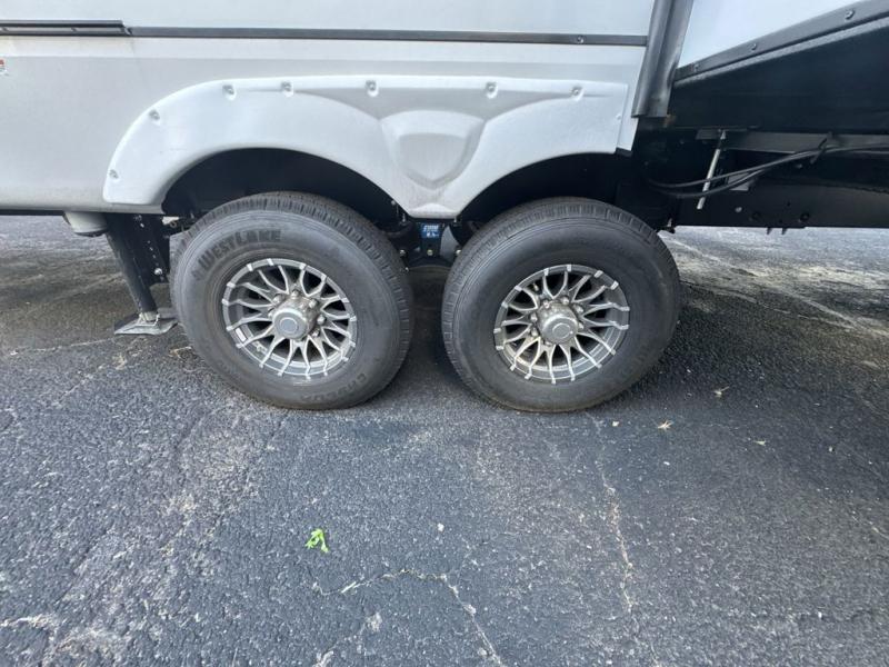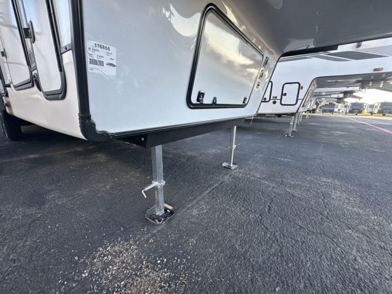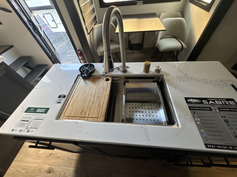 You will experience luxurious camping trips at an affordable price with any one of these Forest River Sabre fifth wheels! These models are durable and ready to travel anytime of the year thanks to features like the high-gloss gel-coat front cap with LED lighting, the PVC roof membrane, and the forced air underbelly with enclosed gate valves. The electric auto-leveling system makes setting up easy and safe, and the adjustable power awning with LED lighting will create an inviting outdoor living space. Each model includes a universal docking station which includes a black tank flush and an outside shower, and adjustable stable steps for you to enter and exit the unit safely. Inside, you will love the design of the ambient accent lighting in the living area, the real wood lumbercore cabinetry, and the linoleum flooring!